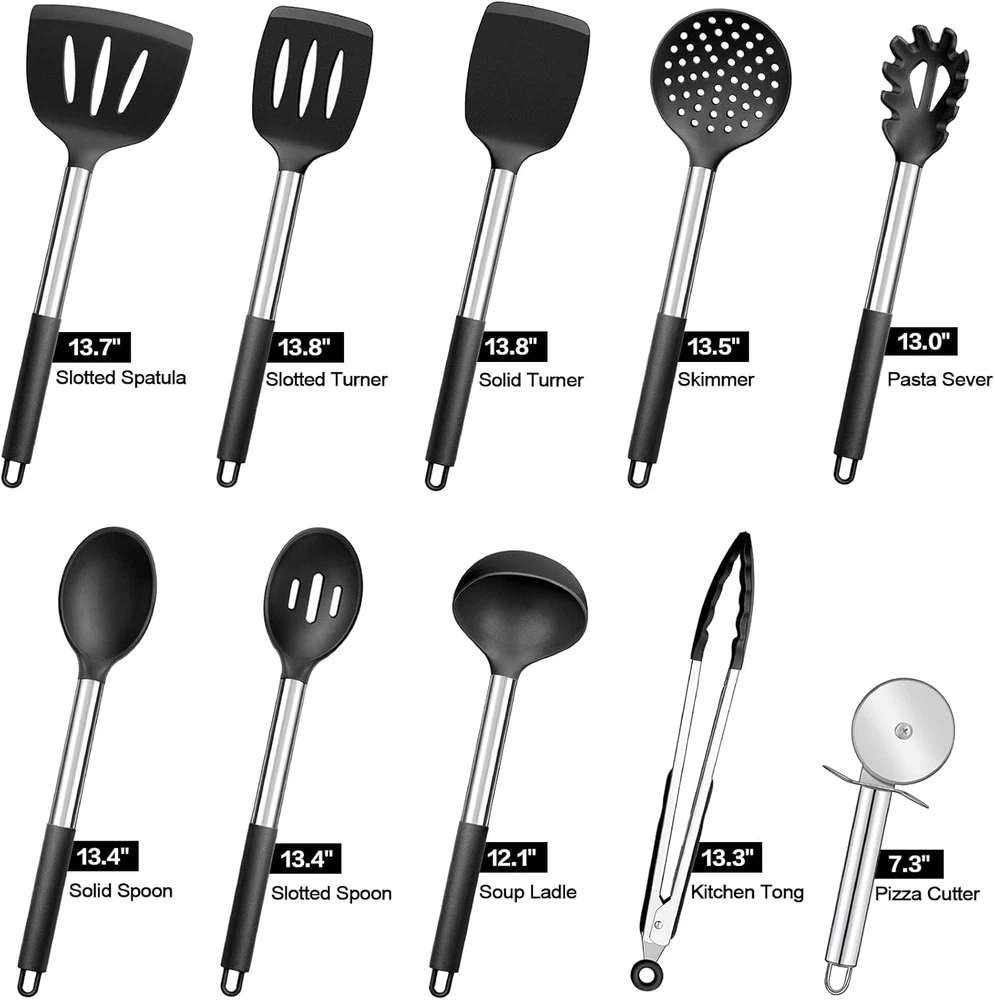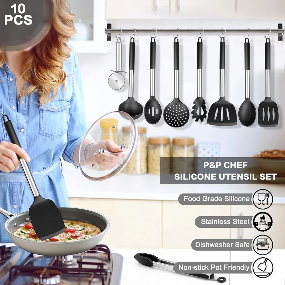【VERSATILE 10 PCS】 P&P CHEF Kitchen Utensils Set is perfectly fit for various purposes, Include: ●Slotted Spatula, ●Slotted Turner, ●Solid Turner, ●Skimmer, ●Pasta Server, ●Solid Spoon, ●Slotted Spoon, ●Soup Ladle, ●Kitchen Tong, ●Pizza Cutter, This set will bring you excellent using experience 【HEATPROOF MATERIAL】 Our cooking utensils are made of food grade silicone, Will not get musty or produce peculiar smell, Be the greatest replacement for wooden/ plastic cookware, Built to withstand the heat up to 450℉, You can rest assured that it will not melt, warp, discolor or release any toxic substances into your food, Definitely safe and healthy to the human body 【DURABLE &FLEXIBLE】 Featured with heavy gauge stainless steel handle, One-piece seamless design keep it sturdy, Will not break off or fall apart when using, Rust-free and Durable to last for a long service life, Flexible and soft spatula head is great to flip, stir, scrape and fold the most kinds of food without scratching your coated cookware 【EASY USE】 Sturdy handle wrapped in velvety silicone for heat and skid proof grasp, Smooth edge without sharp angles, Prevent cutting you hand, All the utensils are dishwasher safe, Non-stick and stain-resistant attributes make hand-wash in a breeze Big holes at the end of the handles for easily hanging on the kitchen wall 【ECONOMICAL SET】 Save a lot of money than buying them separately, Whether cooking sautéing, stirring or scraping, This utensil set will cater all your needs with their different feature, Best gift idea - Classic color set with a good-looking packaging box, for both aesthetics and practicality, A Ideal present for your friends Product Description P&P CHEF Kitchen Utensils Set of 10 is made of food grade silicone and stainless steel, Will not have any harmful substance into your food, Rust-free and Durable to last for a long service life. Have high-strength flexibility, Corrosion and heat resistance, Bringing you a healthier cooking experience. The 10-Piece cooking utensils will meet all your needs, such as cooking/ serving/ mixing/ preparing, etc. Perfect kitchen tools for your everyday cooking. WARM TIPS: ✔ Please Do Not rub them with a sharp metal. ✔ Please Do Not Directly Flame Fire on the Utensil. ✔ Please don't leave them in the sun for a long time. ✔ Please wash with soft dishcloth in warm, soapy water. ✔ Please dry them after washing, Store in dry place for their durability. SPECIFICATION: Material: Silicone, Stainless Steel Color: Black PACKAGE INCLUDE: ● Slotted Spatula ● Slotted Turner ● Solid Turner ● Skimmer ● Pasta Server ● Solid Spoon ● Slotted Spoon ● Soup Ladle ● Kitchen Tong ● Pizza Cutter ADVANTAGES: Certified Quality - Free from harmful substances, Healthier for daily cooking, Better than typical plastic/ wooden utensils. Dishwasher safe - Dishwasher safe without taking your valuable time, Also easily clean up by hand-wash. Easy Storage - Big hole at the end of the handle, Easy to hang on the kitchen wall, convenient to save storage space and get them when you need.