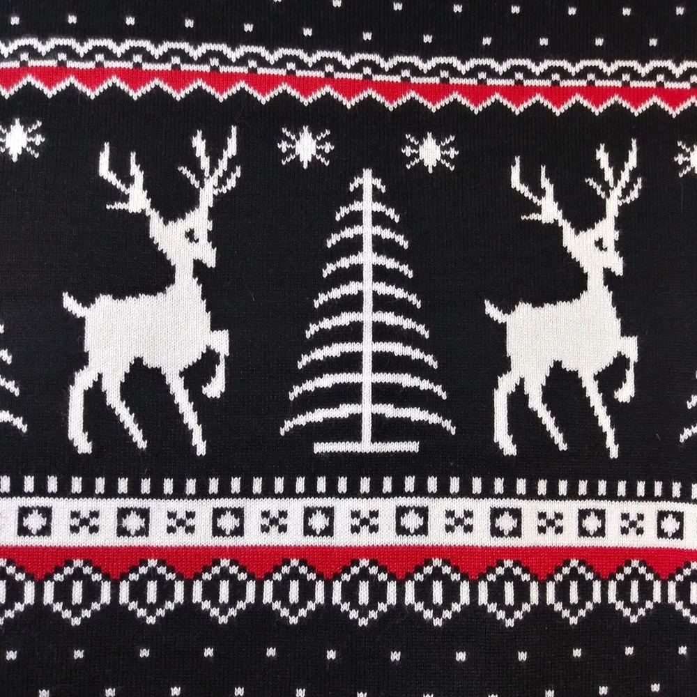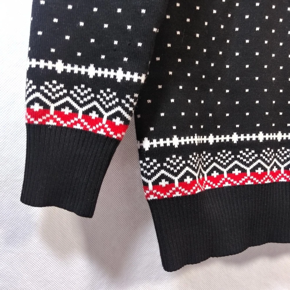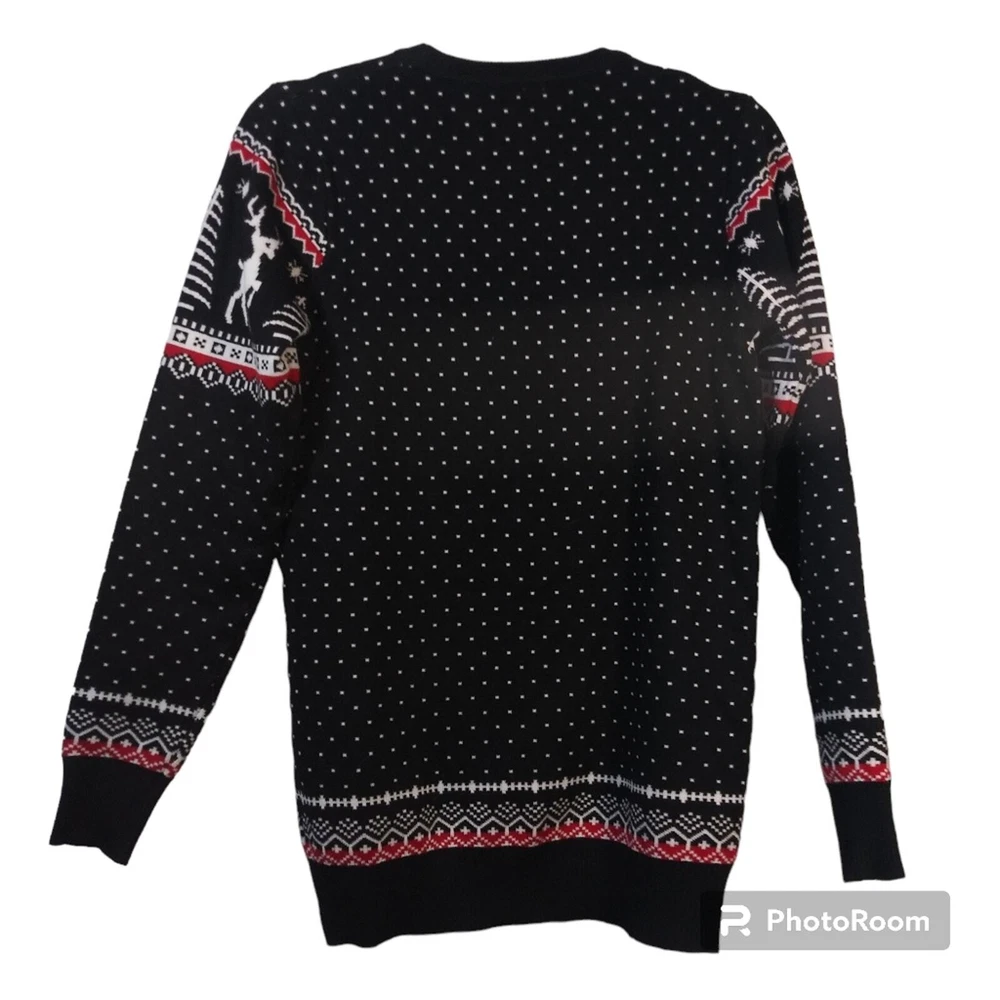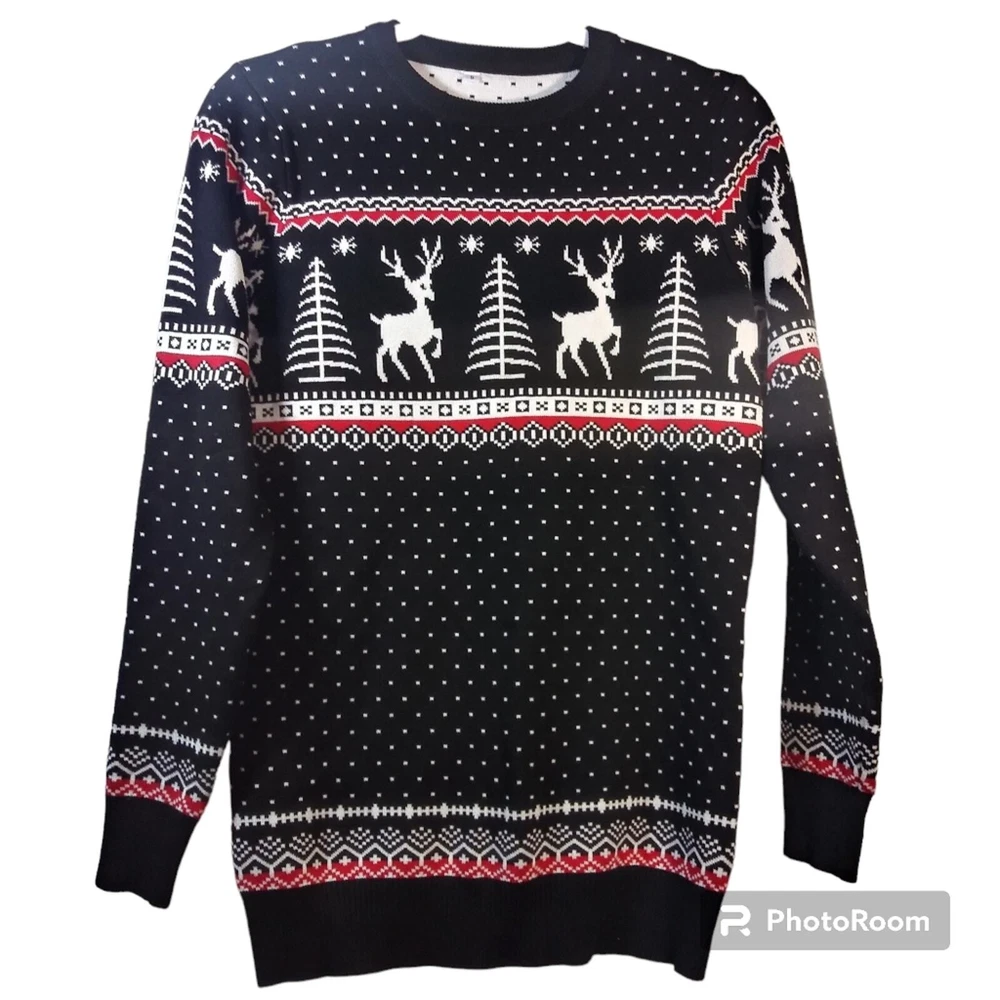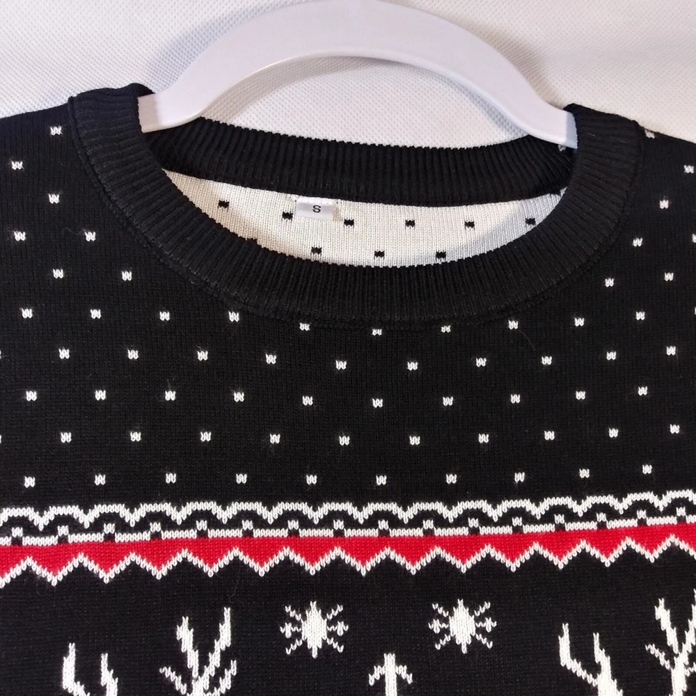 Black Knit Reindeer Tree Snowflake Ugly Holiday Christmas Sweater Size Small A cute,cozy and gentle to skin Christmas sweaters made of 70% cotton and 30% acrylic that wards off the winter chill while giving off cozy holiday style vibes sets a festive tone. Classic Festival Sweater: Fair isle style novelty sweaters Christmas patterns including reindeer,snowflakes and tree Like new Unbranded approximate measurements pit to pit 17" length 27"