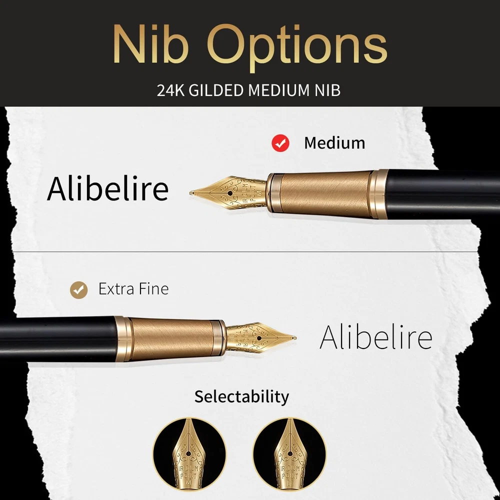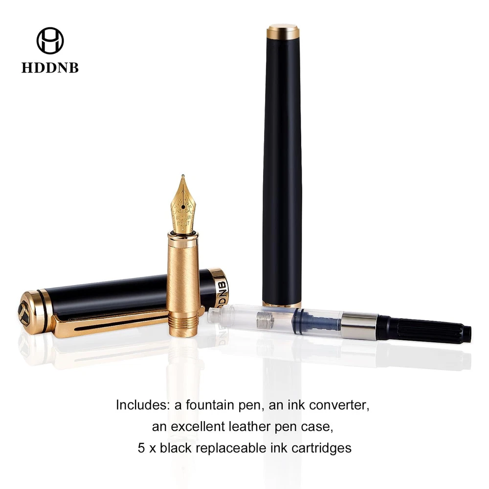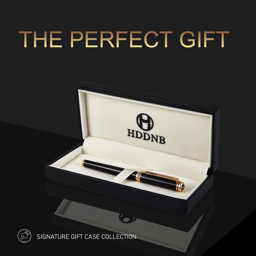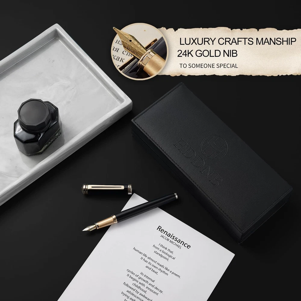 Luxury Fountain Pen Sets for Men and Women with Gift Box, 24K Gold Finish and Gilded Nib with 5 Black Ink Cartridges and Converter ✒Elegant Design - This metal fountain pen stands out with its exquisite and elegant design. The nib and a portion of the pen body are meticulously plated with stunning 24K gold, each detail exudes a sense of understated luxury. ✒Smooth Writing - Our pens use the latest Germany ink supply technology, giving you a long-lasting and smooth writing experience. Whether it is used to sign important documents or write daily notes, this fountain pen can add a touch of elegance to your every writing. ✒Luxurious Gift - This fountain pen set is packaged in a luxurious leather gift box. The exquisite appearance design is suitable for Christmas, Father's Day, Mother's Day, Valentine's Day, Thanksgiving Day,anniversaries or friends' birthdays, etc. ✒All-Inclusive Set- This set includes everything you need, a fountain pen, converter, 5 black ink cartridges and one leather box, each gift box contains an instruction card, which can be used without worries. ✒Customer Service - As a global brand, we provide excellent after-sales service for our products. If you have any questions, please feel free to contact us, we will solve it until you are satisfied.