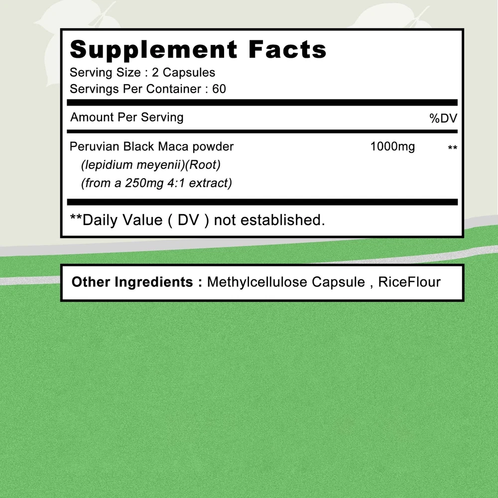 Effects: Testosterone Booster, Energy & Endurance Ingredients: Black Maca Directions: Take 2 capsules once daily after a meal. Shipping: Ships within 48 hours on working days. Shelf life: 2 years Description: Maximum Strength Black Maca: Black Maca is an herb native to the Andes Mountains of Peru. Peruvian Black Maca is superior to other forms of Maca because it contains more concentrated nutrients and is rich in metabolites and minerals. PREMIUM BLACK MACA: Black Maca helps increase energy, endurance and performance. Also aids in natural testosterone production. Supports muscle building and athletic performance, helps balance and maintain normal mood, and promotes mental focus and clarity. Our capsules are produced in a GMP certified facility and are third-party lab tested. All natural, non-GMO, vegetarian and contains no unnecessary fillers or binders. Document