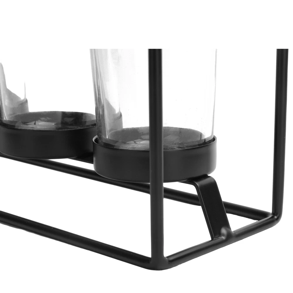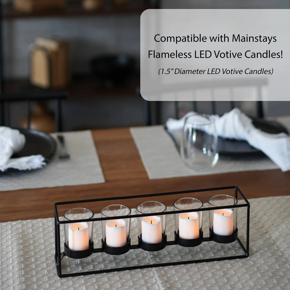 Material: Metal/Glass Care: Wipe clean with soft, dry cloth Country of Origin: Imported Dimensions: 13.86” W x 3.86” D x 3.86” H Holds: 5 tealight or votive candles (sold separately) Features: Black satin finish Recommended for: Indoor use Warning! Never burn a candle completely and dispose of it when it burns to within 1/2” of its base or the holder. Never leave a burning candle unattended.