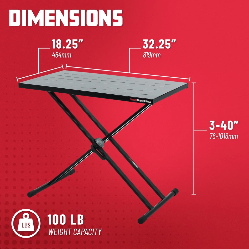 The ’ Utility Table Top is perfect for, but not limited to, keyboard players, DJs, and electronic musicians. The GFW-UTL-XSTDTBLTOP can transform any standard X Style keyboard stand into a multi-use, flat surface furnishing a space up to 32.3” long by 18.3” wide for any large or small items. The sturdy steel construction with 1” square tube frame provides a secure durable platform that will support up to 150 pounds. Under the tray, two sets of steel tubing are spaced to allow fit for various X Style stands and provides two options of height depending on how the X stand is setup. A pattern of elongated perforations along the entire surface of the tray keep it lightweight and stylish but more importantly promotes air circulation and proper ventilation for utilizing with electronics. The GFW-UTL- XSTDTBLTOP can be purchased alone or can also be purchased as a set with a X Style stand. Combo set with utility table top and “X” style keyboard stand included |Perfect for Keyboard Players, DJs, Electronic Musicians and more Flat surface to hold both bigger and smaller items that a standard “X” stand would not support | 150 lb total Weight Capacity Heavy-duty steel construction with black powder coated finish | 1” Steel tube frame with thick 1.5mm / 16 ga. steel tabletop surface Stand adjusts up to 40” in height for use while sitting or standing | Tray is made of perforated steel to keep it lightweight and promote air circulation Double Braced X Stand with Cam operated cast aluminum height adjustment on stand allows secure & stable operation at a variety of positions
