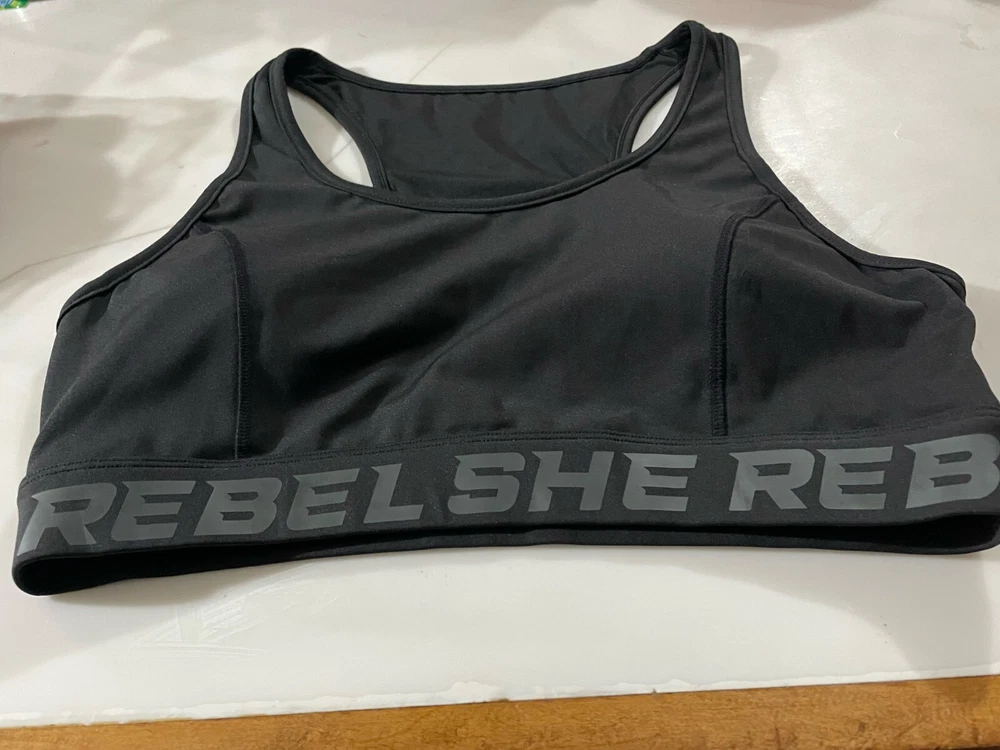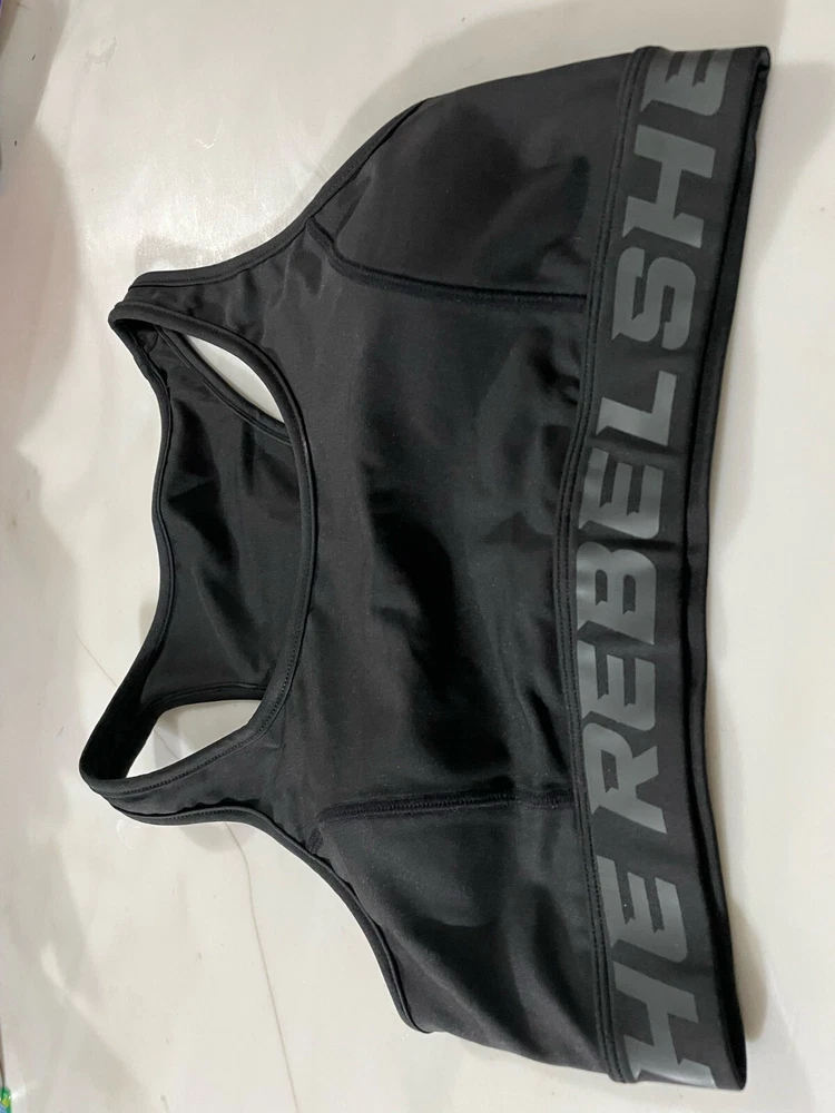 *NOTE: This sports bra is a misprint/irregular. The lettering on the sports bra is misprint due to manufacturing error on a small quantity of these premium quality sports bras. The sports bra, otherwise, has no defects, and is of great quality. Only a limited quantity of these bras is available & are bargain priced at only $2.99 plus shipping! ABOUT Achieve ultimate comfort and support with our She Rebel Brand Label Sports Bra! Its breathable, moisture-wicking and quick-dry fabric provides a cool and snug feel during any activity--all while allowing free range of motion. Not to mention the beautiful design and compressive fit, with extra support in the shoulders and a snug hem to keep the bounce factor to a minimum. Plus, the luxurious, buttery soft, eco-friendly recycled fabric guarantees comfort you won't want to take off! DETAILS Racerback style Comfortable, breathable Moisture wicking & quick drying Moderate compressive fit Eco-friendly, recycled fabric Fade free/bleed free material Snug bra hem keeps the bounce factor to a minimum. Colorful logo on back shoulder blade area Free range of movement/good stretch retention Made of 75% polyester/25% spandex fabric blend CARE INSTRUCTIONS This sports bra can be conveniently hand washed and hung dry; do not machine wash; do not tumble dry; do not iron; do not bleach. SIZE & FIT This sports bra fits true to size. See Size Chart to determine your best fit. Size Chart Size Bust Rib Cage XSmall 29-32" 22-27" Small 31-37" 25-32" Medium 34-38" 26-33.5" Large 36-41" 29-36" 1XL 38-43" 31-38" 2XL 41-46" 32-40" 3XL 44-48" 35.5-43" 4XL 46-50" 37.5-44" 5XL 49-53" 37-47.5" 6XL 51-55" 38.5-49.5" RETURN POLICY This item is non-returnable and non-refundable. Final clearance price.