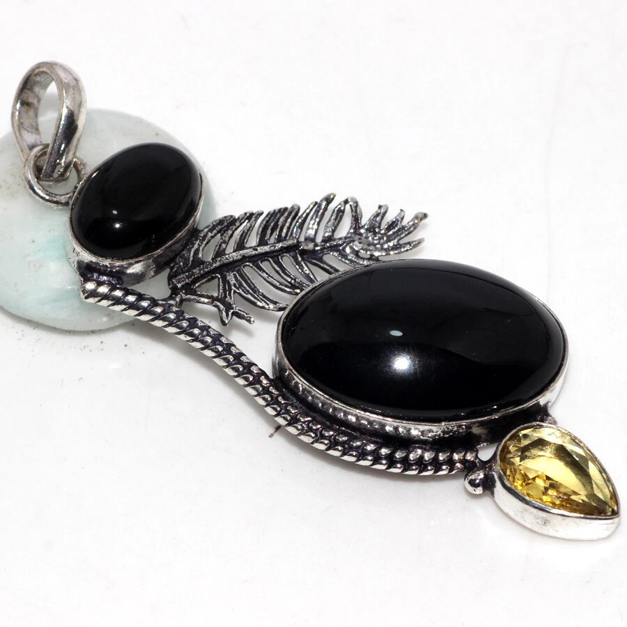 Black Onyx Citrine 925 Silver Plated Gemstone Pendant 3" Aesthetic Jewellery JW