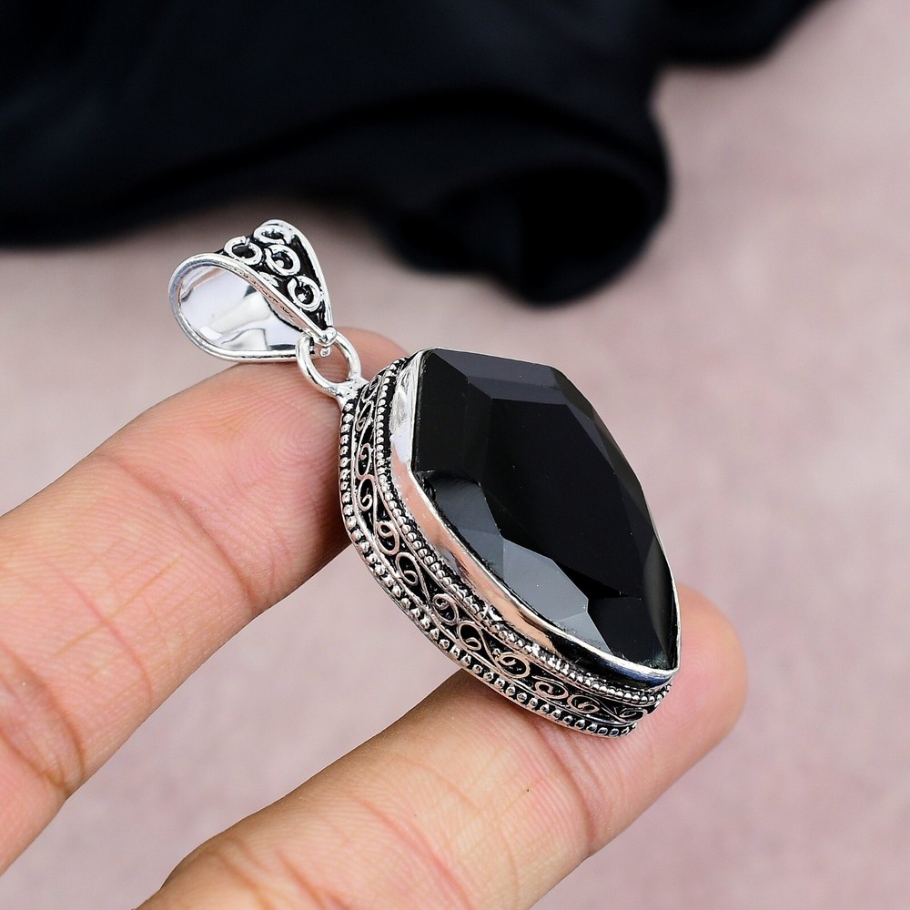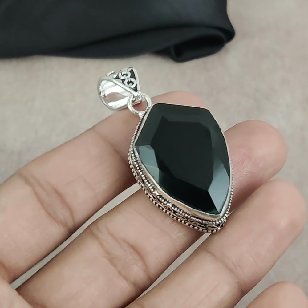 Pendant Shape:Same As PictureMaterial:GemstoneClosure:Same As PictureMetal:Sterling SilverMain Stone Treatment:Not EnhancedCut Grade:N/AColor:SilverMain Stone:Black OnyxBrand:HandmadeMetal Purity:925Theme:Beauty, Bohemian, Ethnic, Halloween, Love, NatureNumber of Gemstones:1Secondary Stone:N/AColored Diamond Intensity:N/ACountry of Origin:IndiaDiamond Color Grade:N/AMain Stone Shape:Same As PictureTotal Carat Weight:10 carat and aboveMain Stone Creation:NaturalCountry/Region of Manufacture:IndiaNecklace Length:5.3"Collection:HandmadeDiamond Clarity Grade:N/AType:PendantFeatures:HandmadeOccasion:Anniversary, Birthday, Christening, Christmas, Engagement, Father's Day, Graduation, Mother's Day, Valentine's Day, WeddingMain Stone Color:BlackPendant/Locket Type:Same As PictureStyle:PendantBase Metal:Sterling SilverNumber of Diamonds:N/ASetting Style:BezelCertification:N/AChain Type:N/A