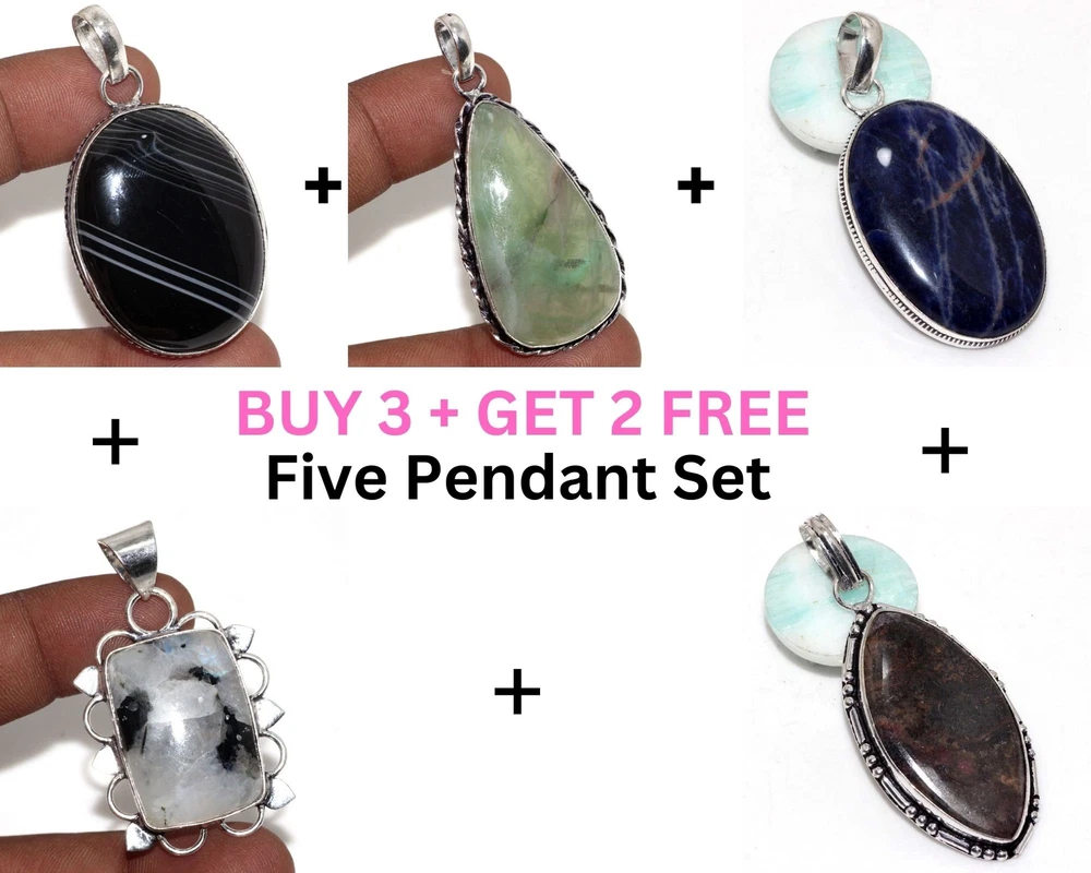 Main Stone Shape: AS Seen in Picture Type: Five Pendant Set Wholesale: As your Request MPN: ED6298-6299-63275-6337-63475 Handmade: YES Material: Stone Shape: AS Seen in Picture Main Stone Treatment: Not Enhanced Base Metal: Copper Main Stone Color: As Seen in Picture Theme: Ethnic Era: Undated Metal: Copper Alloy Occasion: Wedding Gifts, Valentine's Gift, Mother's Day, Christmas Band Width: Band Width Brand: HANDMADE Customized: No Personalize: No Size: 2|2|2|2|2.4 Sizable: Yes Secondary Stone: Moonstone,Rhodonite Cut Grade: Excellent gtin13: does not apply Features: Silver Plated Country of Origin: India Color: AS SEEN IN PICTURE Setting Style: collet setting Metal Purity: Unknown Style: New Main Stone: Black Onyx,Fluorite,Sodalite Number of Gemstones: AS Seen in Picture UPC: does not apply Country/Region of Manufacture: India Antique: NO Item Length: 2|2|2|2|2.4 Main Stone Creation: Natural