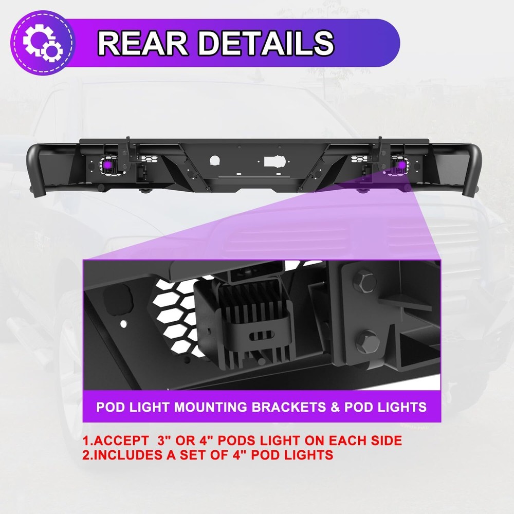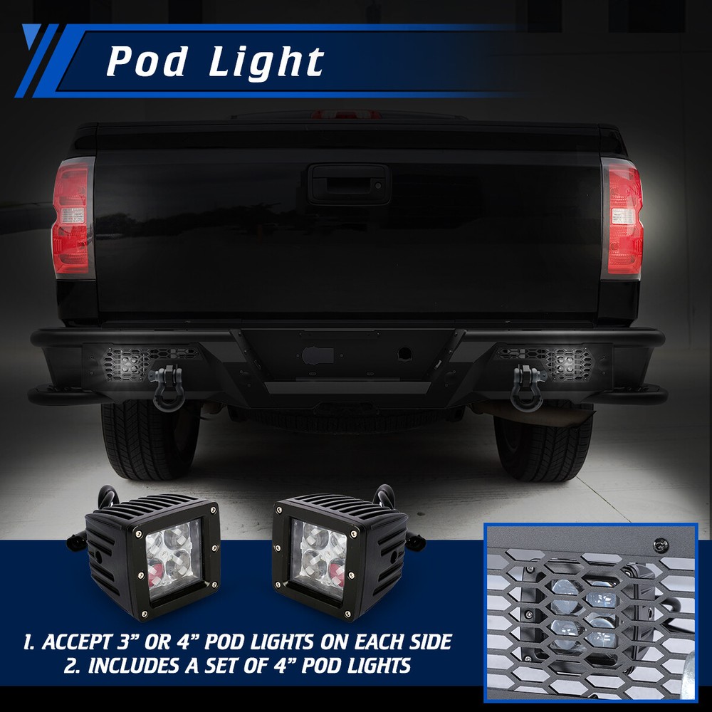 Store Categories Other Car Refrigerator Front Bumper Rear Bumper Fender Flares Inner Fenders Side Steps Running Board A-Pillar Light Mount Brackets Headlights Taillights Fog Lights LED Headlights LED Taillights LED Fog Lights Jeep Chevrolet Ford Toyota Dodge GMC About this item 🚙 【Off-road Rear Bumper Compatibility】Rear bumpers can make or break your truck's limits for off-roading. This rear bumper will be compatible with 2007-2018 chevy silverado 1500 and for 2007-2018 GMC Sierra 1500. 🚙 【Modern Convenient Design, Retain all OEM Features】There are built-in steps on the sides of the rear bumper, equip the bumper with 2 D-ring shackles & 1 Pair 4'' led pod lights that be ready for any situation. Retain all OEM features with the rear bumper. Not only is the bumper compatible with the factory hitch, but it also retains the OEM parking sensors and factory blind spot module sensor. 🚙 【Carbon Steel with E-coating, Longlife and Easy to Clean 】The rear bumper is constructed of 3/16” carbon steel sheet, that has been precisely welded for an accurate fit and stout protection for 2007-2018 chevy silverado 1500. To ensure it is corrosion-resistant, enhancing its looks and lifespan, its finish features anti-corrosion textured powder coating. 🚙 【Bolt-on Installation, Easy and Convenient】The package includes all the parts and bolts needed for installation. Easy bolt-on install with product instruction and hardware that come with bumpers. No drilling or modifications required to silverado/ sierra pickup. 🚙 【Package & Support 】The package includes: 1 x Rear bumper/ 2* Shackles/ 2* Led Pod Lights/ All mounting hardware. 📢📢 Please feel free to contact us via message center if any question. We always stand behind these products and are committed to providing responsive customer service. (Reply within 24 hours) Vehicles Fitment 🚙 For 2007-2018 Chevy Silverado 1500 🚙 For 2007-2013 GMC Sierra 1500 🚙 For 2014-2018 GMC Sierra 1500 Main Specification 🚙 Color: Black 🚙 Include: Mounting Hardware 🚙 Finished surface: Anti-corrosion textured Steel powder coating. 🚙 Type: Rear Bumper 🚙 Material: Q235A 🚙 Package Dimensions: 33.46 * 33.46 * 13.39 inch 🚙 Package Weight: 80.47 lbs 🚙 Product Dimensions: 78.3 * 13.8 * 10.1 inch Package Included 🚙 1x Steel Rear Bumper 🚙 2x Rear LED pod lights 🚙 2x D-Ring Shackles 🚙 1* Set of Mounting Accessories Payment Delivery details Terms of sales About us Contact us Payment We accept PayPal, credit card , Apple Pay & Google Pay etc. Delivery details All items will be shipped within 1-3 business days after payment received, we will try our best to ship out as soon as we can, hope for your understanding. Please double confirm your address and contact information, which will help the delivery faster and more accurately. Note :buyers who purchase international products need to pay import tariffs!!! Terms of sales Professional installation is highly recommended. Any problem of the item please feel free to contact us first , please D o Not leave negative feedback before that, or simply return it within 60 Days in original condition. We will resolve it for you ASAP. About us Any questions please do not hesitate to contact us directly by eBay message . We will reply you within 24 hours asap, thanks for your understanding. Contact us Should you have any problem or require any further information please feel free to contact us . If you are satisfied with our product and service, please kindly leave us a positive feedback. Popular Categories On Mar 14, 2025 at 20:42:06 PDT, seller added the following information: