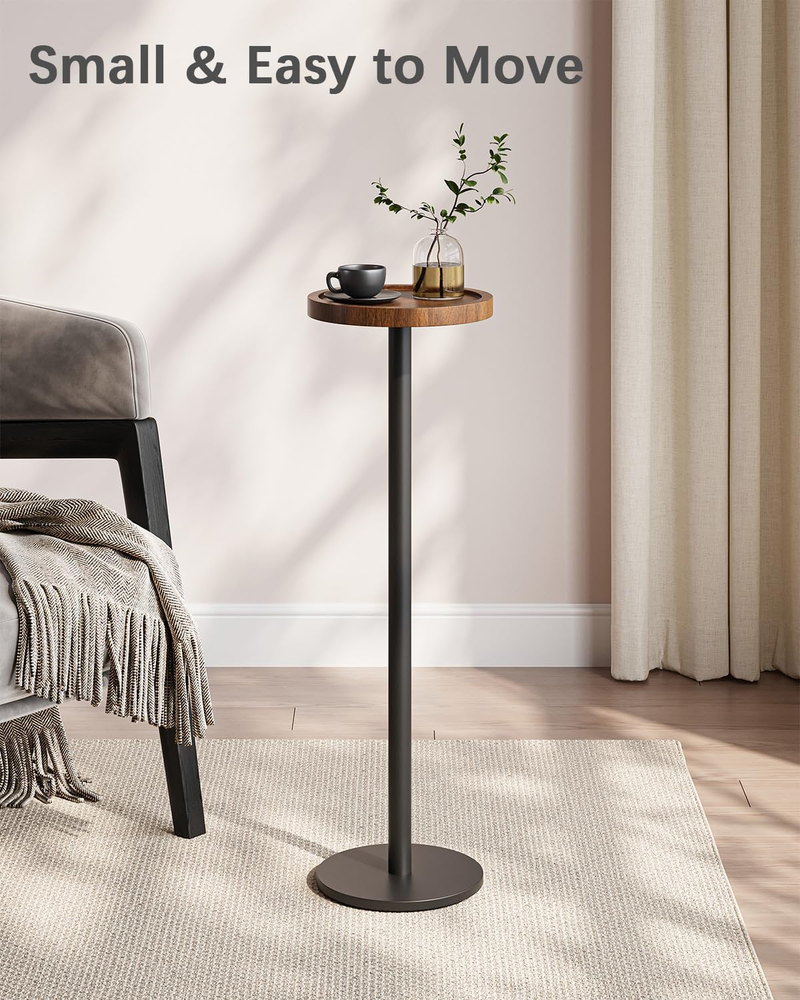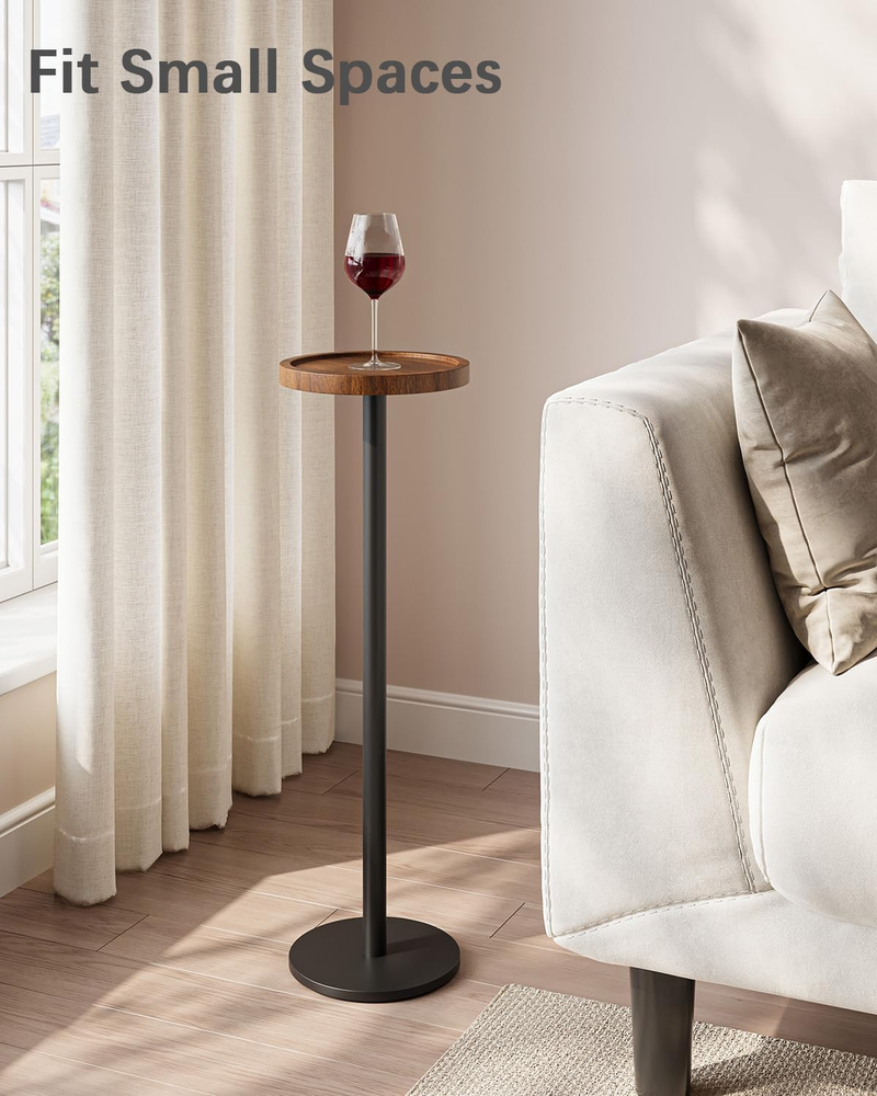 Delicate small table, designed for small spaces - The size of this small drink table is only 7.87"Dia. x 24.8"H. Its compact size allows it to easily fit into various small spaces. Whether it's a quiet corner of the living room, a bedside in the bedroom, or a leisurely area on the balcony, it can find the most suitable position, adding a touch of elegance to your space. Lightweight and agile, place it wherever you want - This pedestal table is designed with simplicity and elegance, weighing only 6.8 LB, making it easy for you to lift and place anywhere. Imagine, in the afternoon, you are holding your favorite martini and walking from the living room to the balcony. This small table is like your intimate companion, accompanying you to enjoy every moment of relaxation. Weighted iron base, sturdy as ever - To ensure that you can place items like wine glasses and drinks without worries, we have specially adopted a weighted iron base design, making the table remain stable when carrying heavy items and avoiding shaking, allowing you to enjoy peace and comfort. Grooved desktop, anti-slip and thoughtful - The desktop is cleverly designed with grooves, allowing tall glasses, wine glasses, and other small items to be placed firmly, effectively preventing slipping. While you enjoy your wine, you can also enjoy the double guarantee of safety and convenience. Multi-functional use, showing personal charm - This small round table can not only be used to place drinks, but also as a martini table, beverage table, and other purposes. Its rounded lines and exquisite detailing all show your unique taste and personality. Whether it's paired with cocktails or martinis, it can become the finishing touch in your space, highlighting your extraordinary charm. Product Description
