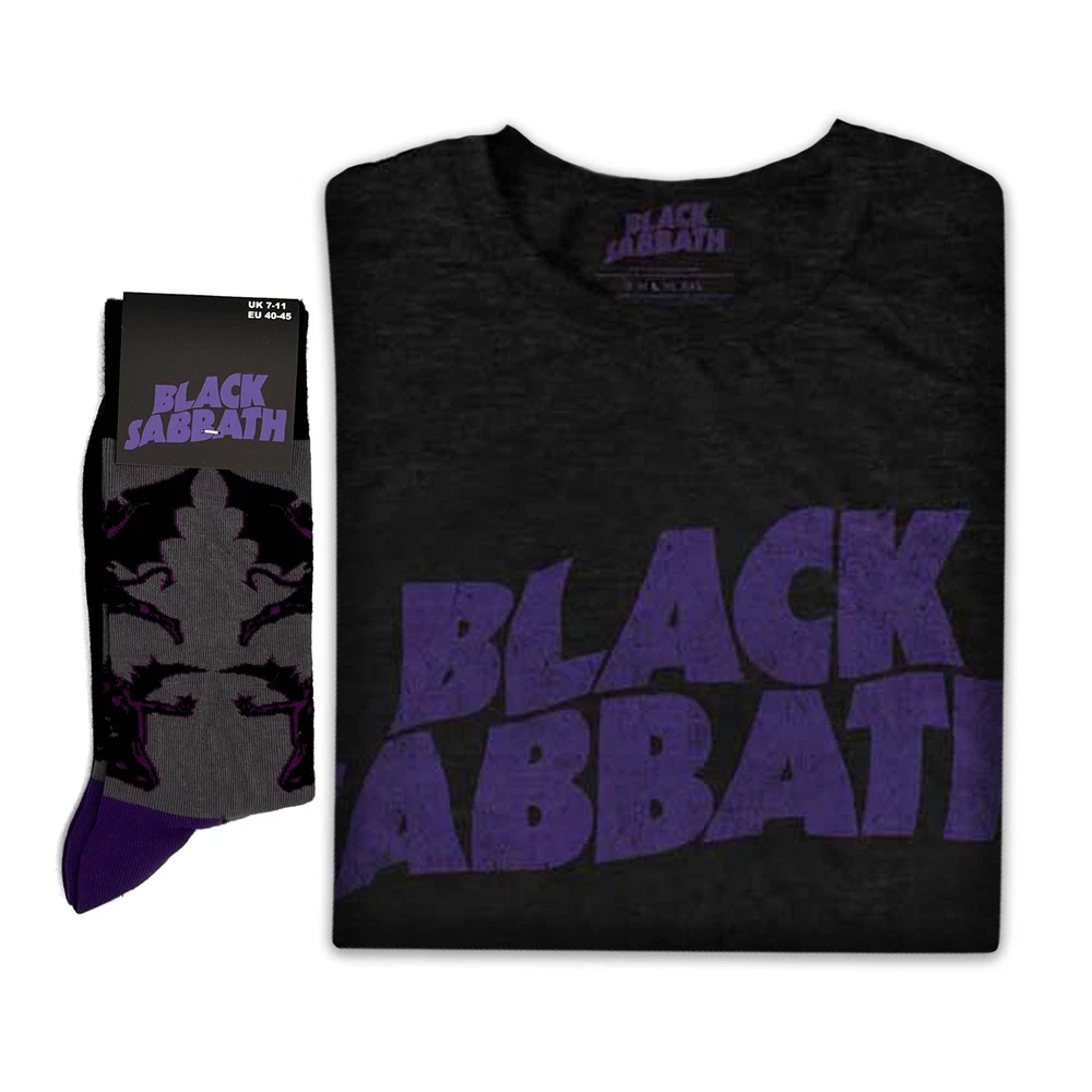 Black Sabbath Unisex T-Shirt: Wavy Logo Vintage & Socks - Gift Set A best selling rock T-shirt with a pair of socks makes the perfect gift for any die-hard music fan. The premium quality, colourful, rich woven socks are made from 86% cotton, 12% Polyamide, 2% elastane and come in size 7-11 (UK), 41-46 (EU), 8-12 (US). The officially licensed t-shirt features a digital screen printed design, short sleeves, crew neck, a soft-style finish and is Cotton. These smart gift sets are limited in number, so be sure to grab yours while you can. Rock Off officially licensed products.
