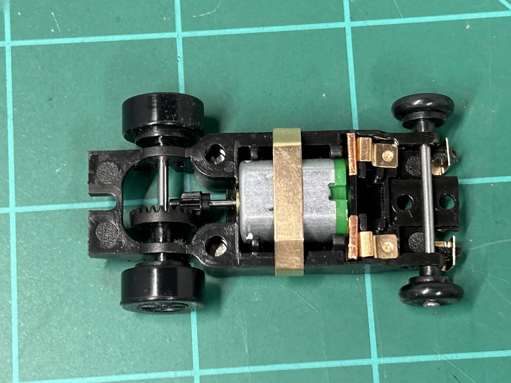 What is the T-Dash Turbo Screw? To those unfamiliar with Turbo Screw, it's an 'inline' that will take screw on bodies. It's a mashup of a Turbo , a Mega G+, Mondo and T-Jet. 'Tomy Turbo style' front and and electricals. This chassis can take off the shelf parts. Nothing is proprietary. We have made our own versions, but existing shoes, hangers and springs from the Tomy Turbo/SRT, Viper, etc will all work. Mondo traction magnet tubes tallow for wide adjustability of the traction mags. T-Jet body mounts. TS uses a removable bulkhead that forms the electrical bridge between the motor and the shoe hangers. Nothing is soldered in place. The motor is easily removed/replaced. Depending upon what motor you pop in there, performance can be on par with some of the mainstream inlines available now. Set of 4 chassis run good only tested for function on power supply Works On AFX and tyco Track. see other listings for more colors I do combine shipping for $1 each additional item
