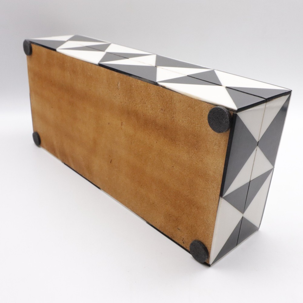 This Handicrafts Home jewelry trinket box is a handmade decorative piece featuring a triangle shape with a black and white color scheme. It is made of wood, resin inlay, and pine MDF, with a hand buffed polish finish for added elegance. The box is ideal for storing jewelry or small mementos, making it suitable for all occasions and any room in the home. Its unique design and craftsmanship make it a stylish addition to a teen's or adult's living space.