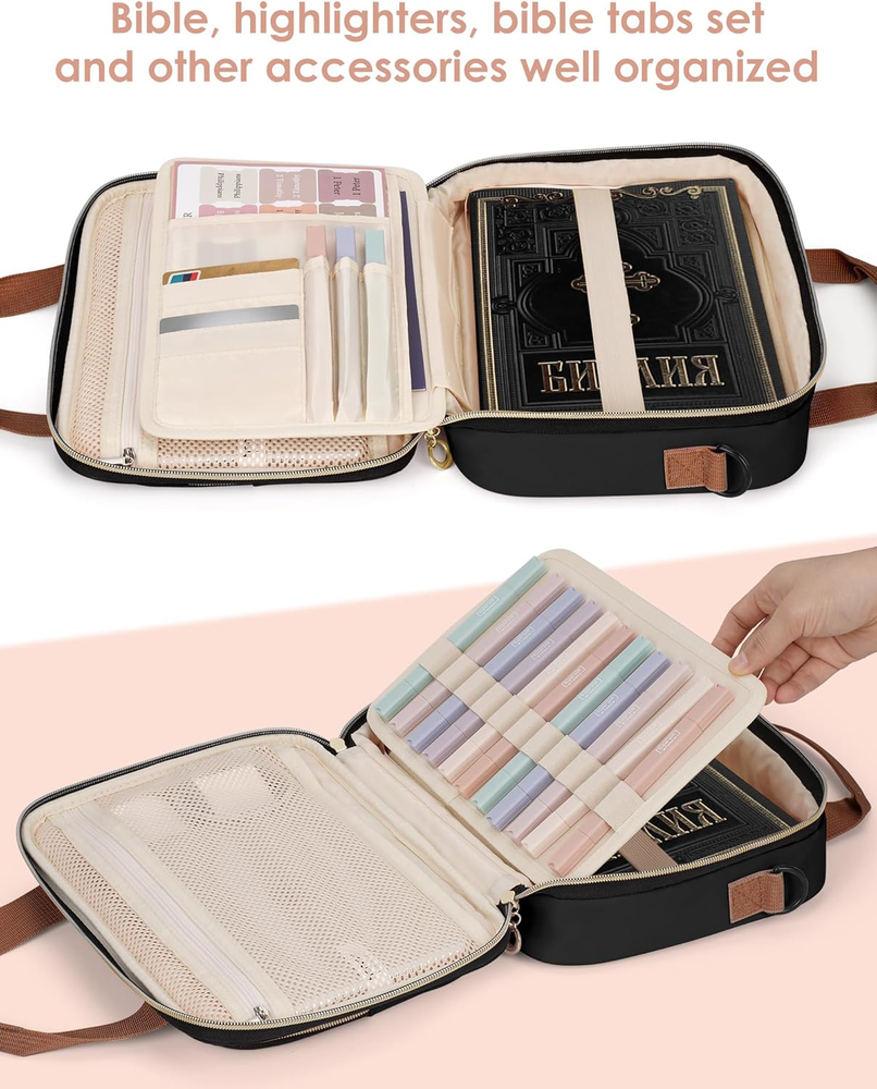 Love this Bible cover! The zipper pocket is perfect for keeping small items secure, and the shoulder strap makes it so convenient to carry. The black design is sleek and stylish, plus the quality feels durable. Shipping was super fast, and customer service was excellent—definitely recommend!
