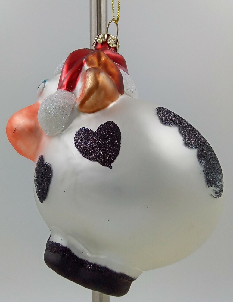 These adorable cow ornaments with Santa hats are such a fun and quirky addition to my holiday decor! The distressed black spots give them a charming vintage vibe, and the blue eyelids and big noses add playful character. At 5 inches tall, they’re the perfect size for the tree or a festive shelf display. Despite being pre-owned, they’re in great condition—just a little wear that adds to their charm. Super cute and well-packaged for shipping!