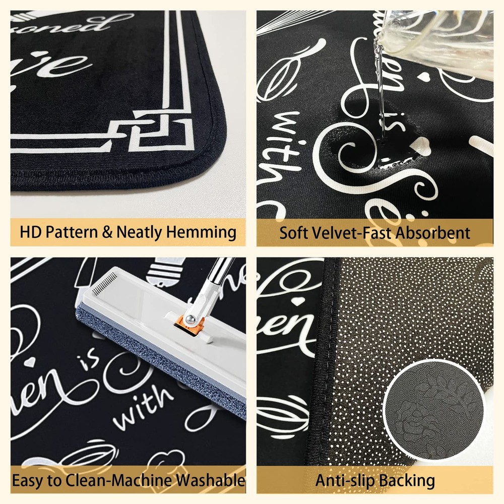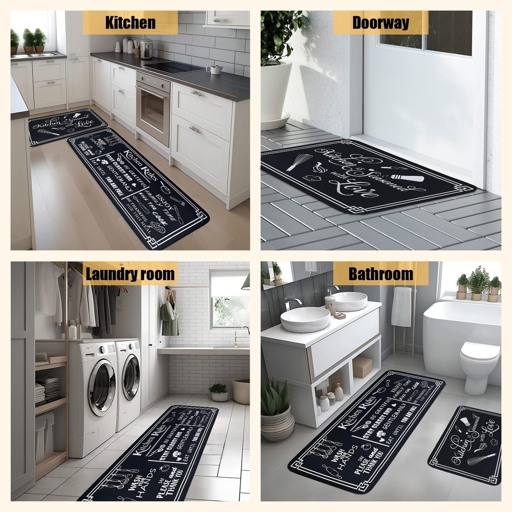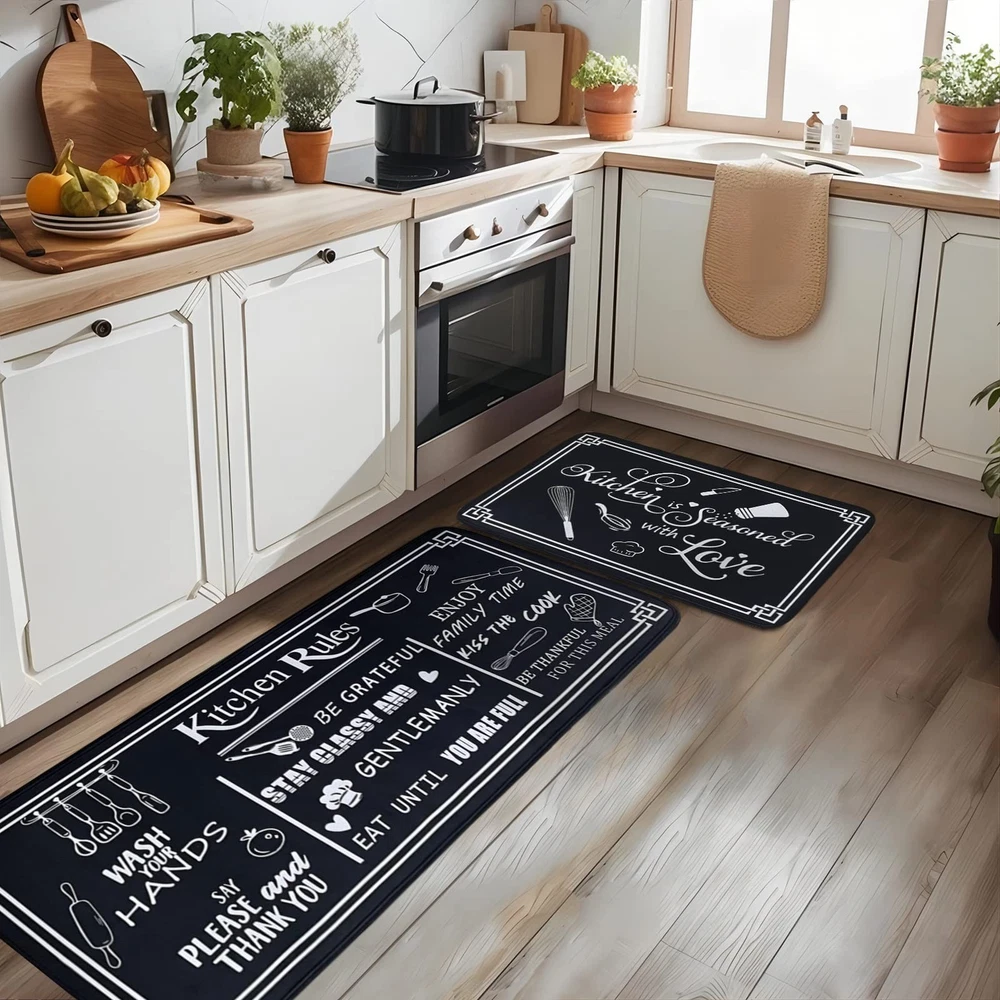 Black and White Kitchen Rugs,Non Skid Washable Microfiber mats for Kitchen Floor, Kitchen Rules Theme Cushioned Runner Rug Decor Sets of 2,Size 17"x 47"+17"x 30" Product Details Color: Kitchen Rules Black Size: 17"x47"+17"x30" Brand: Voanos MPN: Voanos-1 UPC: Does not apply EAN: Does not apply Brand: Voanos Size: 17"x47"+17"x30" Material: Velvet Weave Type: Flat Woven Item Weight: 2.1 Pounds Brand: Voanos Size: 17"x47"+17"x30" Material: Velvet Weave Type: Flat Woven Item Weight: 2.1 Pounds Pile Height: Low Pile Construction Type: Machine Made Back Material Type: Rubber Color: Kitchen Rules Black Indoor/Outdoor Usage: Indoor Theme: Runner Is Stain Resistant: Yes Product Care Instructions: hand wash or machine wash Pattern: Kitchen Rules Black Shape: Rectangular Special Feature: Washable、non-slip、durable、washable、stain-resistant Room Type: Kitchen Product Dimensions: 47"L x 17"W Rug Form Type: Runner Style: Modern Number of Pieces: 2 Item Thickness: 0.3 Inches Material Feature: Soft and Comfortable, Slip-Resistant Model Name: Voanos-1 Recommended Uses For Product: Kitchen floor decoration, cooking activities Item Weight: 2.09 pounds Manufacturer: Voanos-1 Item model number: Voanos-1 Date First Available: August 9, 2023 PERFECT SIZE: The black and white rules Kitchen rugs set includes 2 mats (17"x30" and 17"x47"), Voanos kitchen mats set is available in multiple colors and patterns, so you can choose the one that best matches your kitchen decor. HIGH-QUALITY MATERIALS: Our kitchen mats are non-skid, washable, and made from Microfiber material. The 0.3" thickness and crystal velvet material provide cushioned support to reduce fatigue and discomfort while standing in the kitchen. NON-SLIP & DURABLE: The kitchen rug set comes with a non-slip backing, making it durable and ensuring it stays in place, preventing accidents while cooking. Note: Please keep the bottom of the kitchen rug and the ground dry when using, as water may cause slipping. FAST-ABSORBING & EASY TO CARE FOR: The surface of the kitchen rugs is designed to quickly soak up spills and messes, keeping your kitchen floors clean and dry. The kitchen mat usually only needs to be cleaned with a damp cloth, and when a deep cleaning is needed, simply toss it in the washing machine and tumble dry on low heat for hassle-free cleaning. MULTI-USE: Perfect for home kitchen floor decoration, suitable for wooden floors, marble floors, ceramic floors, and concrete floors, etc. Two sizes can be freely assembled in any area, such as the kitchen, bedroom, bathroom, standing desk, office, laundry room, sink, and stove.