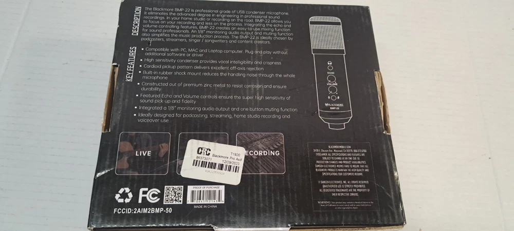 Blackmore Pro Audio Bmp-22 USB Card CONDENSER Mic Kit If it is not pictured, it is not included. Pictures are part of the description. If you require special shipping arrangements please contact us before purchasing. Please feel free to ask any questions on our items. Please read the description and observe all photographs thoroughly before purchasing any and all items. We are dedicated to honest business, customer service, quick shipping, accuracy and a personal relationship with our customers. If you experience any problems at all please speak with us before going to eBay. I will do my best to resolve any and all issues.