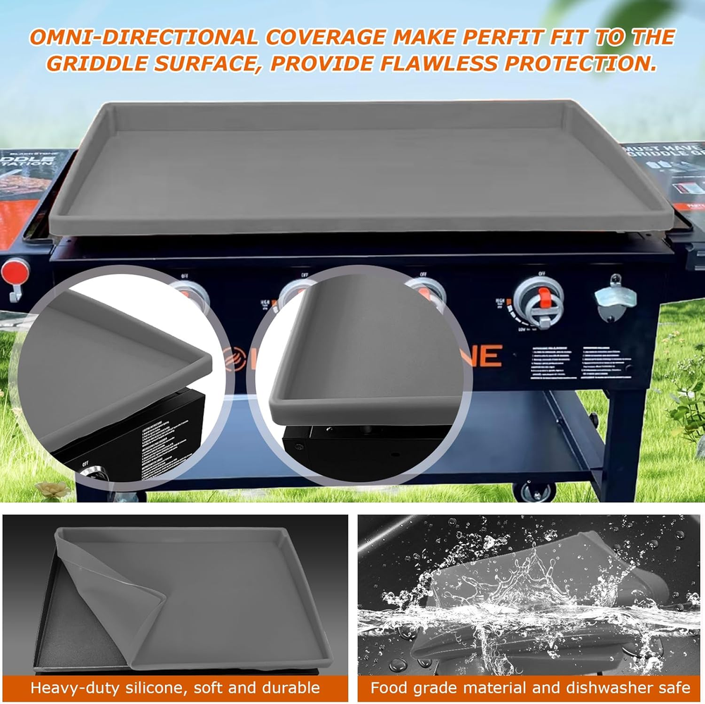 【Non-slip Bottom】 This silicone griddle mat has an upgraded polished bottom surface, making it stick to the griddle to reduce sliding or wobbling. 【Perfect Fit】 Great griddle accessories for Blackstone griddle with specially-designed size, no need for any trimming, just lay it on your griddle. 【Food-Grade Silicone】 Made from 100% food-grade silicone, durable for any weather. The foldable silicone mat makes it easy to store when using the griddle. 【Easy to Clean】 With its upgraded textured design, the surface of our grill mat is less susceptible to dust. Simply clean it effortlessly with soap and water, free you from the cleaning work of your griddle. 【All-Season Protection】Our mat offers all-weather protection, shielding your grill from various threats all year round. No matter the season, your grill will always be ready for your next outdoor culinary adventure. 【FITS THESE BLACKSTONE 36" MODELS】 1554/1565/1818/1820/1825/1836/1841/1863/1866/1899/1932/1984 and other brand griddles; Griddle Cover size:36.22 x 22.04 x 2.36 inches Product Description Your New Blackstone Griddle Accessories Our mat offers all-weather protection, shielding your griddle from various threats all year round. No matter the season, your griddle will always be ready for your next outdoor culinary adventure.