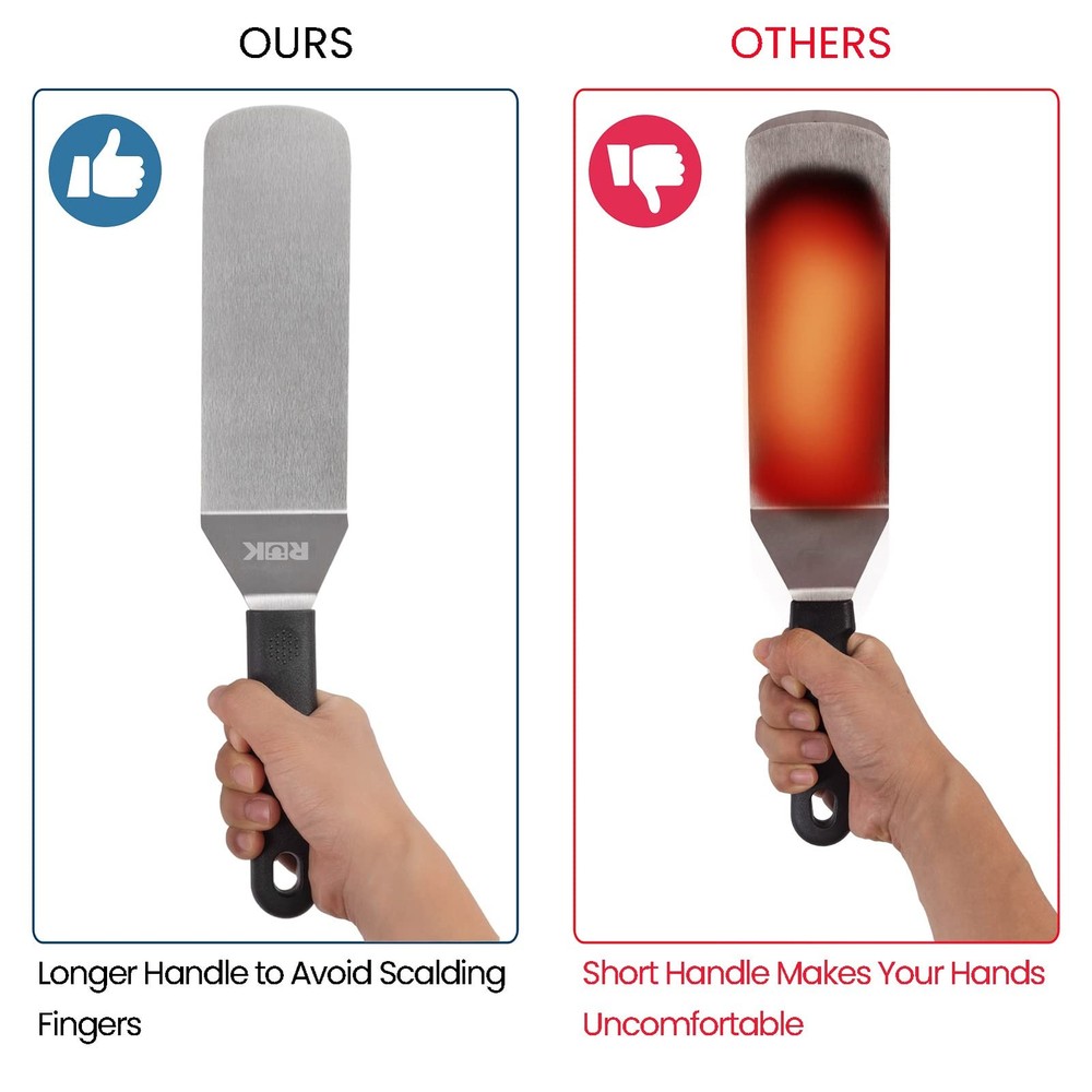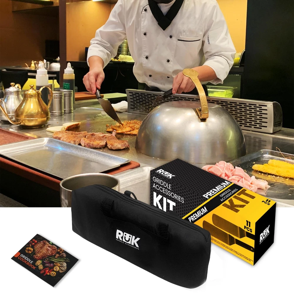 Welcome to the culinary world of home to high-quality kitchen tools and appliances. Our passion for premium products starts with our desire to connect people through the joy of cooking. We created this 11 Pcs Griddle Accessories Set with all the kitchen tools you’ll need to go beyond your grill and bring joy to your griddle cooking. Enjoy a teppanyaki breakfast or meal with our griddle utensil kit. The griddle accessories set is an ideal gift for your family or friends at any festival. It will be a perfect gift to promote intimacy. UPGRADED 20PCS BLACKSTONE GRIDDLE ACCESSORIES KIT - These professional flat top grill accessories provide all your needs for use by professional chefs and bakers in restaurants and food shops as well as griddle accessories set. The set includes: 2 long spatulas, 1 beveled turner, 1 slotted turner, 1 wide chopper, 1 flat grill scraper cleaning tool , 1 flat grill brush cleaning tool, 2 liquid squeeze bottles, 1 e-recipes book, 1 storage bag, full grill set packaged in a fancy gift box. STAINLESS STEEL GRILL ACCESSORIES - Our griddle utensils set are made of longer (5.51'') sturdy heat-resistant ABS plastic handle that provides a comfortable grip. Holes on the handles for easy hanging to save space. The durable and rust-resistant stainless steel will make your kitchen work becomes simple. MUST-HAVE GRIDDLE SPATULA SET - The long handle metal spatulas provide nice performance on turning burgers, pancakes or picking up food from the grill or griddle. The tapered griddle scraper with 3-sided bevel cutting edge is great for dicing or cutting food, veggie, bread and meat quickly. The silicone egg rings and other griddle tools will help you to cook much better and easier. EASY TO CLEAN - All these easy storage and food-grade flat top grill accessories are easily cleaned with warm, soapy water. Rust-free and durable for daily use. Dishwasher safe for less hassle. Note: After cleaning the flat grill scraper, please use a cleaning towel to dry them to guarantee a long life. IDEAL BBQ GIFT SELECTION - With a nice gift box, this ideal blackstone griddle accessories makes it a wonderful gift for family and friends on birthdays, weddings, Valentine's day, Father's day, Mother's day, Christmas and all other occasions. With the right blackstone accessories, cooking is much safer, easier and more fun.
