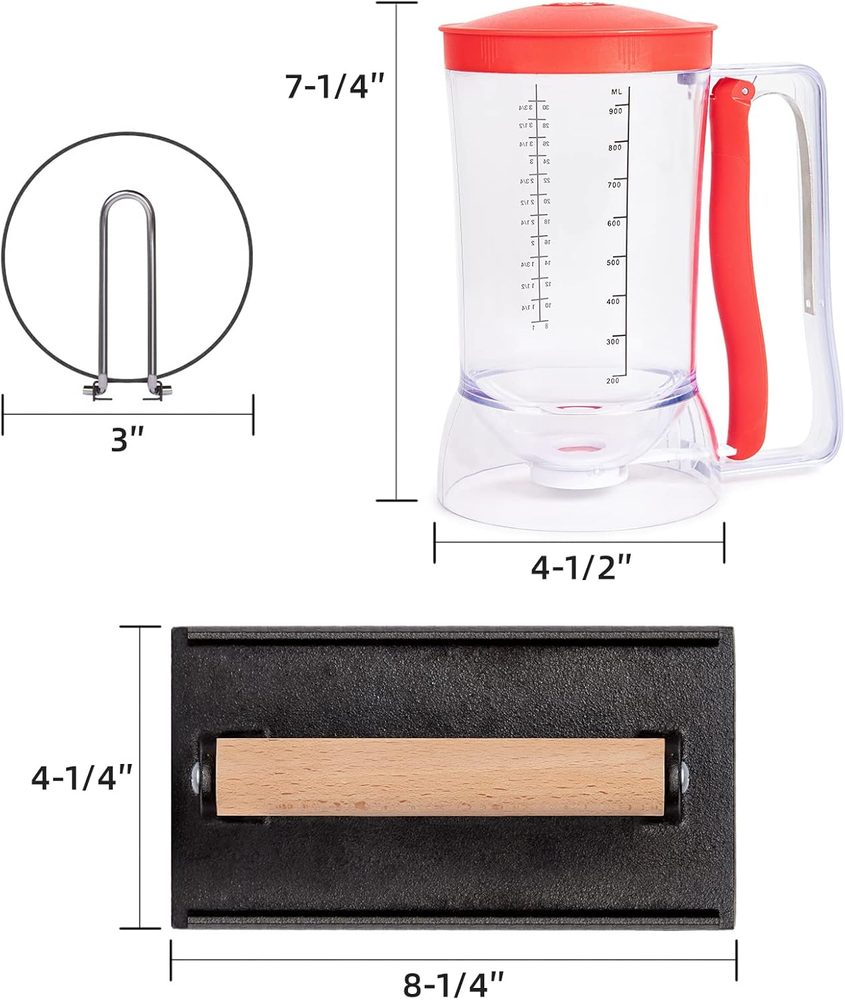 Griddle Accessories Bacon Press Egg Ring Pancake Batter Dispenser for Blackstone Complete 6-piece set: Includes all the essential tools for a perfect breakfast - 1 pancake dispenser, 1 bacon press, and 4 egg rings Precision pancake dispenser: The pancake dispenser boasts a measurement display to ensure perfect dispersal for evenly sized pancakes, waffles, and muffins High-quality bacon press: Made with heavy-duty cast iron for even heating and perfect for grilling sandwiches, burgers, and more Convenient egg rings: The foldable handle design of the egg rings makes it easy to store, also can be uniformly heated, making an ideal companion for pancake dispenser, and perfect for making eggs, pancakes, and more. Fry 4 eggs at one time and save your time Washing and Care: For better protection and increased durability, hand wash all these griddle breakfast accessories. Proper cleaning will keep your pancake dispenser and other accessories as new as ever Product Description The video showcases the product in use. The video guides you through product setup. The video compares multiple products. The video shows the product being unpacked. Safety & Non-disclosure Leaving your hands and kitchen clean and making it safe to use. Easily Control Pancakes, cupcakes, waffles, cakes and crepes, all fit perfectly through our dispensing valve. Perfect Gift for Families and Friends Designed for Your Different Needs Add to Cart Add to Cart Add to Cart Add to Cart Add to Cart Add to Cart Add to Cart Customer Reviews 4.6 out of 5 stars 2,002 4.2 out of 5 stars 21 4.6 out of 5 stars 9 4.7 out of 5 stars 28 4.8 out of 5 stars 15 3.8 out of 5 stars 10 4.6 out of 5 stars 1,875 Price $25.99 $ 25 . 99 $29.99 $ 29 . 99 $23.99 $ 23 . 99 $26.99 $ 26 . 99 $23.99 $ 23 . 99 $5.99 $ 5 . 99 $21.99 $ 21 . 99 Spatulas ✔ ✘ ✔ ✘ ✔ ✘ ✘ Melting Dome ✘ ✘ ✘ ✔ ✘ ✘ ✘ Tongs ✘ ✘ ✘ ✘ ✘ ✘ ✘ Burger Press ✘ ✔ ✘ ✔ ✔ ✘ ✘ Egg Rings ✔ ✔ ✔ ✘ ✘ ✘ ✘ Item Weight 1.68 Kilograms Color Black Material Stainless Steel, Cast Iron, Iron Is Dishwasher Safe No Has Nonstick Coating No Shape Rectangular Recommended Uses For Product breakfast cooking Is Discontinued By Manufacturer No Package Dimensions 8.35 x 7.99 x 6.65 inches Shipping Fast shipping is very important for us. Our expedited US shipping service is FREE. Your order will be shipped within 2 business days upon full payment received. Your order will be delivered within 2-3 business days after the handling time. Warranty & Returns 30-Day FREE Return Policy offered for unsatisfactory items. Options include: Refund or Exchange for another item. Contact us Customer satisfaction is our top priority. If you encounter any issues with our product, please don't hesitate to reach out to us. We are committed to ensuring your satisfaction and will go above and beyond to assist you. Your happiness is our goal! Thank you for shopping at our store.