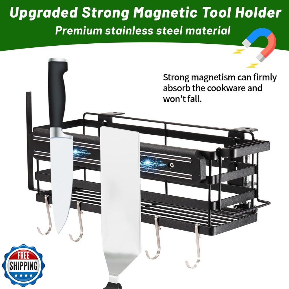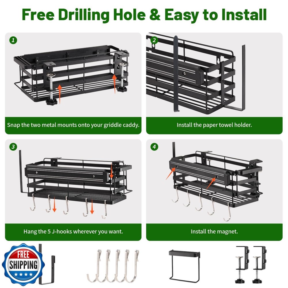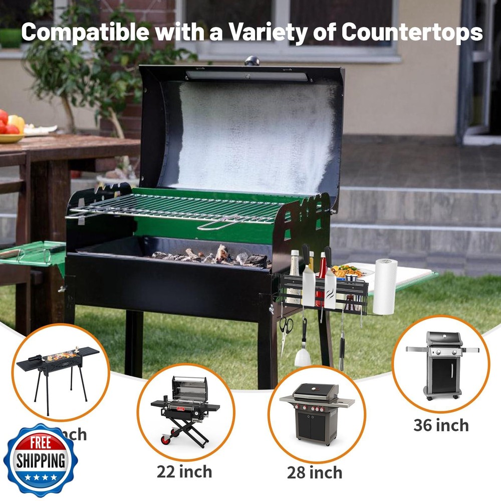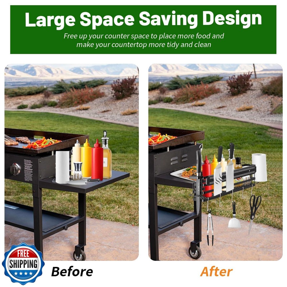 Grill Caddy for Blackstone 22"/28"/36" Griddles Prep Cart, Blackstone Griddle Accessories Organizer with Paper Towel Holder and Magnetic Tool Holder, BBQ Caddy for Outdoor Grill Camping Features 【Space Saver】BBQ Grill Accessories Space Saver provides enough storage space for all grilling utensils including oil bottles, sauces, seasonings, grill brushes, spatulas and BBQ paper towels to be organized. From now on, they won't clutter the countertop and won't be easily knocked over. 【Upgraded Strong Magnetic Strips】The upgraded magnetic strips are easy to hold in place, and the reinforced magnetism holds steel-based grilling tools securely without dropping them. 【Premium Griddle Caddy】Blackstone Grill Accessories are made of high quality carbon steel, which is strong in load bearing capacity and durable, and protected by rust-resistant coating, it will not rust. 【Easy to Carry and Install】The grill shelf is easy to carry and store. Installation instructions are included in the package, it only takes 1-2 minutes and a few simple steps to assemble. Gift for Men: The heavy duty shelf is suitable for Blackstone Grills, Gas Grills, Charcoal Grills, Smokers, Electric Grills and Hybrid Grills. Flexible fixing bracket makes it also suitable for 17in 22in 28in 36in grills. Whether it's for yourself, loved ones, friends or family, it's the perfect gift for BBQ enthusiasts! Shipping Free & Fast Shipping: We offer free shipping to most of the USA with a normal delivery time of 3-7 days. However, due to the current situation, additional delivery time (up to 3 weeks) may be required for some items. Alternative Carriers: We may use alternative carriers (e.g., USPS, FedEx, UPS) to ensure your package arrives safely and on time. Due to the use of multiple carriers, we are unable to provide a tracking number automatically. Handling Time: Orders are processed and shipped within 1-2 business days of receiving cleared payment. Shipping Restrictions: Shipping to Alaska, Hawaii, Puerto Rico, Guam, and other US territories may incur shipping charges or delivery restrictions. Please contact us before ordering, or your order can be refunded/cancelled. State Restrictions: Certain items may not be shipped to California due to state regulations. Contact for Tracking Updates: If you require tracking updates or have any concerns about the delivery of your order, please feel free to contact us, and we will be happy to assist you. Return Policy 30-Day Hassle-Free Returns: If you are not completely satisfied with your purchase, you can return the item for free within 30 days of receiving it for a full refund or exchange. Easy Return Process: Contact us, and we will provide you with a prepaid return shipping label and detailed instructions. No Restocking Fee: There are no restocking fees for returns. However, the buyer is responsible for return shipping costs if the return is not due to a seller"s error. Refund Processing: Refunds will be processed within 1 business day of receiving the returned item in its original condition. Feedback Your feedback is extremely important to us. We strive to provide the best products and customer service possible. If you are satisfied with your purchase, please take a moment to leave us a positive review. If you have any concerns or issues with your order, please contact us before leaving negative feedback. We are committed to resolving any problems and ensuring your satisfaction. Contact Us If you have any questions or concerns, please feel free to reach out to our customer support team. You can contact us through the eBay messaging system. We are available Monday to Friday, 9:00 am to 5:00 pm EST, and we will do our best to respond to your inquiry within 24 hours. Thank you for supporting our small family business!