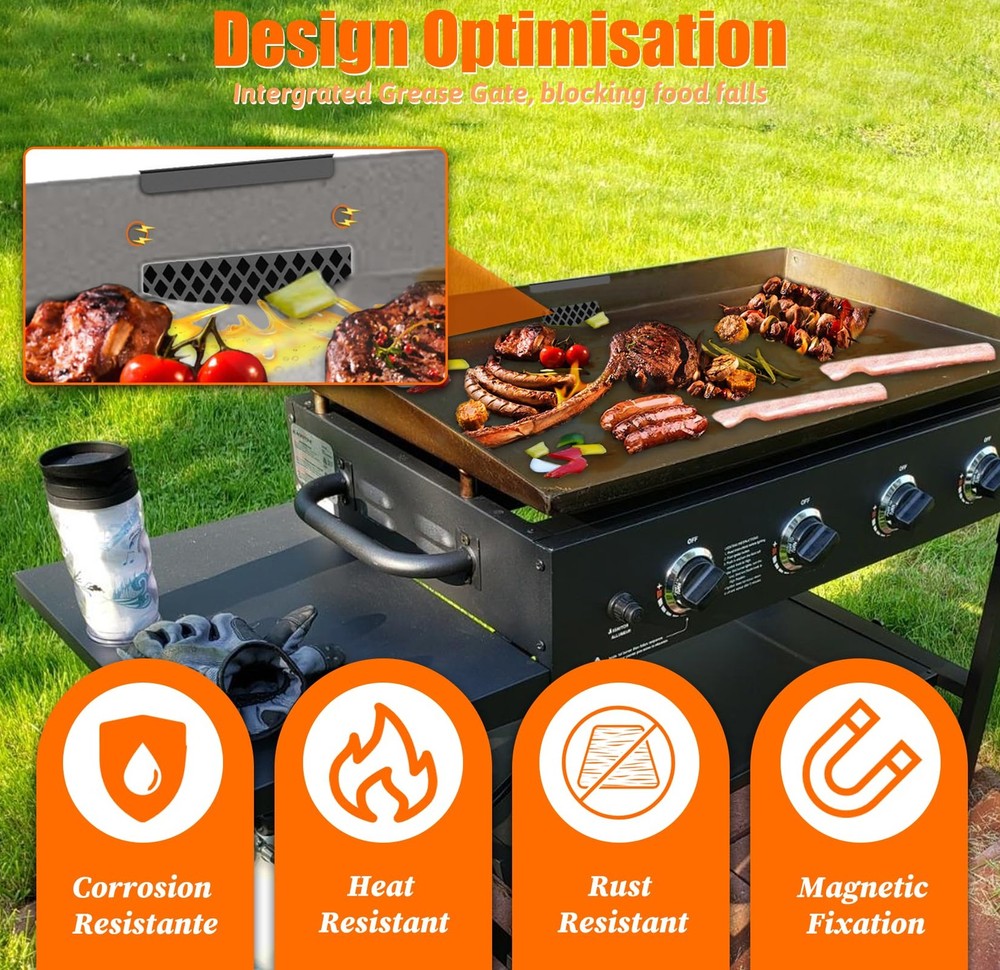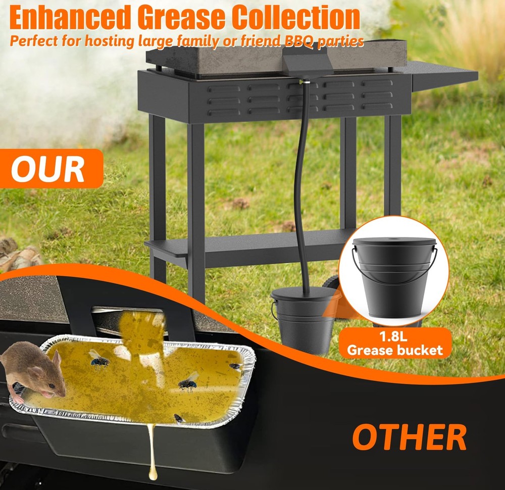 rear grease drainage system for blackstone grease catcher rear grease drainage funnel for blackstone rear grease drainage system for blackstone rear grease drainage funnel for blackstone grill griddle rear grease exit rear grease drainage catcher rear grease drainage for blackstone rear grease drainage funnel rear grease drainage catcher for blackstone rear grease drainage for blackstone 🥩 EASY TO USE, ONE STEP: Enhance your cooking experience and get rid of the hassle of repeatedly emptying the traditional grease tray of Blackstone. Simply attach the heat-resistant silicone hose to the grease funnel with the clip and hang it on the grease outlet at the back of the grill. The silicone hose quickly guides grease to the grease bucket with lid, keeping the grill area clean. Enjoy hassle-free grilling, it's that simple! 🥩 COMPATIBLE WITH BLACKSTONE GRILLS: This rear grease drainage funnel fits most Blackstone grills, including 17/22/28/36 inch models. The upgraded design will not interfere with the use of Blackstone accessories such as wind guards, hood or lid. Note: Do not fit for Blackstone E-Series, Culinary-Series and models 1891/1899/2151! 🥩 ENHANCED GREASE COLLECTION: This rear grease system for Blackstone comes with an enlarged grease bucket and disposable aluminium foil cups with 2.5 times the capacity of a standard drip tray. Perfect for hosting large family or friend BBQ parties. The grease bucket measures 6.77 x 4.33 x 6.34 inches, foil liner measures 6.38 x 3.86 x 6.06 inches. 🥩 DESIGN OPTIMISATION: The grease catcher for Blackstone with built-in magnets facilitates easy attachment to the grease drain at the top of the grill. The integrated rear grease gate prevents food from falling into the grease tray, especially when cooking or preparing foods such as stir-fries. 🥩 HIGH TEMPERATURE RESISTANT MATERIAL: Both the grease funnel and the grease bucket are made of heavy-duty coated steel that is resistant to heat, corrosion and rust, ensuring durability. Meanwhile, the included 3.5-foot heat-resistant silicone hose can withstand temperatures up to 572°F for easy collection of hot grease. Hose lengths can be cut as needed. 🥩 PERFECT BBQ ASSISTANT: This enlarged griddle grease catcher is particularly suitable for use during large BBQs or when making large batches of bacon. It reduces the need for frequent cleaning of standard grease trays, allowing you to focus more on the fun of cooking. It is absolutely ideal for cooking enthusiasts.