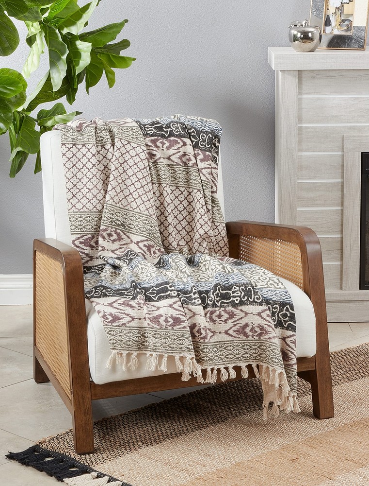 Bring a beautiful splash of color to your home décor with this stylish Block Print Design Throw Blanket. A lovely combination of vintage and boho style, this throw blanket will certainly liven up your space and bring texture and dimension to any seating area. Pair it with solid color throw pillows. Size: 47"x70" Design is not reversible Washed color palette, brings a vintage look. Tasseled edges, add a playful note. Material: 100% cotton + Care: dry clean Number of items: 1