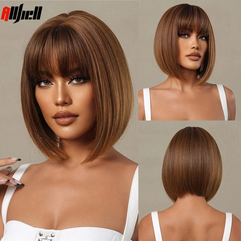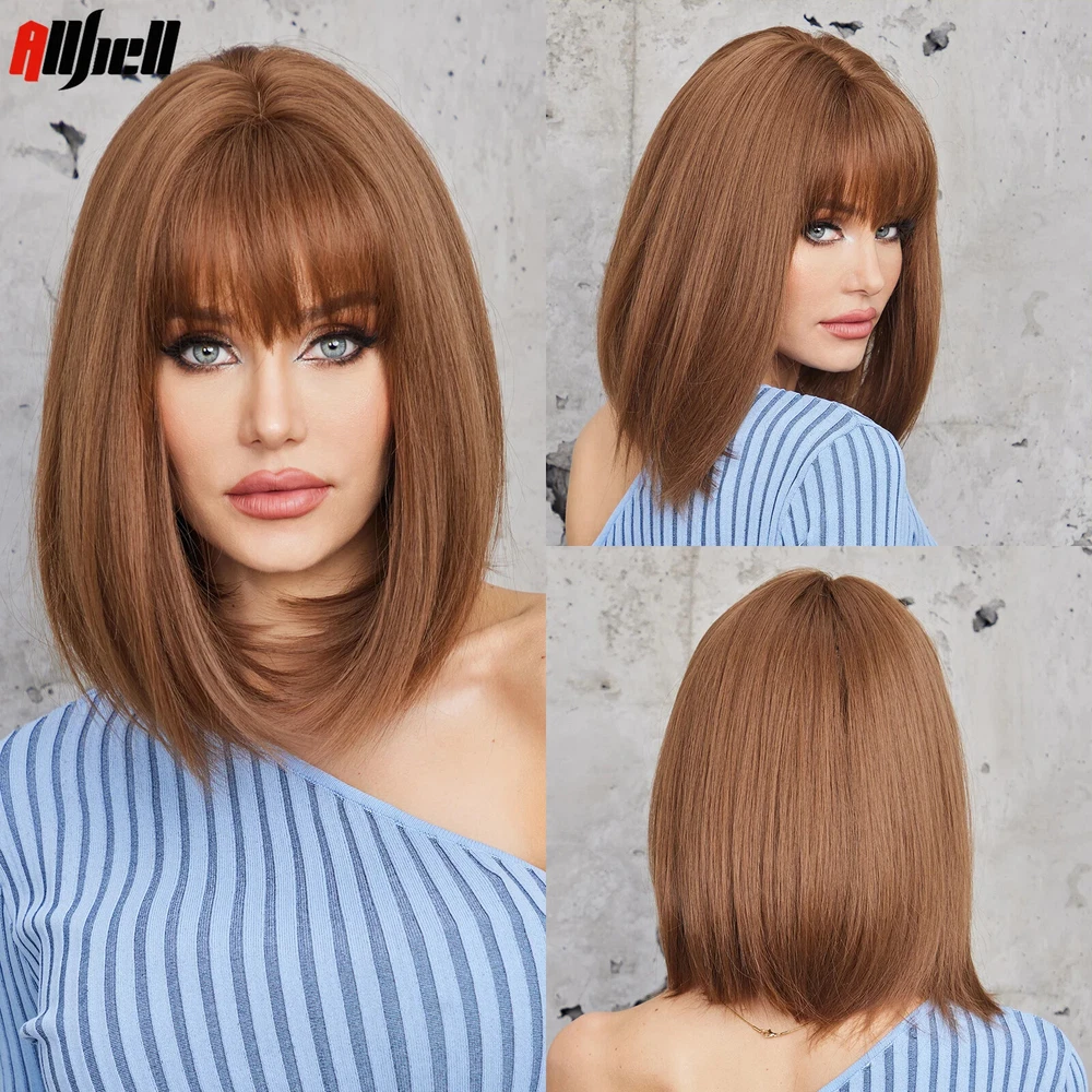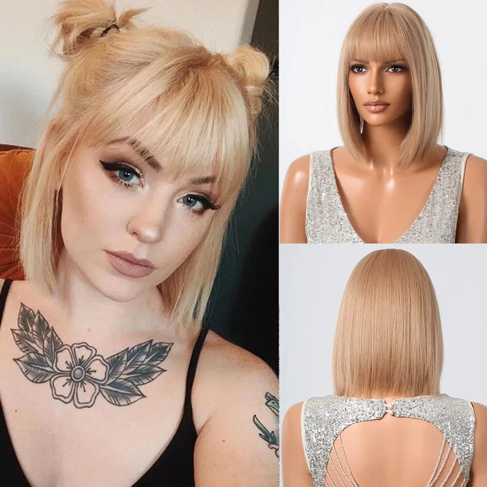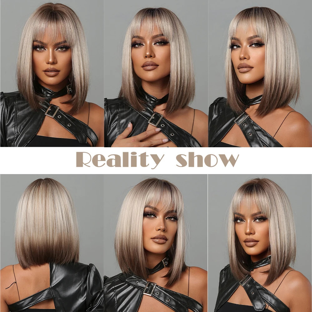 Short Straight Synthetic Wigs for Women Blonde to Brown Ombre Bob Wigs with Bangs Daily Cosplay Party Heat Resistant Fake Hair 【Adjustable size】: The hair cap of synthetic wigs is average size. There are two adjustable elastic bands inside the wig, which can better fit different head shapes and suit most people. 【Premium material】: Our synthetic wigs is made of heat resistant fiber. You can do any hairstyle you like within a safe temperature range. It is not easy to tangles and frizzy, giving you the soft feel 【Exquisite design】: The synthetic wigs design stylish and beautiful, you can use it to make a variety of shapes, very suitable for daily use, party and cosplay, to help you create the perfect date, concert, role-playing, theme party or video shooting. 【Warm Notice】: The color will show some differences on different monitors. If you have sensitive skin, please be aware that using synthetic wigs may cause dryness, heat, or itching of your scalp, so please make sure if you are allergic to wigs. Product Display All Styles Display