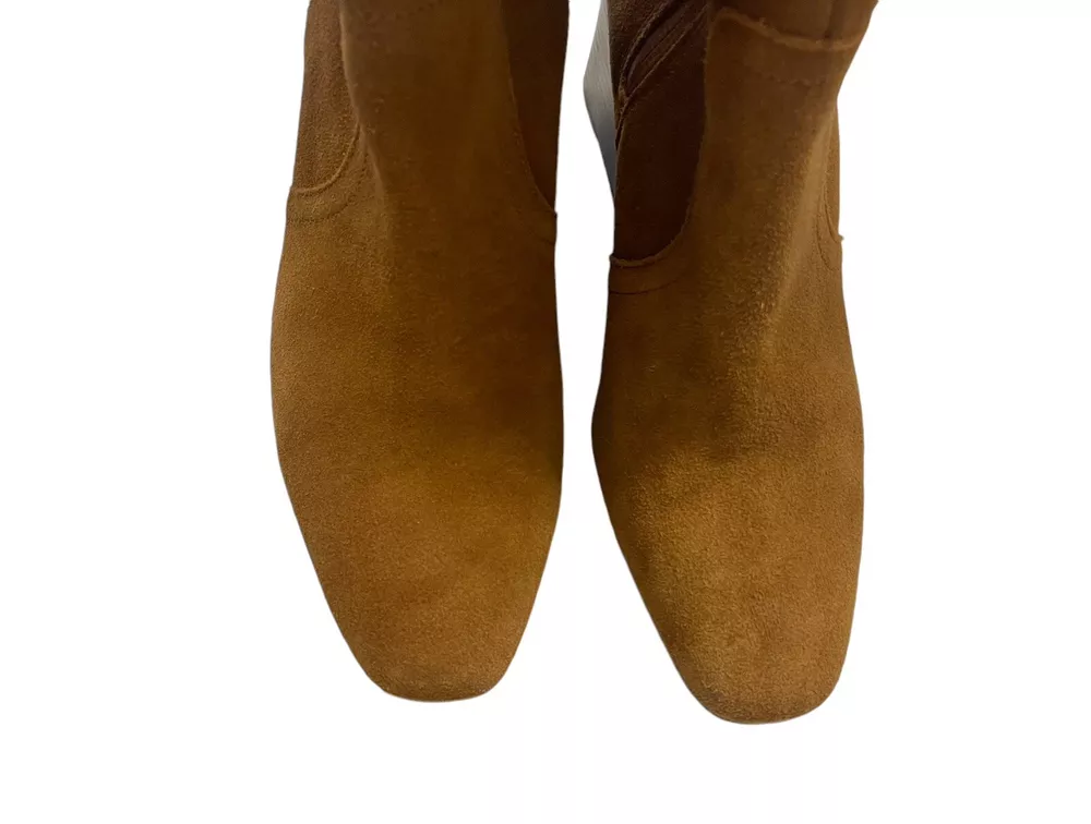 In excellent condition Waterproof suede upper Inside zipper closure Square toe Synthetic lining Fabric footbed Approx. 14" shaft height Approx. 12" calf circumference 2.75" stacked block heel Rubber sole
