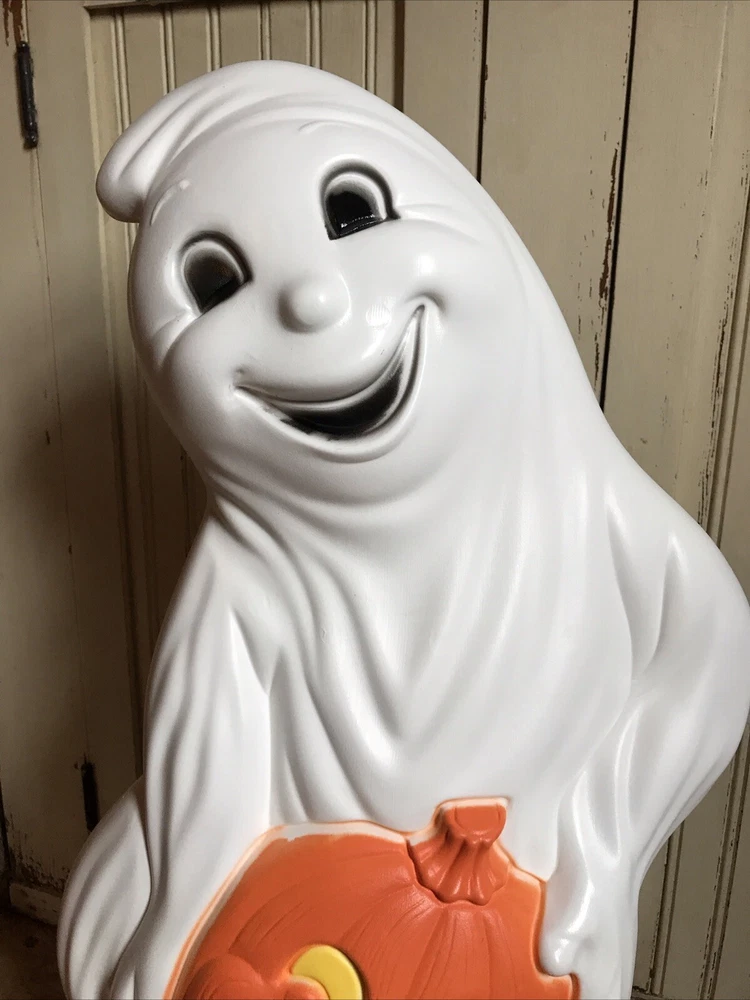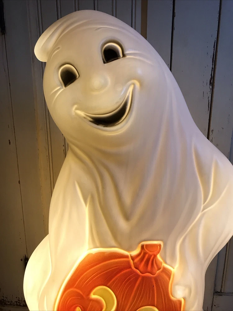 Blow Mold Halloween lighted Ghost with Pumpkins newly made using the original Grand Venture mold. Lighted with a bright LED bulb. Stands 31” inches tall. Great look. Made in the U.S.A. Look over pictures to help with description. Thanks. Shipped UPS or Fed Ex. No PO Box shipping.
