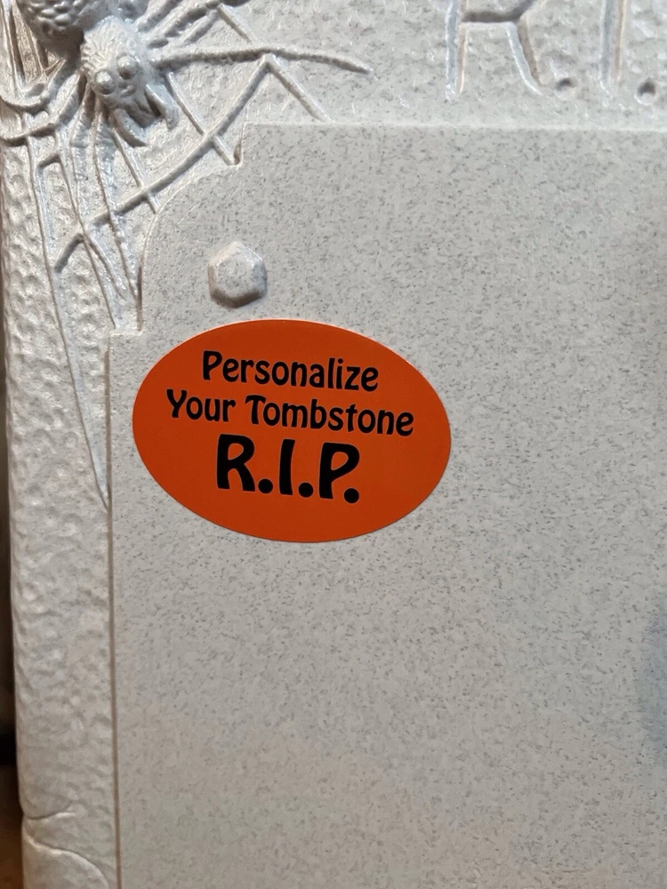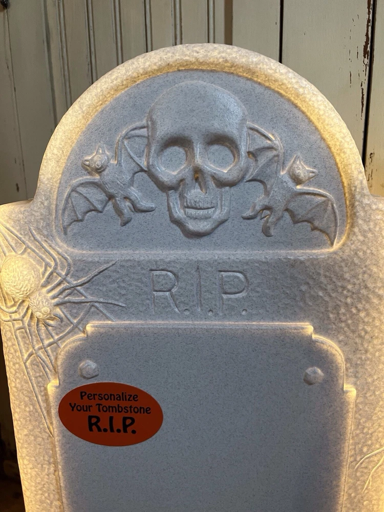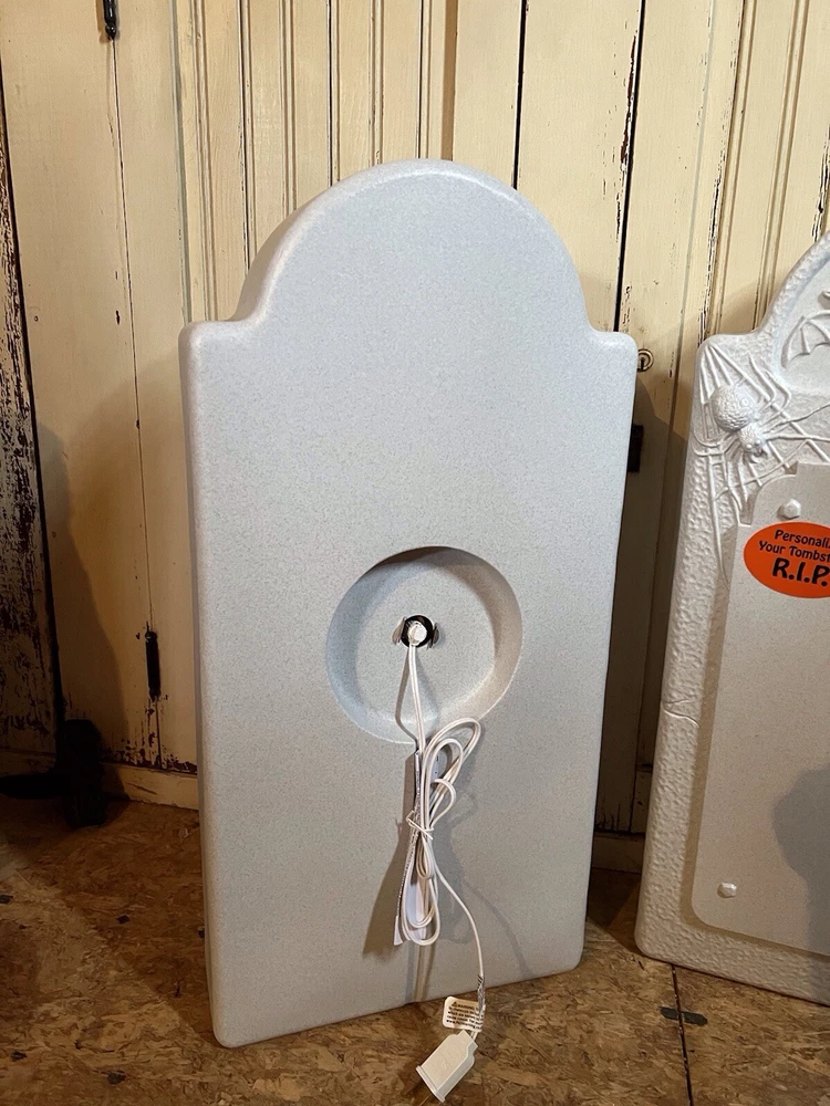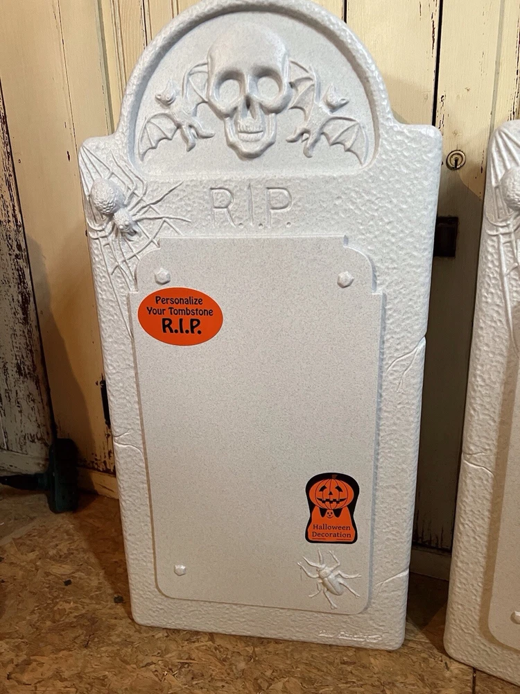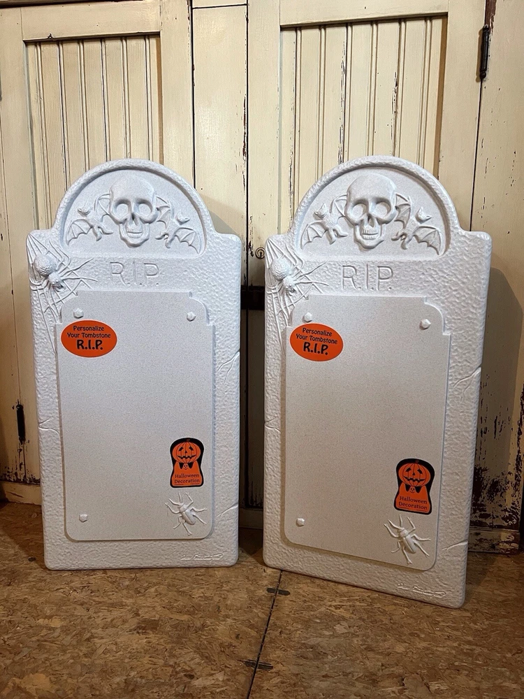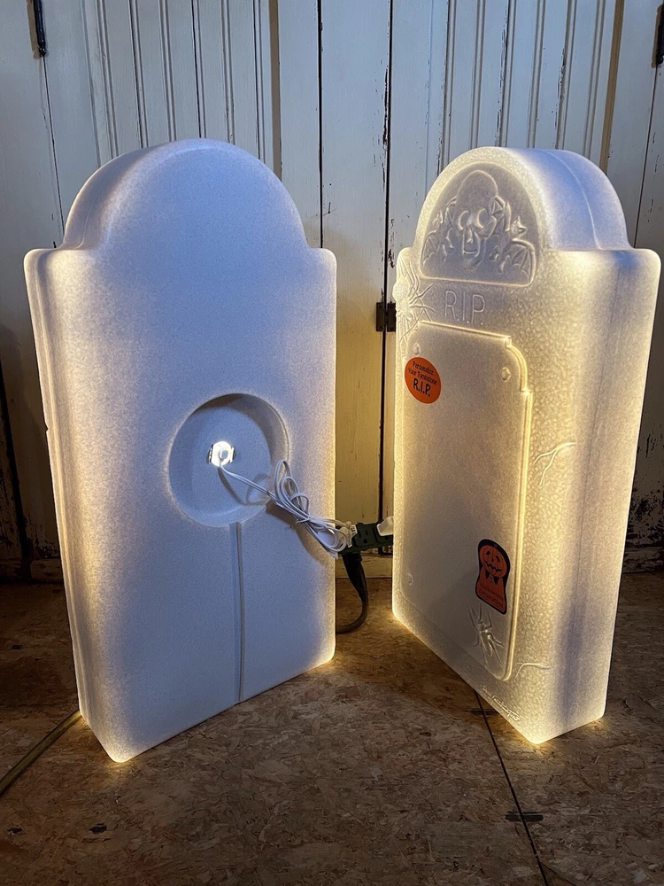 PAIR. Two Gravestone Tombstones from Union Products and created by Don Featherstone. Each one comes with a bright LED light bulb and cord. Each one measures 25” inches tall, 12” inches wide, and 4 1/2” inches thick. Each quantity listed is for two Gravestones. Shipped UPS or FED Ex. No PO Box shipping. Look over pictures to help with description. Thanks.