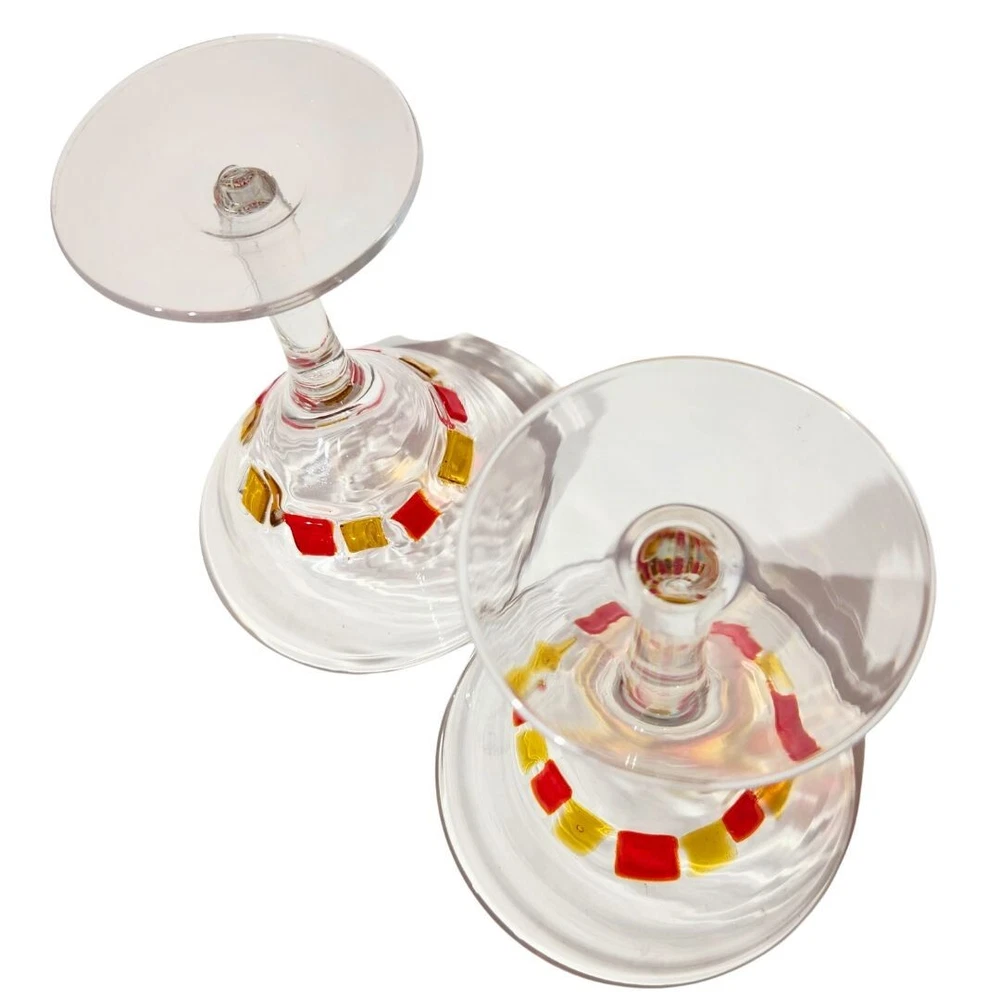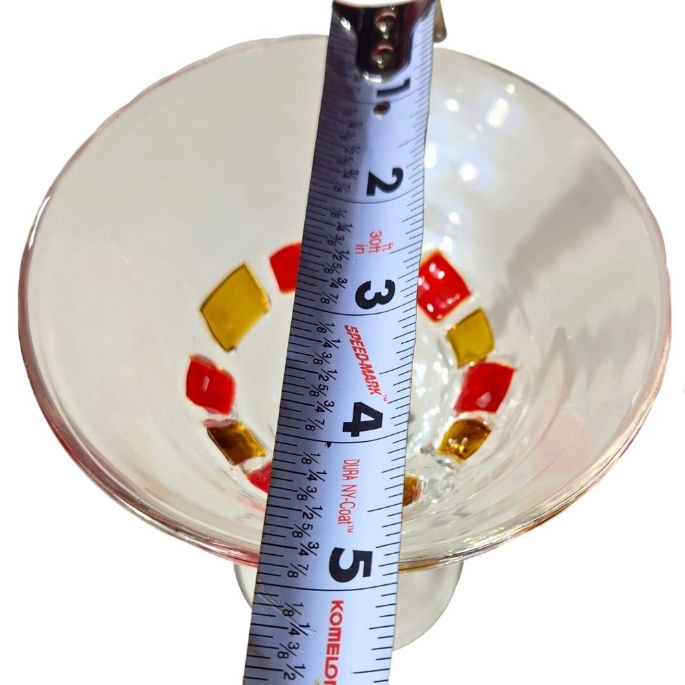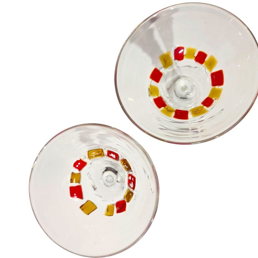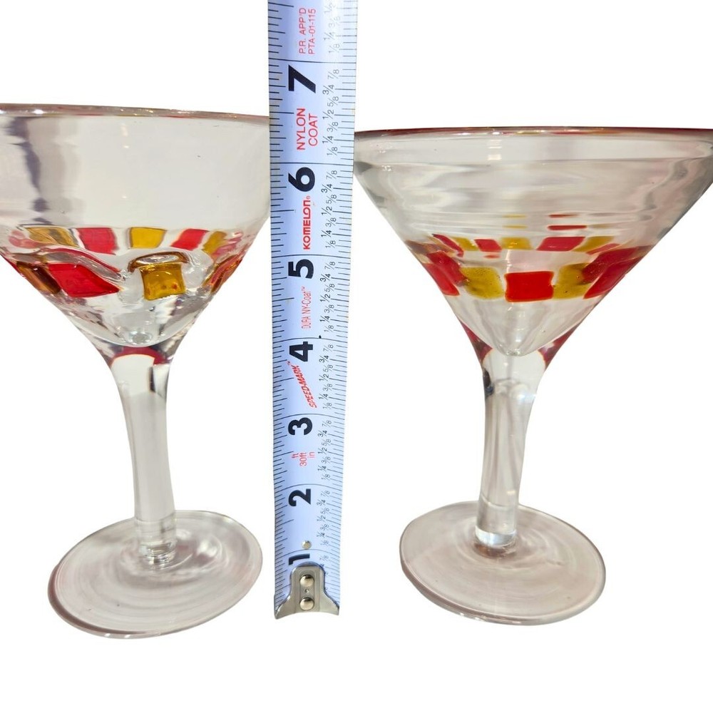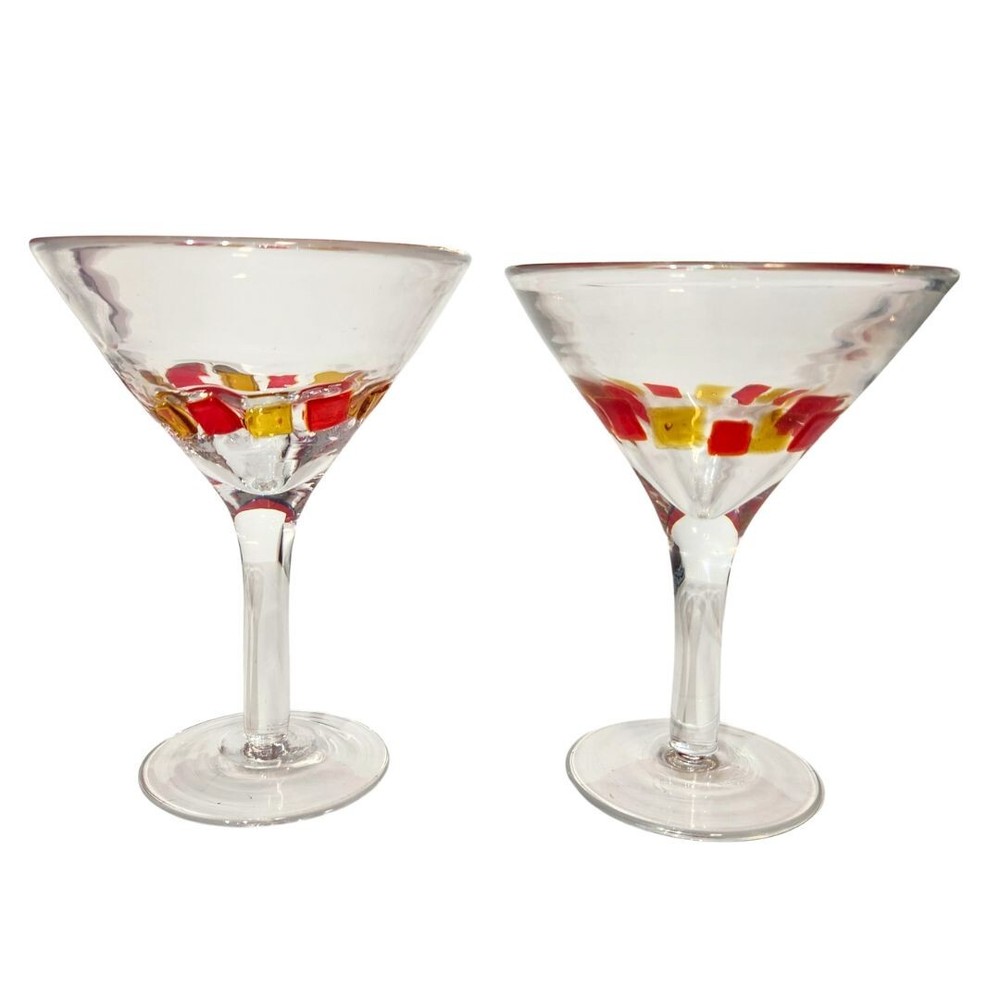 Blown Martini Glass Clear Stemmed 6.5" Wide Rim Applied Yellow Red Lot of 2 No chips or cracks, but glasses have been used and may present minor scratches and signs of wear. Applied red and yellow squares are done by hand and are not perfectly uniform. Please thoroughly review photos for quality and condition of item. If you have any questions, feel free to reach out.