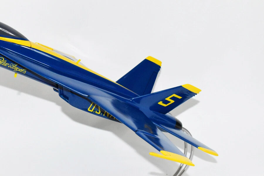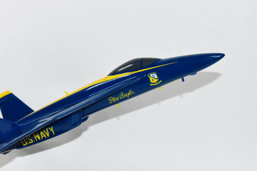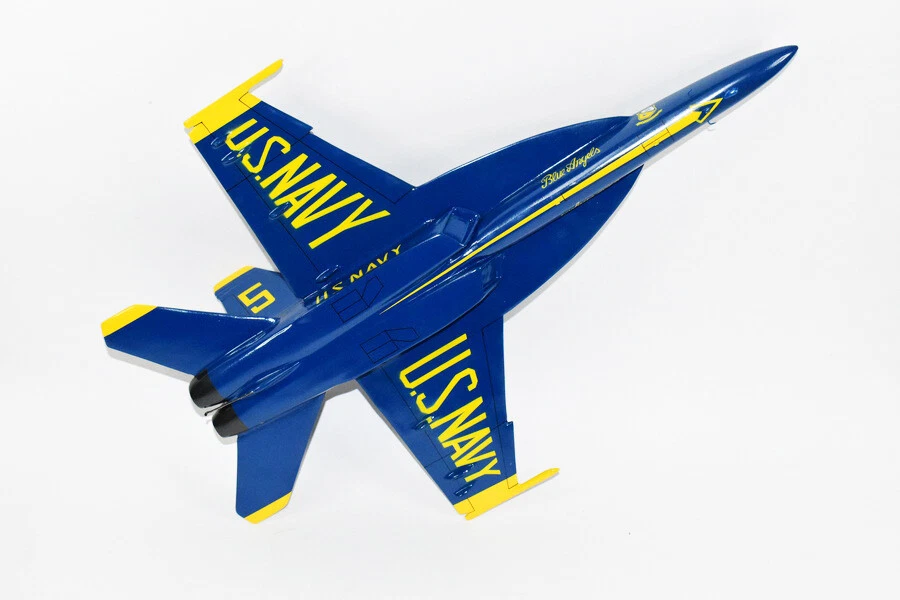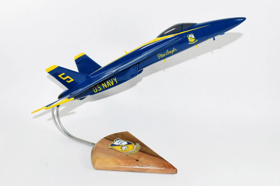 Blue Angels #5 F/A-18E Model Fly with the Blue Angels #5 in this hand crafted F/A-18E Model. Each model is carved from wood and hand painted to provide a unique piece that will always be treasured. Length - 18 inches Made from Mahogany US Veteran Owned Business The product is not intended to be used by children 12 years and younger. The Blue Angels is the United States Navy's flight demonstration squadron which was initially formed in 1946,[1] making it the second oldest formal flying aerobatic team (under the same name) in the world. The Blue Angels' McDonnell Douglas F/A-18 Hornets (numbered 1-6) are currently flown by five Navy demonstration pilots and one Marine Corps demonstration pilot. The BlueAngels typically perform aerial displays annually in at least 60 shows at 30 locations throughout the United States and 2 shows at one location in Canada. The "Blues" still employ many of the same practices and techniques used in the inaugural 1946 season. An estimated 11 million spectators view the squadron during air shows from March through November each year. Members of the Blue Angels team also visit more than 50,000 people in schools, hospitals, and community functions at air show cities. Since 1946, the Blue Angels have flown for more than 505 million spectators. As of November 2011, the BlueAngels received $37 million annually out of the annual DoD budget.