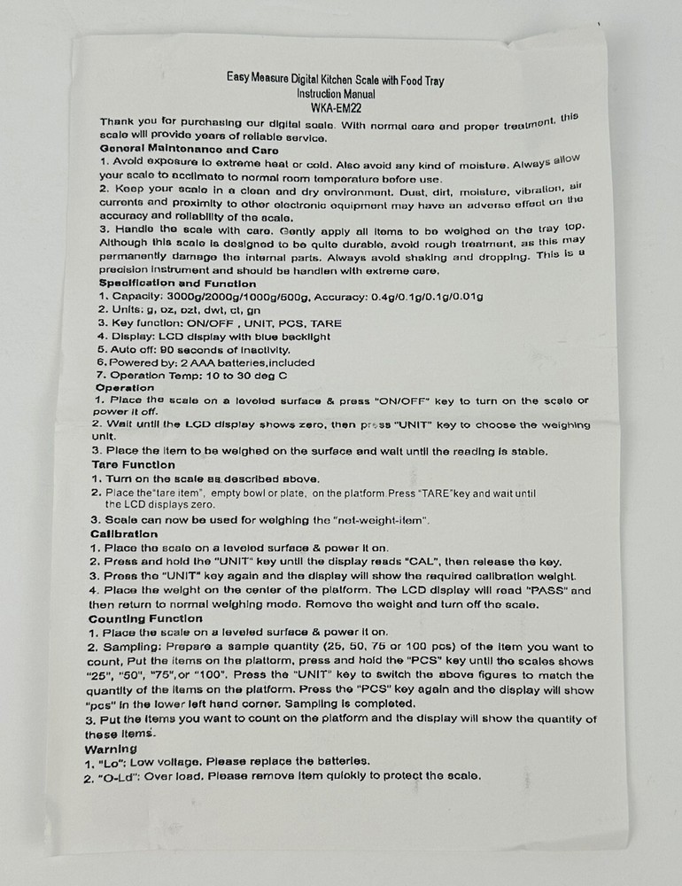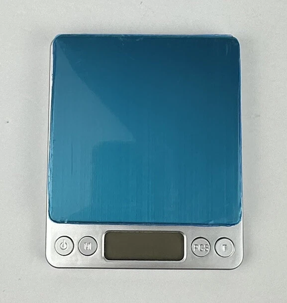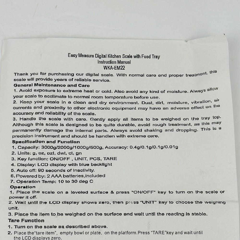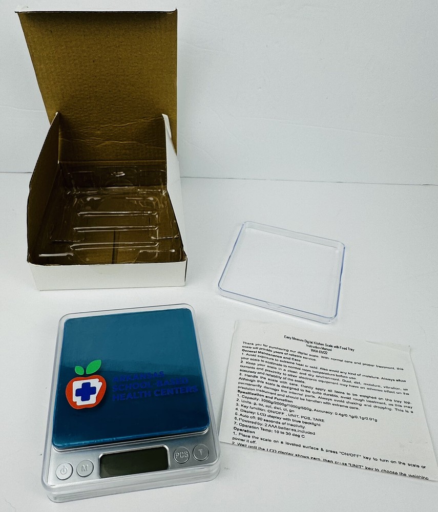 Digital Kitchen Scale with Tray Blue Backlit LCD Display NEW Open This unit has never been used. Still has the plastic covering on the scale. Uses 2 AAA batteries which I removed as I was unsure if they were still charged. Once this item is purchased, new batteries will be added with the unit. Please let me know if you have any questions. I am open to offers!! Feel free to look at other items in my store! Thanks!
