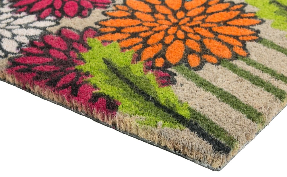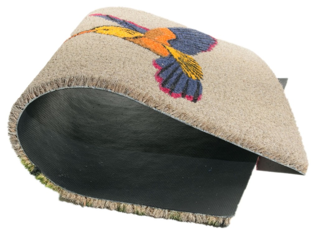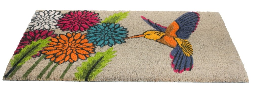 Welcome guests with this lovely doormat boasting a colorful hummingbird & floral design adding a touch of nature to your front door. This doormat is constructed from the best quality coir & printed with water based colors. Coir is the natural fiber extracted from the husk of Coconuts, is relatively waterproof, has superior scrubbing power & is resistant to the elements. The vinyl backing provides reinforcement & prevents the doormat from skidding. With a coir doormat from Decor, you can feel confident dirt & debris will be left at the front door & not in your home. 100% coir fiber Vinyl backing prevents skidding Lovely hummingbird design is painted with water based colors Ideal for moderate to heavy-use traffic areas Measures at 18-inches deep by 30-inches wide by .5-Inches thick