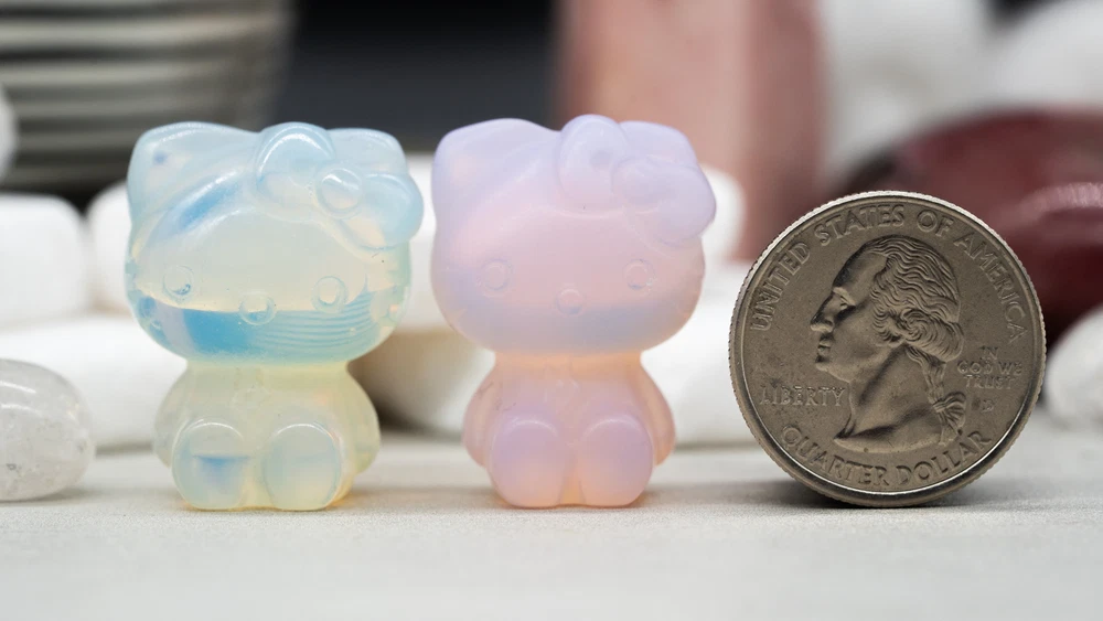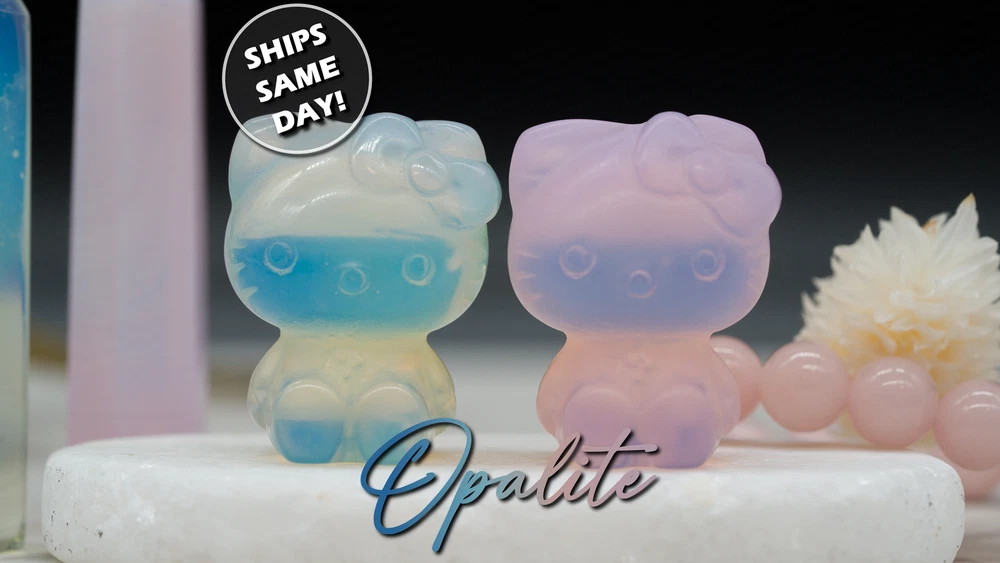 These cute Hello Kitty character fanart carvings are made from opal and pink opalite crystal materials. You will receive one (1) intuitively chosen crystal carving in the color chosen from the drop-down menu, measuring approximately 1.2" high. Example photo has been provided for approximate size reference. Gems and crystals are great for altars, grids, terrariums, pocket stones, gifts, home decorating, jewelry, collecting and more! They are also wonderful additions to meditation, spiritual, and chakra work. Opalite is a subtle yet highly energetic stone and improves communication on all levels, especially in a spiritual aspect. *This listing uses professional photography to provide samples of our collection of products. Each stone is natural, unique and beautiful so please expect slight variations in color, texture, and size. You will receive a product similar to that of the picture, but not the exact product. **Please note that healing crystals are not a replacement for traditional medical treatment and are not meant to replace consulting with a medical professional and do not guarantee any medical cure for any condition. ***This is not an officially licensed Sanrio product, and only features the likeness of Hello Kitty on a fanart basis.