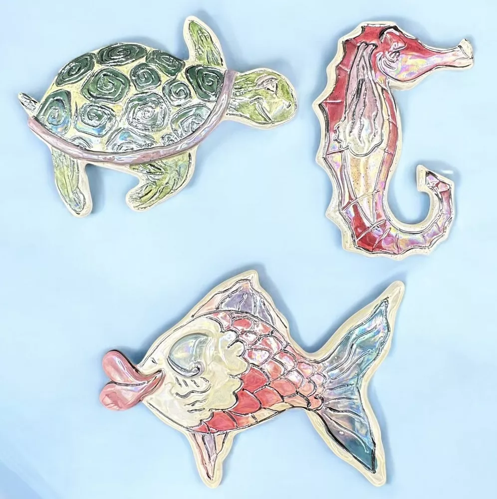 Blue Sky Clayworks Sea Life Set Kissing Fish Seahorse Turtle Nautical Beach Wall Some crazing. See pics.