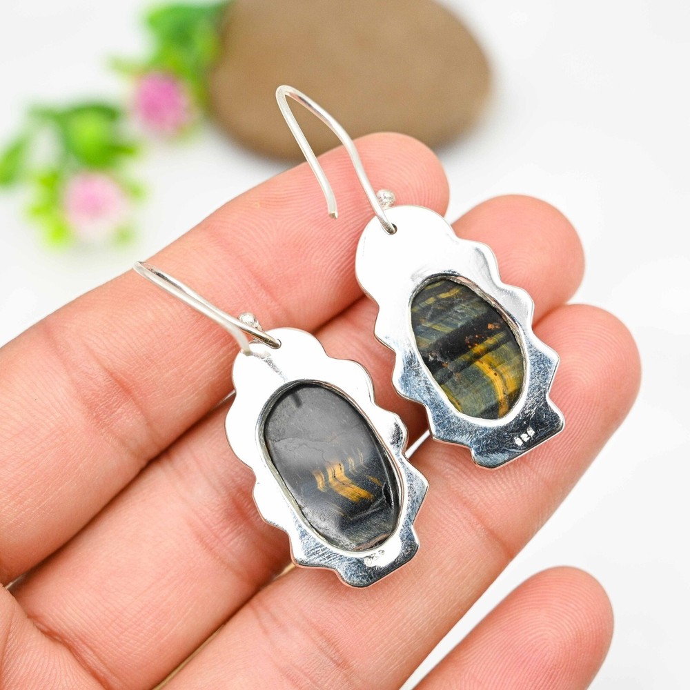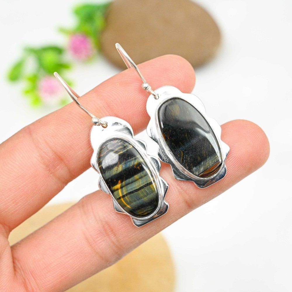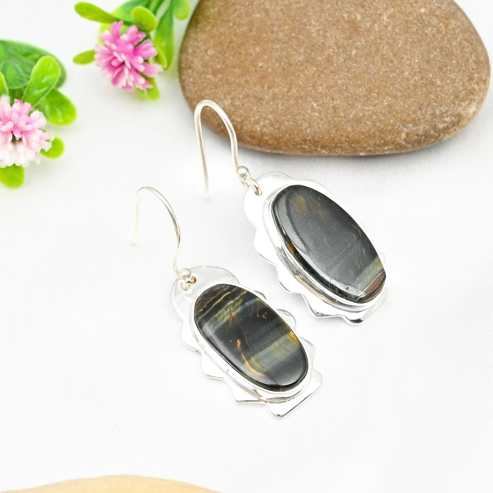 HomeBlue Tiger Eye Dangle Earrings Handmade Sterling Silver Jewelry Gift