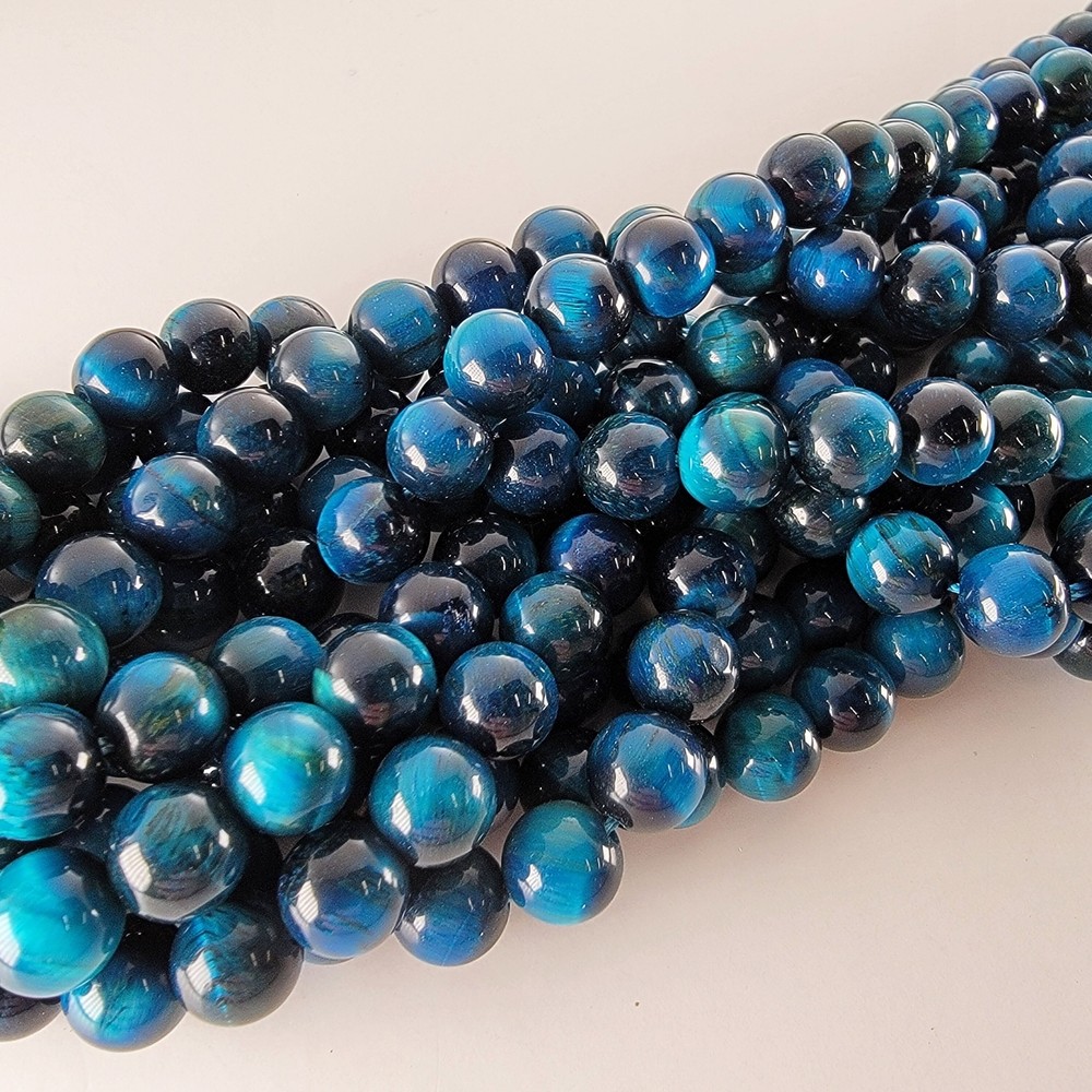 Blue Tiger's Eye natural stone beads, 6mm/8mm/10mm, dyed. MOHS hardness: 7 Stone of Courage. Roman soldiers wore engraved Tiger's eye to protect them in battle. Some say it enhances personal empowerment and inner strength. Said to act as a shield, deflecting negative energies and promoting mental clarity and focus. My goal is to consistently provide the best beads available. You'll always receive excellent quality beads from me and I will never lie to you about their grade. Our photos are taken in-house so you'll always see what you're getting. Details: - Strand length: approximately 15" - Price is per strand. - Bead sizes are approximate and may have a variation of +/- 0.5mm. - Drill hole sizes on MOST beads - 4mm beads: about 0.5mm; 6-8mm beads: about 0.7-0.8mm; 10-12mm beads: about 0.8-1.0mm - Drill hole sizes are approximate and may have a variation of +/- 0.2mm. - All natural gemstones vary in color and pattern. We take our photos in-house so you can see the actual product we carry, but there is some variance between batches. - We generally ship Mon-Fri (except holidays) and try to ship same-day when your order is received before 2pm CST. *Number of beads per 15" strand* Our beads are sold by the strand, not the number of beads. Please use the following chart for reference only for smooth, round beads. 4mm dia - about 90pcs/strand 6mm dia - about 60pcs/strand 8mm dia - about 46pcs/strand 10mm dia - about 39pcs/strand 12mm dia - about 33pcs/strand Return Policy Satisfaction guaranteed with our 14-day return policy. Buyer is responsible for all shipping costs. Returned product must be in salable condition and all beads must be on the original strand.
