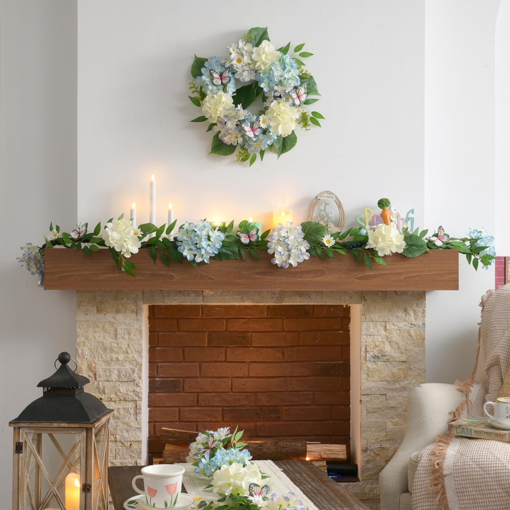 Spring Hydrangeas Wreaths for Front Door with Lights, Blue White Summer Artificial Floral Wreath with Eucalyptus Leaves Butterfly for Home Porch Wedding Party Wall Outdoor Decor-18'' 【Original Design】is a retail brand adhering to original seasonal decorations. Beneath the gentle sunlight, experience the fresh colors of spring intertwined in the designs. In this enchanting Spring Summer season, bring nature’s beauty to your home with —ideal for summer holiday party front door decor. 【Abundant Accessories with High Fidelity】The 18 inch wreath is constructed with a base of real touch branches and adorned with rich elements including soft tough blue and white hydrangeas flowers, white daisy, eucalyptus leaves, realistic butterflies, and more. These elements are skillfully arranged on a natural rattan base, creating a vivid and realistic scene—A stylish accent to make your summer living space bloom. 【Lights with Timer】 This front door wreath is provided with 20 warm LED lights (not pre-lit), offering you the freedom to create a unique lighting arrangement. Switch to the "TIMER" for 6 hours on/18 hours off. (2 AA batteries required, not included). Add a warm, inviting glow to your home this summer with customizable lighting. 【Sturdy Base and Solid Accessories】Crafted with meticulous attention to detail, each component is securely fastened to ensure longevity and resilience against the elements. This Spring Summer wreath will be placed in a box for transportation. No tools are needed, just manually adjust the accessories to expand the wreath. 【Versatile Use】This door wreath is suitable for both indoor and outdoor use. It can be hung on wall, fireplace, window, or placed above the entrance or on a mantel. It can also serve as a centerpiece on a tabletop, offering a warm welcome to family and friends. Additionally, is a thoughtful gifts for Mother’s Day, weddings, anniversaries or Spring Summer daily home decorations. 【More Options】The flower wreath pairs perfectly with our Spring Summer garlands, allowing you to create a harmonious and visually appealing home look.