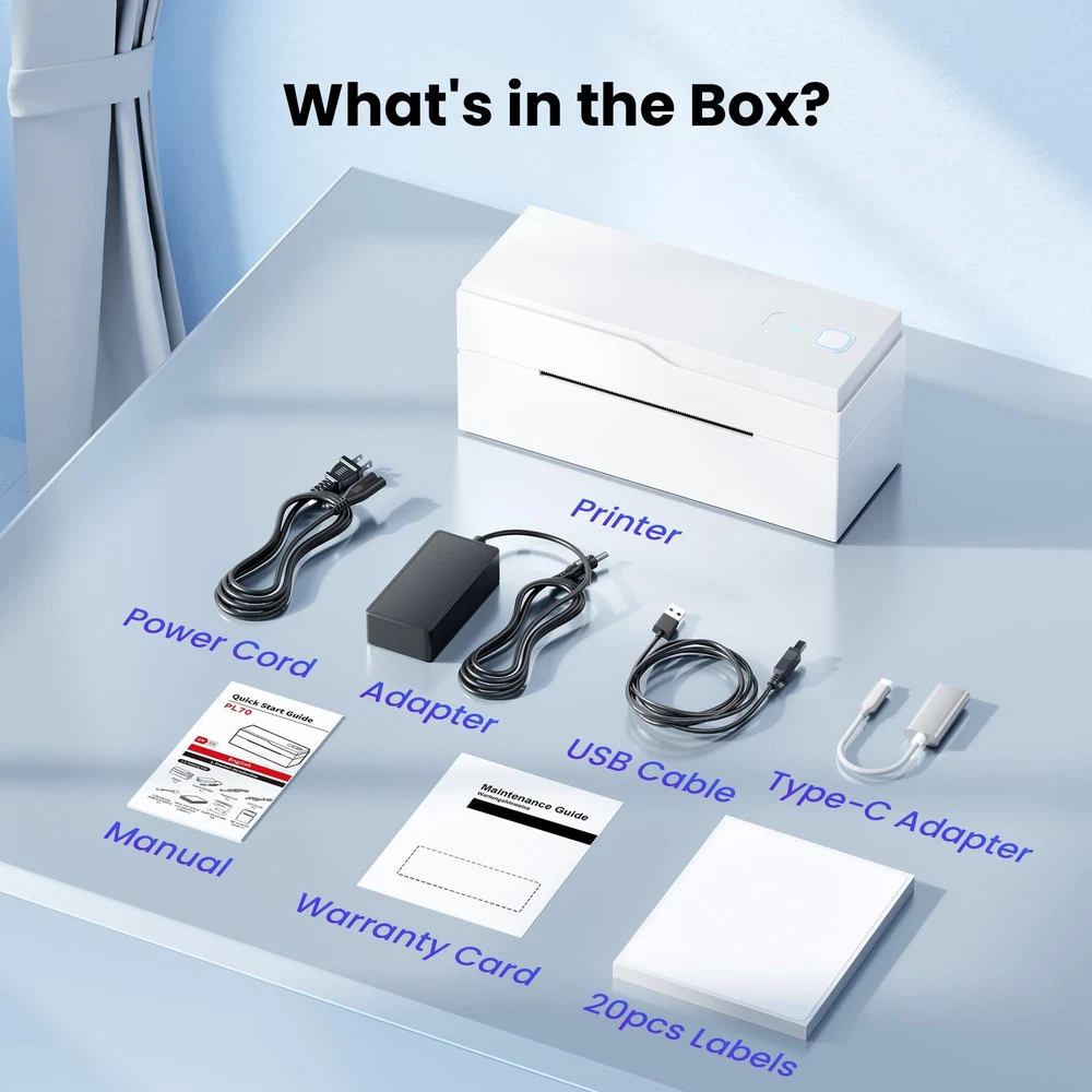 Transform your organization game with this versatile label printer designed for both home and office use. This efficient printing companion helps you create clear, professional-looking labels for files, storage containers, shipping packages, and more. With its compact design, it fits perfectly on any desk while delivering crisp, easy-to-read text that stays put. Whether you're managing a home office, running a small business, or simply trying to keep your pantry organized, this label printer streamlines your labeling tasks. The printer works quickly and quietly, letting you create custom labels in various sizes to suit your specific needs. Perfect for addressing envelopes, creating name tags, organizing files, or marking storage bins, this label printer helps bring order to chaos with minimal effort. Save time and maintain a polished, professional appearance in all your organizational projects with this practical labeling solution. Effortless Connectivity: The upgraded PL70 shipping label printer features both Bluetooth and USB connectivity, ensuring smooth direct printing via Bluetooth. Download the “Labelife” app for a reliable connection that sets up in just one minute for quick and hassle-free printing Clear, Inkless Printing: Experience sharp outputs with a 203DPI resolution that requires no ink—just thermal paper! Enjoy fast printing speeds of 150mm/s, producing up to 72 labels (4"x6") or 144 labels (2"x2") per minute without any paper jams Compact and Portable Design: Weighing just 0.79kg (1.74lb) and measuring 8.4"x3.2"x3.7", this thermal label printer is designed for portability. It’s perfect for small businesses and online sellers, compatible with popular platforms like Amazon, eBay, Shopify, USPS, UPS, Etsy, PayPal, and Poshmark Versatile Label Compatibility: This thermal printer supports a range of label sizes from 1" to 4.7" (25.4mm to 120mm), including shipping labels, mailing labels, price tags, barcode labels, name tags, and more, meeting all your shipping needs Professional Customer Support: Our dedicated support team is focused on providing outstanding technical assistance for our valued customers. The thermal printer also comes with a detailed user guide to ensure a smooth setup and user experience. Please note: the printer is compatible only with thermal paper