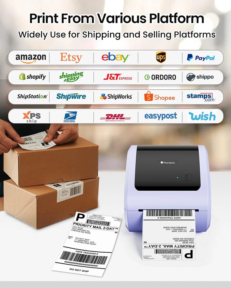 Phomemo D520-BT Bluetooth thermal shipping label printer. Product Overview - Brand: Phomemo - Model: D520-BT - Printing Technology: Thermal - Connectivity: Bluetooth and USB - Output: Monochrome - Maximum Print Speed: 150mm/s - Effective Print Width: 108mm - Printing Resolution: 203 DPI - Weight: 1.1kg - Dimensions: 175×218×157mm (L×W×H) Key Features 1. Large Built-in Paper Bin : - Equipped with a large inner paper bin, eliminating the need for a separate label holder. - Supports both fanfold and roll labels, providing flexibility in label choices. 2. Cost-Saving and Eco-Friendly : - Utilizes thermal direct technology, eliminating the need for ink or toner. - Provides a clean and environmentally friendly printing solution. 3. Wireless Printing : - Supports Bluetooth connectivity with smartphones and tablets via the "Labelife" app. - Compatible with iOS and Android devices. - Also supports USB connection for PC (Windows, Mac, Linux, Chrome OS), with driver installation required for PC printing. 4. Wide Platform Compatibility : - Compatible with major sales and shipping platforms like Amazon, eBay, Shopify, USPS, UPS, Etsy, etc. - Supports label widths from 1 to 4.6 inches, suitable for both fanfold and roll labels. - High printing speed of up to 72 labels per minute, enhancing work efficiency. 5. Advanced Technology : - Equipped with the latest AF chip and high-tech thermal print head for stable and high-quality printing. - Easy and simple operation, suitable for printing documents, photos, and more. Setup Instructions for Chrome OS 1. Connect the printer to the computer using a USB cable and turn on the printer. 2. Open the Chrome Web Store and search for "Labelife". 3. Add the Labelife extension to your Google Chrome browser. 4. Open the Labelife extension, click "Add" to discover the printer, and configure the settings. 5. Open the file you want to print in Google Chrome, press "Ctrl + P" to open the print interface, select the printer, and start printing. Benefits - Convenience : Wireless connectivity and compatibility with multiple devices and platforms make it easy to print labels on the go. - Efficiency : High printing speed and compatibility with various label types and widths ensure smooth workflow. - Cost-Effective : No need for ink or toner, reducing operational costs. - Versatility : Suitable for a wide range of applications, including e-commerce, logistics, and office environments. This printer is an excellent choice for businesses and individuals looking for a reliable, efficient, and cost-effective solution for printing shipping labels.