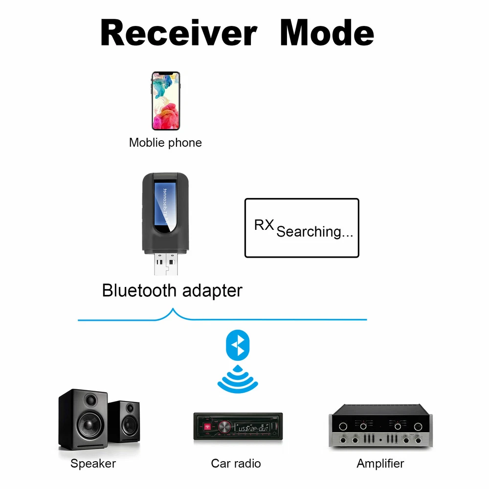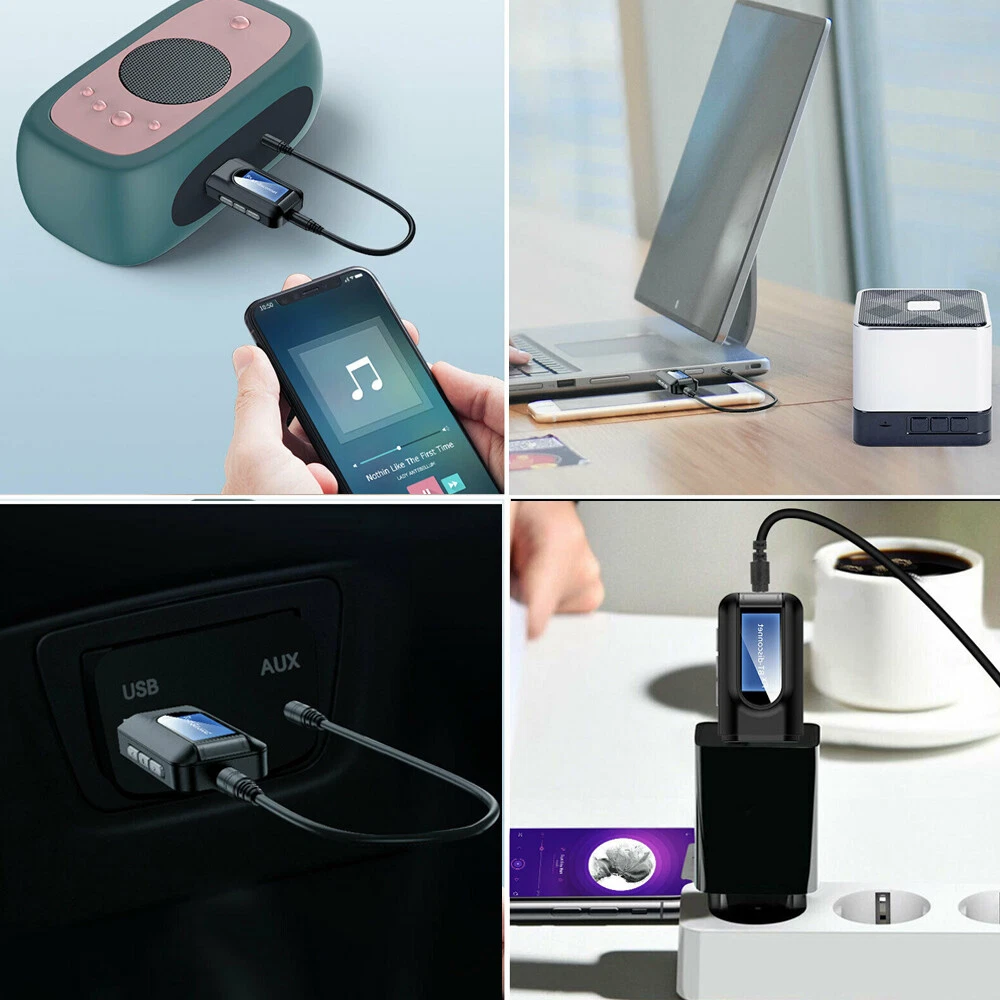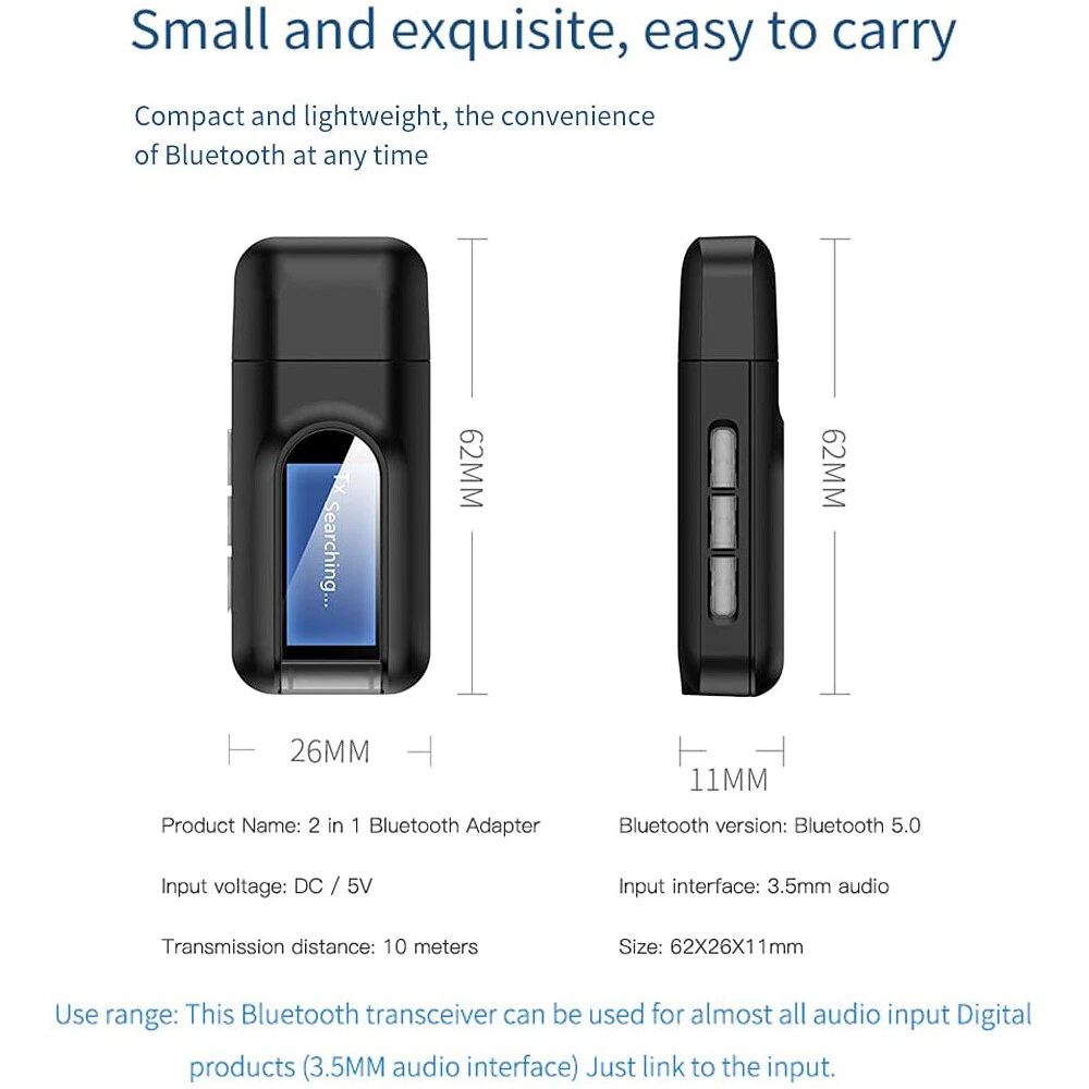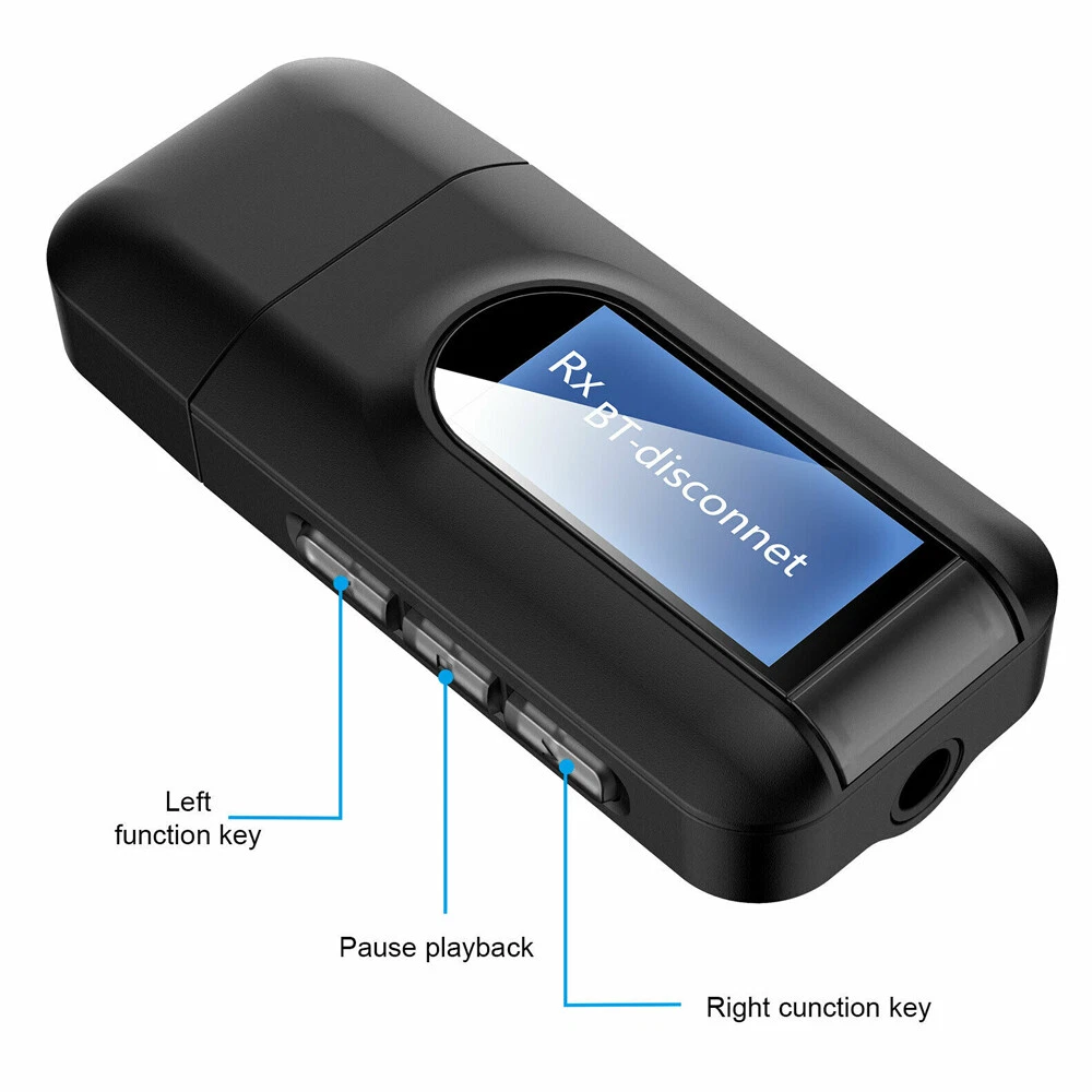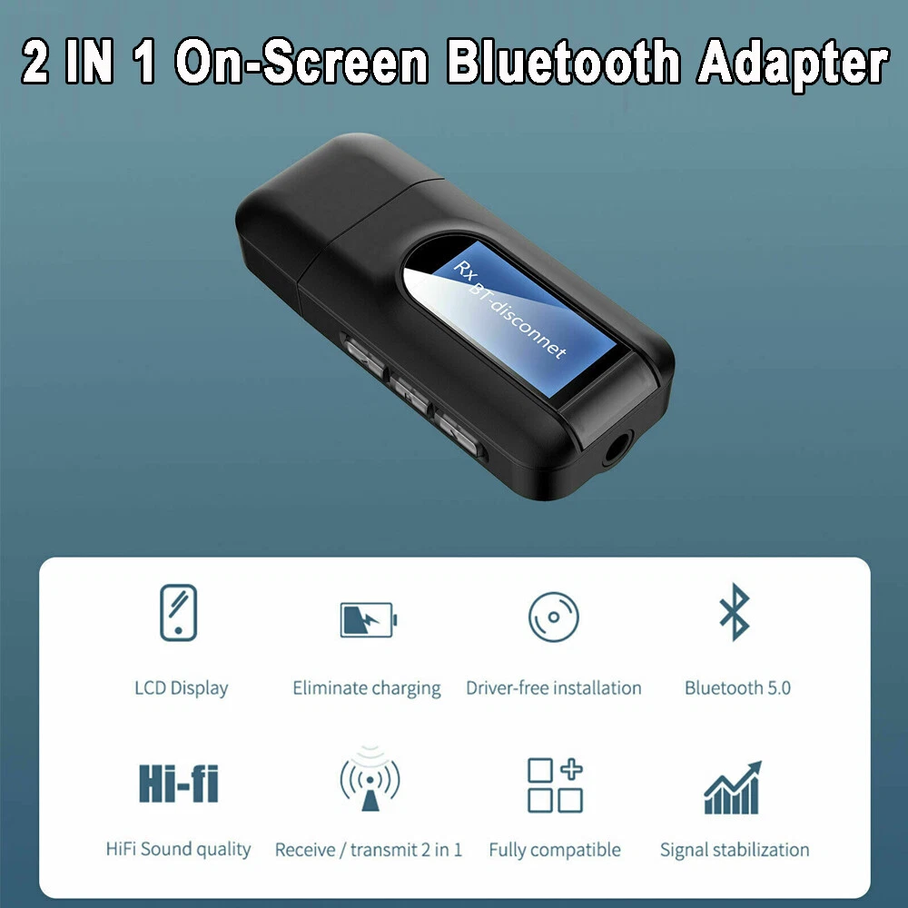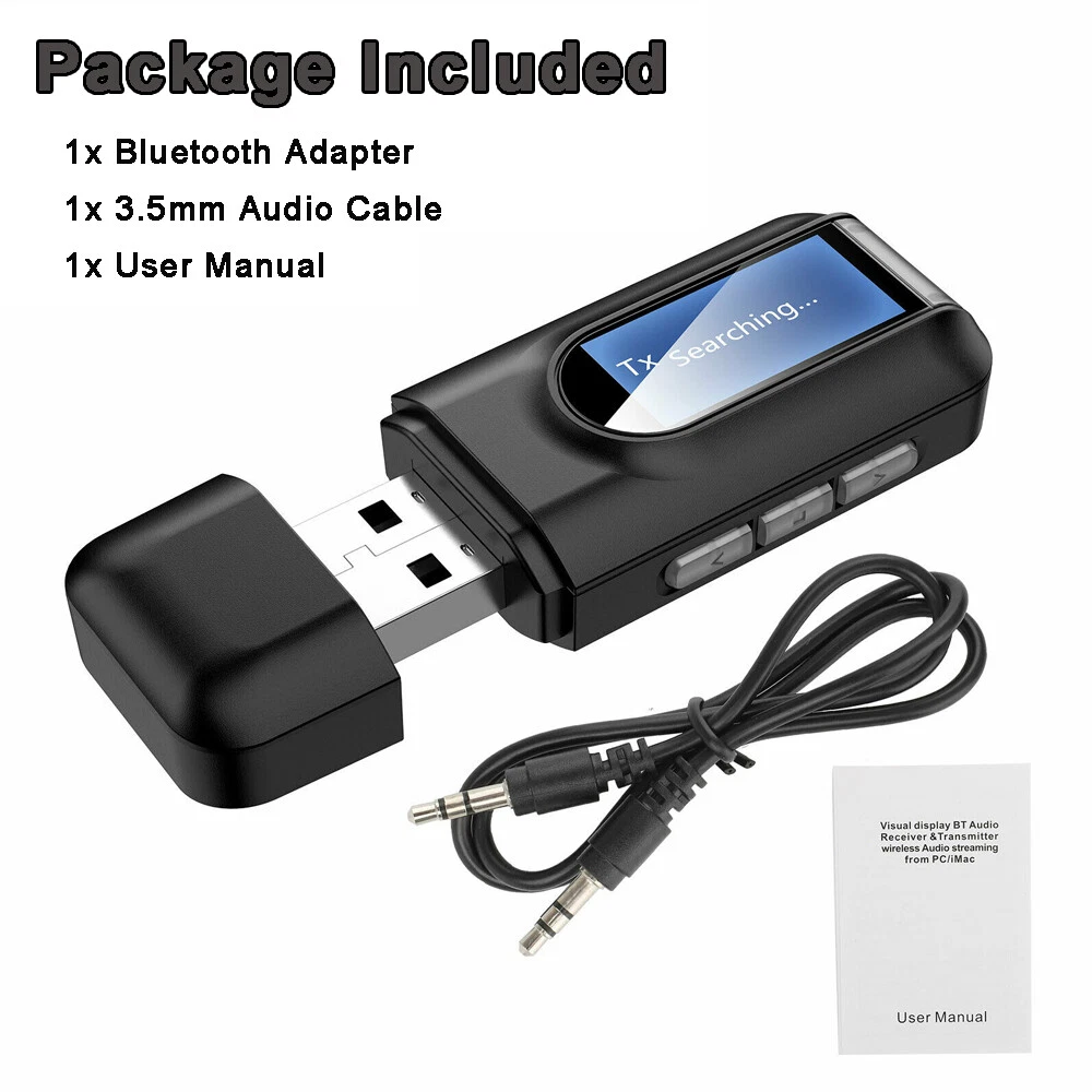 Bluetooth 5.0 Adapter 3.5mm Jack Wireless Transmitter Receiver for TV Audio PC Description: đ New Design: The first Bluetooth receiver with a LCD display screen has come. You can have all the information of the wireless streaming status from a simple glance at the screen. It shows Bluetooth connection status. đ Bluetooth 5.0 Receiver: Installed with Bluetooth 5. 0 chip, VIKEFON new wireless music receiver has an unrivalled performance with 2 times faster transmission speed, stronger connection stability and wider signal range of 10M than the older version. đ Bluetooth Compatible: This audio Bluetooth adapter support 3.5mm aux audio, and also compatible with all smartphones, bluetooth audio devices (Bluetooth headphones, Bluetooth speakers and much more). đ Transmitter Receiver Mode: 2in1 design, by using this wireless adapter, you can send and receive all of the audio freely and easily. Transmitter enables your TV, AV Receiver, Radio and other home audio source devices to stream music to your Bluetooth headphones or speakers; Receiver lets non-Bluetooth devices like your home stereo or AV Receiver and wirelessly stream music from your cellphone/PC. đ Clear Sound: A2DP support voice prompts, gets high-quality audio sound, offers you 30 feet operation range with good performance, gives you a good experience when answering the phone or watching late-night shows. In order to get clear sound, we recommend NOT using the 3.5mm Bluetooth transmitter-receiver while charging. Wireless Function: Want to watch football/baseball / Boxing / Golf / NBA game late at night without waking anyone up? This is a great chose for you. Bluetooth transmitter function wirelessly streams audio to Bluetooth speakers or headphones from your TV or older media devices like portable CD players that lack built-in Bluetooth. Specification: Colour: Black Type :2 IN 1 Bluetooth Adapter Bluetooth version:Bluetooth v5.0 Function: Bluetooth audio receiving and transmitting combo Built-in noise reduction HIFI sound quality Transmission Distance: 10M Input interface: 3.5mm audio Input voltage: DC/5V Drive: No need to drive, plug and play Power Supply: no built-in battery, external power supply Size:62x26x11mm/2.44*1.02*0.43in Features: âď¸ăBluetooth Transmitter Receiveră1. Transmitter mode (TX): Transmit audio from non-Bluetooth audio sources (TV, PC, CD player, etc.) to Bluetooth headset/speaker via 3.5mm audio cable. 2. Receiver mode (RX): Transmit audio from Bluetooth audio sources (smartphones, tablets) to non-Bluetooth headsets/speakers/cars/home audio systems via 3.5mm audio cables.In receiving mode,you can adjust the volume,play up and down,etc. âď¸ăBluetooth 5.0ăBy connecting the adapter to non-Bluetooth devices, wireless connection with various Bluetooth devices can be realized. The Bluetooth 5.0 chip ensures strong signal transmission, low latency, high sound quality, high fidelity chip, stable transmission without jams, and a maximum connection range of 10m (without obstacles). Built-in AEC noise reduction and ANC noise reduction circuit to restore pure sound quality. âď¸ăTV with bluetooth headsetăBring a bluetooth headset and watch the drama late at night without fear of affecting your family.Instantly turn into a bluetooth speaker.just insert it lightly,the traditional speaker is instantly resurrected with blood. âď¸ăEquip your car with an artifactăIf youe car's bluetooth is broken or there is no bluetooth,just plug it in and use. âď¸ăUSB Power SupplyăUSB has a power supply function. When in use, it is powered by a power supply device with a USB port (such as AC adapter, car charger, laptop). As long as the Bluetooth audio adapter is plugged in, you don't have to worry about it being powered off during use. âď¸ ăTX transmission modeăNew upgrade adds LCD display,can search and display 8 nearby bluetooth device for you to choose to connect,more intuitive and convenient to use. âď¸ ăEasy to useăTwo-in-one design Bluetooth adapter combines Bluetooth audio transmitter and receiver with 3.5mm Aux jack into one. Long press the left and right function keys to switch modes, easy to use, and suitable for a variety of devices. Without any driver, plug and play, Bluetooth fast matching connection, more convenient to use. âď¸ăSmall and Exquisite,Easy to CarryăCompact and lightweight,the convenience of bluetooth at any time. âď¸ăPackage includedă1 * Bluetooth 5.0 transmitter/receiver, 1 * 3.5 mm audio cable, 1 * user manual, 1 * packing box. You can contact us at any time for any questions about the product, and we will answer you within 24 hours. Package Included: 1xAudio Adapter 1xAudio Cable 1xManual ăService GuaranteeăThanks for visiting our Store! We try to accurately describe our item to the best of our knowledge, if there is any incorrect, please feel free to let us know via message. If you have any problem or concerns,we hope you can contact us via message,before you decide to leave neutral or negative feedback or open return request or case. When we see your email at work, we will reply to you as soon as possible. Payment Delivery details Terms of sales About us Contact us Payment 1.We only accept PayPal as payment method. 2.The item will be shipped to buyerâs CORRECT and VERIFIED Ebay Address. 3.We are not responsible for the package lost due to incorrect address. 4.Our price do not including any custom or duty, VAT and local tax. 5.Payment must be received within 7 days of winning the auction 6.Please contact us if you need file an extension for any late payment. Delivery details 1.All item are shipped via DHL eCommerce or USPS Frist Class express Service within 2 business days once full payment is settled.If you can't get your items in time,please contact to us first,we will check and solve it for you soon.We will reply your mail within 24 hours normally. Sometimes have a little delay due to the weekend or holiday.If you can't get our mail after 48 hours,please che