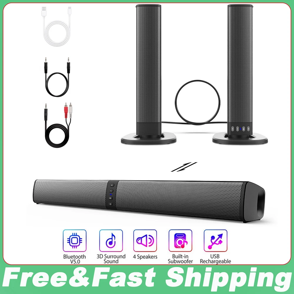 Bluetooth 5.0 Home TV Sound Bar Speaker System Wireless Subwoofer 3D Surround Package: Soundbar Bluetooth speaker * 1 TYPE-C charging cable * 1 English manual * 1 Specification: Material: ABS plastic + metal mesh cover Color: black Number of speakers: 4 Single power: 5w Total power: 20w Bluetooth version 5.0 Bluetooth connection distance: <10m Signal-to-noise ratio: ≥75dB Waterproof level: IP4 Input voltage: DC5V 1A Rated voltage: 3.7V Frequency: 20HZ--20KHZ Radio frequency: 87.5Hz-108Hz Function: Bluetooth, TF card, AUX, FM, USB TWS mode: After turning on the two devices, long press the mode switch button on one of the devices until a prompt sound appears, wait for 3S for a ding-dong sound to appear, and the two devices are successfully matched Key interface: power on/off button, pause/ Play button, volume adjustment button Port interface: TYPE-C charging port, 3.5mm AUX port, SD card input port Battery: Built-in 18650 battery, 2000MAH Full charge: about 3.5h Maximum sound endurance: about 2h Support TV/computer/tablet/notebook, desktop computer/MP3/MP4/DVD player Delivery details Payment Terms of sales Feedback Contact us Delivery details 1. BUSINESS DAY MONDAY- FRIDAY FAST SHIPPING FROM USA. 2. All orders and payments received before 4PM EST (1PM PST) will be shipped the same business day. 3. No shipping on Saturday,Sunday or USA Public Holidays 4. No responsibility for any custom duty Payment We accept payment by PayPal only. Terms of sales 1. We offer a 60 day money back guarantee or exchange. 2. Buyer pays return shipping and we pay replacement shipping. 3. If you want to initiate a return,please contact us to get a returning address before sending the item back. Feedback 1. We strive to provide the best products and services. 2. Your positive feedback 5 stars DSR help us do better. 3. If anything about your transaction did not meet expectations, please CONTACT US and give us the opportunity to make things right. We are always here to help. Contact us Please do not hesitate to CONTACT US . You can message 24/7 on eBay for all questions and inquiries. We will get back to you within one business days at the latest from Monday- Friday.