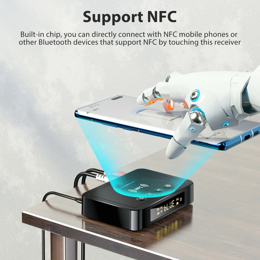 You may also like 8 in 1 USB-C Hub Type C To USB 3.0 4K HDMI PD Adapter For iPhone Macbook Pro/Air 13.99 USD Free shipping Support 128GB Bluetooth MP4/MP3 Lossless Music Player FM Radio Recorder Sport 22.97 USD Free shipping Lot 100 Multi Colors Cross Stitch Floss Cotton Thread Embroidery Sewing Skeins 14.99 USD Free shipping 6Pcs Ultrasonic Pest Repeller Control Electronic Repellent Mice Bug Rat Reject 12.99 USD Free shipping Bluetooth Earbuds Headset TWS5.3 Inear Wireless Earphone Invisible for All Phone 16.99 USD Free shipping 175°WiFi Wireless Car Rear View Cam Backup Reverse Camera For iPhone Android IOS 19.99 USD Free shipping Product Feature ✅ The Latest Bluetooth 5.0 Version : Compatible with Bluetooth 5.0, backward compatible with Bluetooth 4.2 / 4.1 / 4.0 / 3.0 / 2.0 / 1.0. ✅ LED High-definition Digital Display : Real-time status at a glance, Innovatively equipped with LED display, Bluetooth receiving/transmitting/FM status is clearly visible orange light, soft and not dazzling. ✅ 5-10m Long-distance Control : Highly sensitive infrared remote control Remote control, worry-free, and labor-saving, clear functions, one-key operation ✅ Support NFC : Built-in chip, you can directly connect with NFC mobile phones or other Bluetooth devices that support NFC by touching this receiver. ✅ The First Receiver with Ambient Light : When you turn on the power, our NFC Bluetooth receiver will have a colorful ambient light to light up. What follows is to give you a feeling of rendering the atmosphere and also help you to Operate the secondary device in the dark. Multi-interface selection to meet the needs of various equipment: Rich interfaces and diverse gameplay. Built-in digital to analog chip, easily support all kinds of audio equipment, AUX/RCA/Optical/ Coaxial interface plug and play ✅ Remote Wireless Connection : Effective distance up to 120 meters, control long-distance music playback. ✅ Support Automatic Turn on/off : Use the charger cable to connect to the car or other power sources. When the car starts or has electricity, it will automatically turn on and automatically connect to the last connected device. When the car is turned off, it will automatically turn off. Product Specification Product Name NFC multi-function Bluetooth adapter Product version Standard/Remote Bluetooth Version Bluetooth V5.0 Battery 3.7V/500mAh Using Time Listen to music for about 10 hours and stand by for 30 days Transmission Range 10m (barrier-free) Interface 3.5mm AUX/2RCA/COAXIAL/OPTICAL Input Parameter DC 5V-2.1A(MAX) Support Protocol A2DP/AVRCP Product Dimension about 92*65*20mm Using Method Drive free Product Color Black Product Material High strength fireproof PC Product Weight Standard version Basic Functions Bluetooth reception, Bluetooth launch, U-disk playback, TF card playback, infrared remote control, key operation, digital fiber / coaxial input, NFC Support Devices All kinds of speakers, desktop computer, laptop, TV, power amplifier, projector Product Type Standard/Remote Package Included 1 x NFC Bluetooth Receiver 1 x Remote Control 1 x 3.5MM Audio Cable 1 x RCA Audio Cable 1 x Charging Cable 1 x User Manual