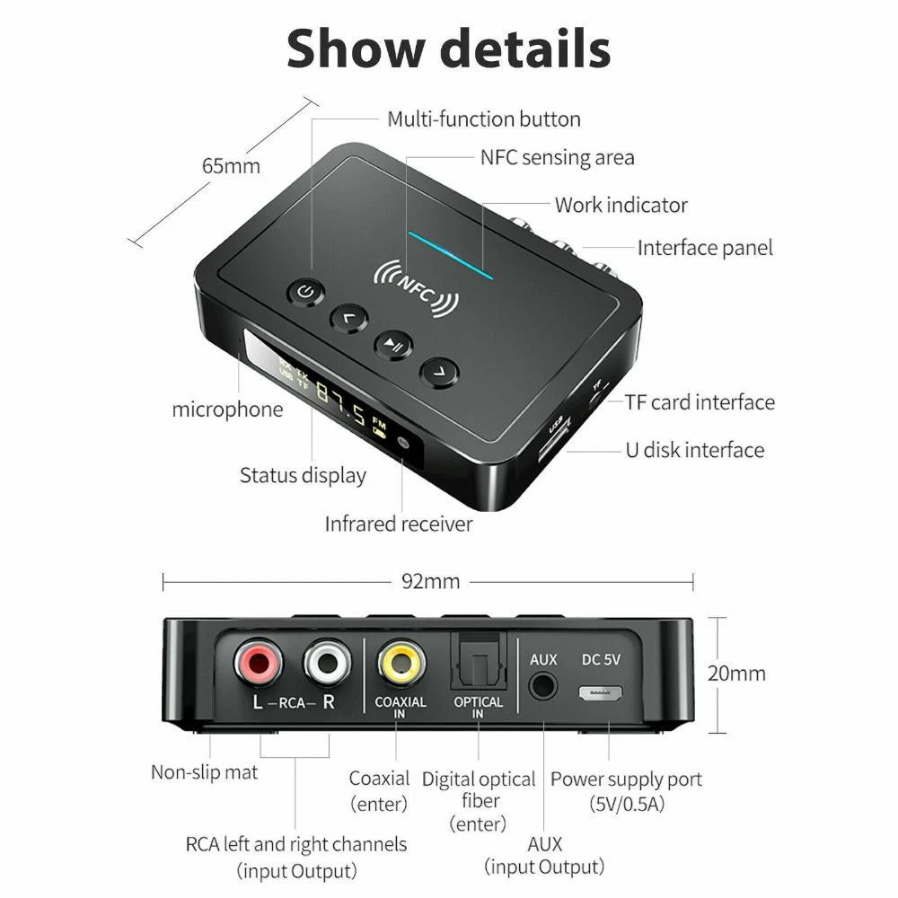 You may also like Round 8 Pin To RJ45 Microphone Adapter Cable for Yaesu FT450D FT897D FT991 FT891 13.88 USD Touch Pen Tips Removal Tweezer+Stylus Nib For Galaxy Z Fold 3 S Pen Fold Edition 5.99 USD 3.69 USD For NVMe SSD Converter Expansion Card SFF-8639 PH46 PCIE X4 Expansion Adapter 20.69 USD 20*10cm RF Signal Blocker Anti-Radiation Shield Case Bag Pouch For Cell Phone 11.39 USD LCD Display Screen Replacement Part For Nikon Coolpix B500 Digital Camera 23.99 USD 3.69 USD Portable Cable USB Data Sync Charger For Garmin Forerunner 935/Fenix 5 5S Watch 4.99 USD 3.69 USD Product Description Features: The Latest Bluetooth 5.0 Version: Compatible with Bluetooth 5.0, backward compatible with Bluetooth 4.2 / 4.1 / 4.0 / 3.0 / 2.0 / 1.0. LED High-definition Digital Display: Real-time status at a glance, Innovatively equipped with LED display, Bluetooth receiving/transmitting/FM status is clearly visible orange light, soft and not dazzling. 5-10m Long-distance Control: Highly sensitive infrared remote control, worry-free, and labor-saving, clear functions, one-key operation Support NFC: Built-in chip, you can directly connect with NFC mobile phones or other Bluetooth devices that support NFC by touching this receiver. The First Receiver with Ambient Light: When you turn on the power, our NFC Bluetooth receiver will have a colorful ambient light to light up. What follows is to give you a feeling of rendering the atmosphere and also help you to Operate the secondary device in the dark. Cool breathing light, red/blue double color, the light is not dazzling. Multi-interface selection to meet the needs of various equipment: Rich interfaces and diverse game play. Built-in digital to analog chip, easily support all kinds of audio equipment, AUX/RCA/Optical/ Coaxial interface plug and play Remote Wireless Connection: Effective distance up to 120 meters, control long-distance music playback. Support Automatic Turn on/off: Use the charger cable to connect to the car or other power sources. When the car starts or has electricity, it will automatically turn on and automatically connect to the last connected device. When the car is turned off, it will automatically turn off. Specifications: Product Name: NFC multi-function Bluetooth adapter Product version: Standard/Remote Bluetooth Version: Bluetooth V5.0 Battery: 3.7V/500mAh Using Time: Listen to music for about 10 hours and stand by for 30 days Transmission Range: 10m (barrier-free) Input: 3.5mm AUX+RCA+Optical+Coaxial+USB+TF interface Output: 3.5mm AUX+RCA Input Parameter: DC 5V-2.1A(MAX) Support Protocol: A2DP/AVRCP Product Dimension: about 92*65*20mm/3.62*2.60*0.79" Using Method: Drive free Product Color: Black Product Material: High strength fireproof PC Product Weight: Standard version Basic Functions: Bluetooth reception, Bluetooth launch, U-disk playback, TF card playback, infrared remote control, key operation, digital fiber / coaxial input, NFC Support Devices: All kinds of speakers, desktop computer, laptop, TV, power amplifier, projector Package includes: 1* NFC Bluetooth Receiver 1* Remote Control 1* 3.5MM Audio Cable 1* RCA Audio Cable 1* Charging Cable 1* User Manual Shipping Returns Contact Us Payment 1. Items sent from US warehouse. 2. Receiving time = Processing time + Shipping time. 3. Processing Time: Around 1-2 business Days. 4. Shipping Time: 3-5 business day. It may have a little delay during some holiday (such as Christmas), any problem, please feel free to contact. Always believe we can figure things out with communication, if it comes to return, the pacakge must be intact and the same as you receive. If you have any questions, please feel free to email our service specialists 24 Hours a Day, 7 Days a Week. We will reply you ASAP. Return/refund is accepted within 30 days after the buyer receives the item. NO exchange will be accepted after 30 days from the date when the item is received. Please contact us first before returning your product!!! If you have any questions, our Customer Service staffs welcome you to email us. We strive to answer all questions and resolve any problems as quickly as possible. We care about our valued customers, and will always try to help you. So if you have any problems, You can contact us 7*24, we will reply at the first time. We accept all verified payments from ebay. Orders will be shipped after receiving cleared payment. Shipping 1. Items sent from US warehouse. 2. Receiving time = Processing time + Shipping time. 3. Processing Time: Around 1-2 business Days. 4. Shipping Time: 3-5 business day. It may have a little delay during some holiday (such as Christmas), any problem, please feel free to contact. Returns Always believe we can figure things out with communication, if it comes to return, the pacakge must be intact and the same as you receive. If you have any questions, please feel free to email our service specialists 24 Hours a Day, 7 Days a Week. We will reply you ASAP. Return/refund is accepted within 30 days after the buyer receives the item. NO exchange will be accepted after 30 days from the date when the item is received. Please contact us first before returning your product!!! Contact Us If you have any questions, our Customer Service staffs welcome you to email us. We strive to answer all questions and resolve any problems as quickly as possible. We care about our valued customers, and will always try to help you. So if you have any problems, You can contact us 7*24, we will reply at the first time. Payment We accept all verified payments from ebay. Orders will be shipped after receiving cleared payment. Black 2x1 4K 120Hz 8K USB3.0 HDMI KVM Switcher 2 In 1 Out For MAC, For Linux, 56.99 USD 3.69 USD Remote Control Scrolling Ring Wireless Camera Shutter Selfie Button Controller 6.29 USD 3.69 USD Radio USB Programming Cable For Motorola CM140 GM338 GM340 GM360 CP150 EP450 26.99 USD 3.69 USD M.2 NVME PCIe SSD Enclosure SSD to Type-C USB USB3.0 Adapter Reader Converter. 24.99 USD 3.69 USD M.