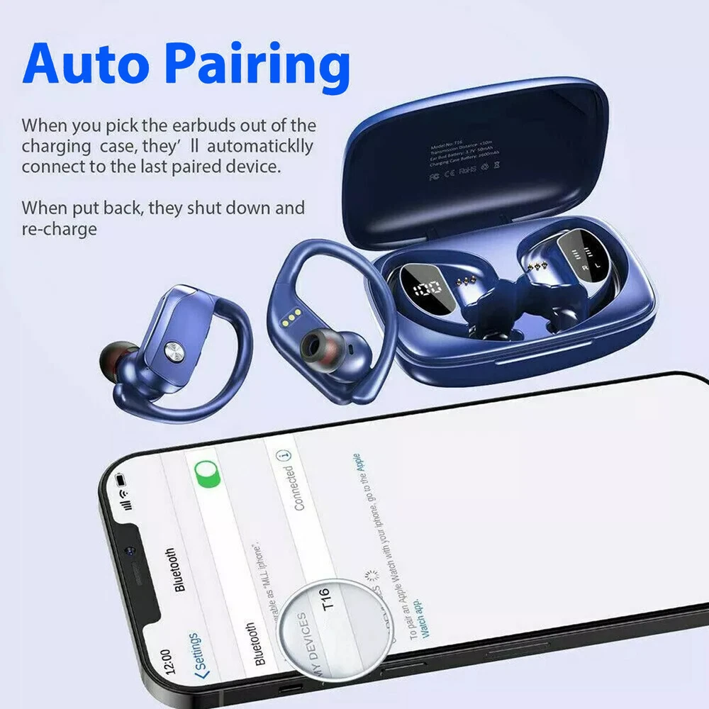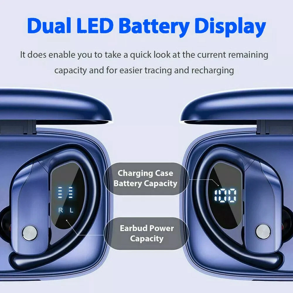 Bluetooth 5.0 True Wireless Earbuds With Mic Headphones Earhook Sport Running Wireless Earbuds,Wireless Headphones HiFi Stereo Earphones 5 hours Playtime In-Ear Earbud, Bluetooth 5.0 Sport Earphones with LED Power Display for Android iOS Blue Note : There is a little plastic coating over the charging pins. pls take it off before use . Specifications: Product Name: TWS Bluetooth Headset Bluetooth Version: 5.0 Power Input : DC 5V Headset Battery Capacity: 3.7V/ 50mAh Call/Play Time: About 5 hours Charge Box Battery Capacity: 3.7V/ 600mAh Support Agreement: HSP/HFP/A2DP/AVRCP Sensitivity: 103+3dB Frequency Response Range: 20Hz-20KHz Charging Time (h):About 2hs Taking Time: 4-5hs Standby Time (h):15days Transmission Distance:10m Charging Criteria:With Charging Case Features: 1.Totally wireless high-performance earphones 2.Up to 5 hours of listening time( more than 30 hours with charging case) 3.Adjustable, secure-fit earhooks for lightweight comfort and stability 4.Reinforced design for sweat & water resistance during tough workouts 5.Volume & track controls on each earbud, voice capability, and auto play/pause 6. Dual LED Displays Charging Case: Wireless earbuds with LED display make it obvious to show the battery power of the case and ear buds. The remaining power in percentage on the screen is shown to the left of the bluetooth headphones. The right side is assigning to a charging process of each bud, there are separated power consumption indicators by 4 grids in total, each grid represents 25% power of bud. During Charging, the LED indicator light will flash. 7. Automatic Pairing and Touch Control: The Bluetooth in-ear headphones will automatically pair with each other when you open the charging box and automatically connect to the last paired device. The range can reach up to 33ft/10m away. When you put it back, the bluetooth earphones shut down and are recharging. Wireless bluetooth headphones Together with smart touch sensors, the true wireless headphones can achieve the ultimate control. Play/pause music, answer/end a call, adjust volume, next/previous track.... 8. Ergonomic Design and IP6 Waterproof: Aoslen Wireless Bluetooth Earphones, ergonomically designed to be very light and easy to carry. (S/M/L) 3 different sizes of ear caps, designed for different ear shapes to ensure a comfortable fit. This headset is IP6 Waterproof, Can withstand accidental splashes of water, sweat or raindrops, Very suitable for sports, training, running, etc Package Includes: 2 x Bluetooth Earbuds 1 x Charging Box 1 x Charging Cable 1 x User Manual 3 x Ear Cap Sets (Small, Medium, Large) 【Service Guarantee】Thanks for visiting our Store! We try to accurately describe our item to the best of our knowledge, if there is any incorrect, please feel free to let us know via message. We hope you can contact us via message with any issue before you decide to leave neutral or negative feedback or open return request or case. We will reply to you as soon as possible when we see your email at work. Payment Delivery details Terms of sales About us Contact us Payment 1.We only accept PayPal as payment method. 2.The item will be shipped to buyer’s CORRECT and VERIFIED Ebay Address. 3.We are not responsible for the package lost due to incorrect address. 4.Our price do not including any custom or duty, VAT and local tax. 5.Payment must be received within 7 days of winning the auction 6.Please contact us if you need file an extension for any late payment. Delivery details 1.All item are shipped via DHL eCommerce or USPS Frist Class express Service within 2 business days once full payment is settled.If you can't get your items in time,please contact to us first,we will check and solve it for you soon.We will reply your mail within 24 hours normally. Sometimes have a little delay due to the weekend or holiday.If you can't get our mail after 48 hours,please check your spam or contact to us with other mail address or via ebay. 2.We only ship to confirmed Ebay addresses. Your Ebay address MUST MATCH your Shipping address. 3.If you want to change the address please E-mail us right after you pay for the item. 4.SERVICE TRANSIT TIME is provided by the carrier and excludes weekends and holidays. Transit times may vary, particularly during the holiday season. 5.If you have not received your shipment within 30 days from payment, please contact us. We will track the shipment and get back to you as soon as possible with a reply. Our goal is customer satisfaction! Terms of sales 1.Please contact us via eBay Message if you have NOT received item in 30 days , we will check it with post office, and then resend or refund any missing item. 2.i n the unlikely event that your product is faulty in anyway, you must contact us ASAP and then return it within 7 Days of receipt. 3.Return shipping fee should be paid by buyer if wrong item you bought (wrong model or wrong color) and item is defective. We will provide replacement or refund after we received and confirmation. 4.if you need return, please contact and get an address for return from us, then declare your package as “Return”, write your Ebay ID and item number outside About us 1. Dear buyers, we appreciate your business, if you are satisfied with our service, 2. Please leave us a positive feedback and rate the details of the transaction (Detailed Seller Ratings) with a "PERFECT 5 Star. 3. Your recognition will make us more confident to develop business and serve you better. 4. Our goal is to make sure you are a happy buyer and pleasant shopping with us. Please email us before leaving any 1 or 2 ratings, negative feedback or open any dispute. We understand the concerns and frustrations you might have, and will do our endeavor to resolve the issues. Please give us the opportunity to resolve any problem. Contact us 1. We strive for 100% customer satisfaction on every sale we complete. 2. If, for any reason you are not satisfied with your purchase, please contact us before leaving neu