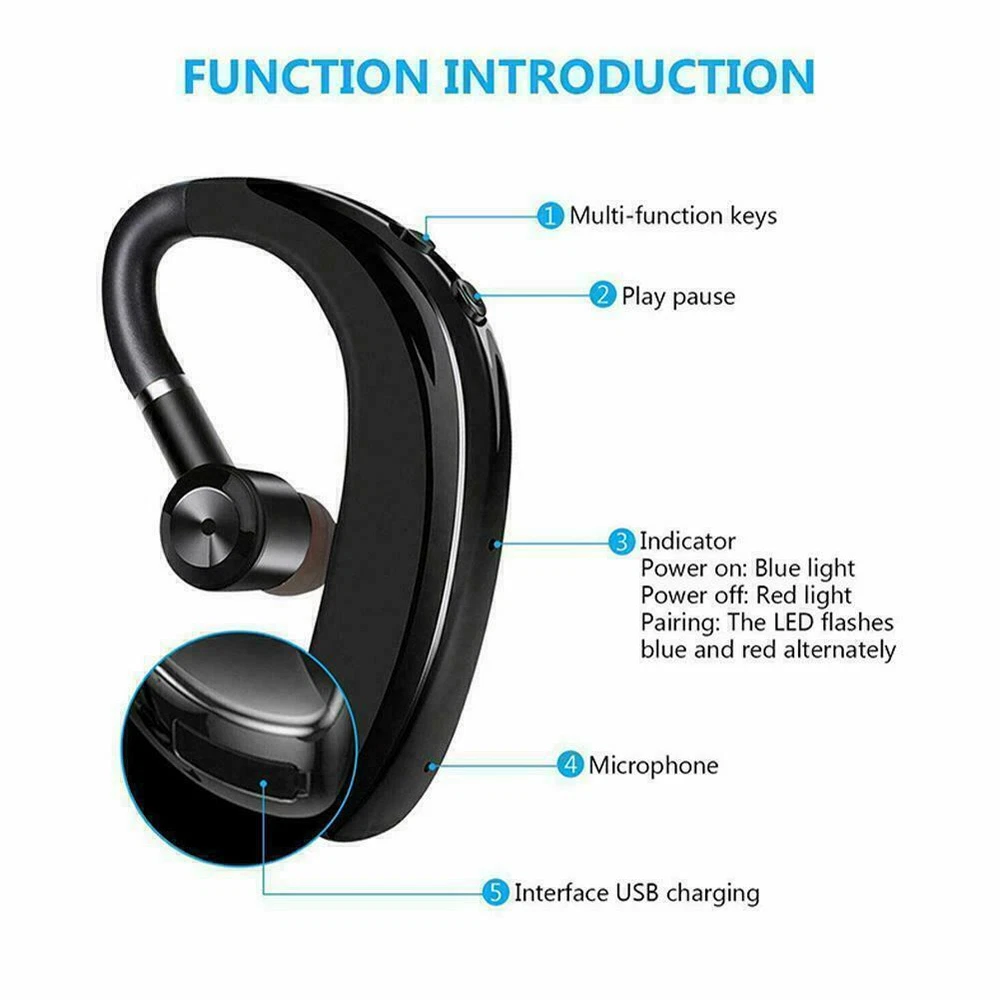 Description Description&Preview shipping&policy Description: Description: 100% brand new high quality 1.High Fidelity Sound: Intelligent noise reduction,Ensures maximum signal quality, and guarantees excellent sound quality. 2. Fast pairing in seconds, Bluetooth 5.0, automatic seconds, with headphones can be used. 3.Ultralight and comfortable design, ergonomically-shaped in-ear buds and ear loops brings comfortable and no heavy feeling even after long time wearing, the 180 degree flip boom arm turns around the corner and fit this headset in right or left ear. 4.Compatible with 99% of Bluetooth-enabled devices (such as mobile phones, tablets).up to 4hrs working time , 70hrs stand-by with 1hrs quick charge, 10 meters feet range.,used for a long time and the machine is not hot. 5.Allows you to conveniently answer calls while driving,Low battery will remind Specifications: Bluetooth version: version 5.0 Bluetooth distance: about 10 meters Standby time: 70 hours Listening to songs, talk time: about 4 hours Charging time: about 1 hour Battery type: Lithium polymer battery Battery capacity: 90MAH Support agreement HEPHSPA2DAVRCP Material: ABS+plating+food silicone ear caps Frequency: 20Hz-20KHz Impedance: 32Ω Sensitivity: 85dB/mW Waterproof rating: IPX 5 Package Included: 1*earphone 1*charging cable 1*manual 1*ear cap Notes: Due to the difference between different monitors, the pictures may not reflect the actual color of the item. Compare the detail sizes with yours, please allow 1-3cm error, due to manual measurement. Preview: Thank you for your purchase Problems? You can follow below process to chontact us. There is a time zone difference,but we will do our best to quickly response to your questions: Shipping ● We will arrange shipping for you within 24 Hours after payment cleared except the holidays. ● We always send the item to the address you give us on PAYPAL to ensure the security of the item. If you have changed your address, or want us to ship to another address, please change to the new address when you pay us with PAYPAL, otherwise we will not be responsible if the package is lost. Payments We accepts Paypal only If you have any questions about the payment,please contact us through eBay message. Import Duties In case some duty is due Upon delivery, it is your responsibility to meet that expense and this may cause delays to delivery schedule and you may have to pickup goods at the customs office. Terms & Conditions By bidding on this item,the Buyer agrees to all of the terms and conditions as outlined in this listing .please ensure to read and agree to All eBay terms and Conditions before bidding. All pictures are for illustration purpose only and Colours may vary slightly. Our store obeys all eBay Rules and Policies. Returns Policy To Return an item you must contact us and take photos of your item to clearly show any damage or unusual aspects of it. Approved returns will be subject to inspection on arrival. Items must be returned in original condition with all original packaging. All shipping and handing charges are non-refundable Return delivery costs are the responsibility of the buyer. We will cover the cost if sending replacement/repaired items. Within 7 days after receiving your products, we offers a no-hassle 7 day exchange/replace only if your items are found to be defective by manufacturer.