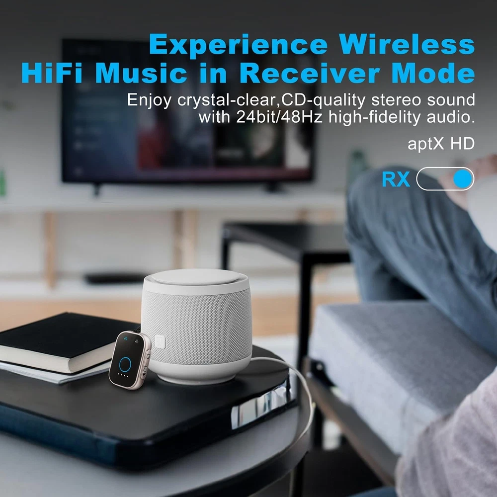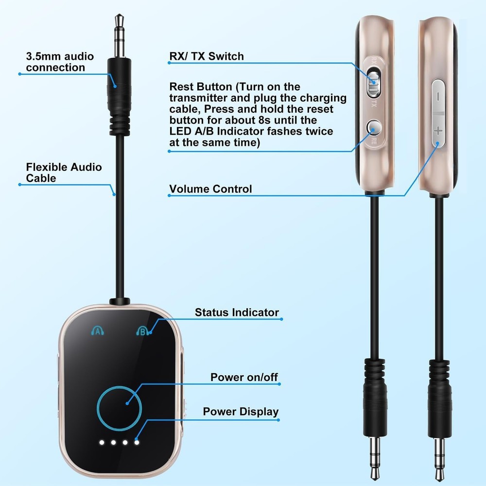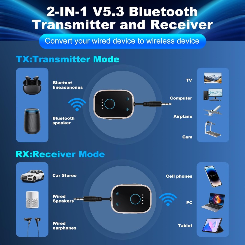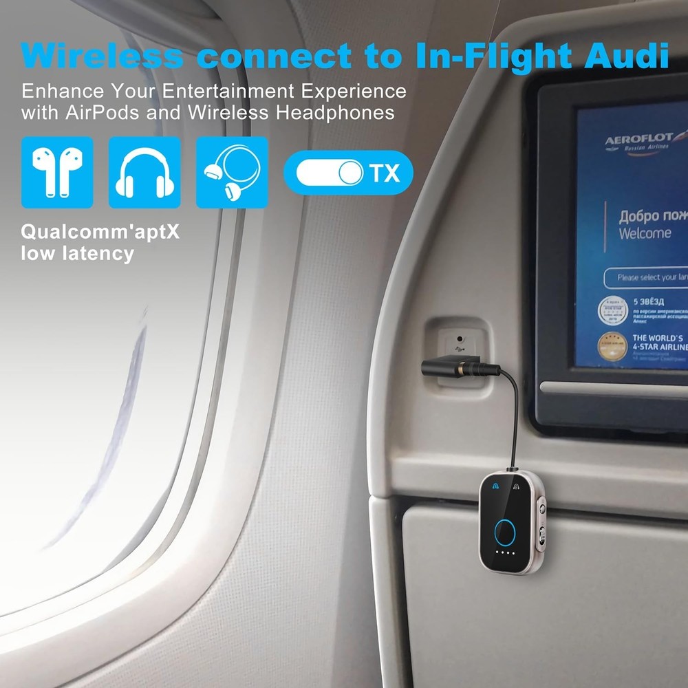 Bluetooth V5.3 Transmitter Receiver Low Latency 2-in-1 Adapter for Airplane/TV/Car/PC/MP3 Player/Home Theater/Switch/Gym Equipment,Supports up to 2 AirPods/Wireless Headphones. Product Details Special Feature: Low Latency Brand: OPINAY Connectivity Technology: AUX, Bluetooth Power Source: Battery Powered Material: Metal Product Dimensions: 2.1 x 1.4 x 0.5 inches Item Weight: 1.3 ounces Batteries: 1 Lithium Polymer batteries required. (included) Date First Available: October 28, 2024 Manufacturer: OPINAY 2-in-1 Transmitter and Receiver: OPINAY Bluetooth audio transmitter supports transmitter and receiver mode. In transmitter(TX) mode, transmit audio from non-Bluetooth TV, PC, gym/ flight equipment to Bluetooth headphones, earbuds, and Bluetooth speakers. An additional Dual 3.5mm AUX Adapter is included for improved compatibility with various airplane audio interfaces. In receiver(RX) mode, Bluetooth 5.3 chip ensures high fidelity Bluetooth audio signal for music streaming to those speakers or car/ home stereo systems that doesnt have the Bluetooth capability. Elegant appearance and powerful functionality:OPINAY 3.5mm AUX audio receiver adopts Bluetooth 5.3 technology and Qualcomm chipset,for more efficient stable connection, faster transmission and wider signal range, giving you a wonderful audio experience. Use of metal frame materials, exuding sophistication and durability.Its sleek metal construction not only enhances its aesthetic appeal but also ensures resilience against wear and tear. Easy to Use and Stable Connection: Our OPINAY Bluetooth Transmitter Receiver is quite easy to install and use. Just insert the Bluetooth adapter into the AUX port of Bluetooth receiver or transmitter, then press and hold the multifunction button for 3 seconds to power on and push the toggle button to the position you need (TX/RX),the adapter will automatically pair with and connect to your devices.There is a reset button if you ever need to pair with different devices.With a transmission distance of up to 10 meters, transmit hassle-free with no need for knotted headphone cables,lossless music playback and stable call signal, so you can have a pleasant music environment while driving. Pair with 2 Devices Simultaneously:Being able to pair with two devices simultaneously, OPINAY Bluetooth transmitter receiver can fulfill your thoughts of watching movies together with your partner using Bluetooth headphones, or to volume up music with two Bluetooth speakers playing concurrently. In TX mode, the transmitter can connect to two stereo Bluetooth speakers or stereo Bluetooth headphones at the same time; In RX mode, the receiver can connect to two Bluetooth-enabled smartphones or computers at the same time. Wide Compatibility: This 2 in 1 Wireless 3.5mm Bluetooth Adapter is compatible with devices of 3.5mm interface.With the dual 3.5mm Airplane Headphone Adapter included, the OPINAY Bluetooth transmitter receiver is compatible with any aircraft, regardless of the audio output jack type. It also works seamlessly with any device that outputs audio via AUX, such as tablets, PCs, gym equipment, and more. Moreover, it can connect to a wide range of Bluetooth headphones or earbuds. Please note: That after receiving the product please charge the product for a sufficient period of time as the product may lose its charge in transit.The charging standard of the product is 5V1A. Do not use a high current adapter to charge the product.Quickly recharge with the included Type-C cable, so you can keep enjoying your music and calls.