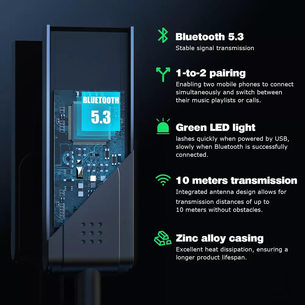 About this item: Add Bluetooth to your aux devices - LOKUKA USB to 3.5mm Bluetooth car audio adapter is easy to use. Simply connect it to the Aux port of your car stereo, speaker, amplifier, headphone, or any other audio device, and connect the USB port to a USB charging jack to power the Bluetooth. Then turn on the phone Bluetooth and connect the "YP04". The green light flashes quickly when it's USB-powered and turns into a slow flash when the Bluetooth "YP04" connects successfully. LOKUKA aux Bluetooth adapter supports music, hands-free calls, voice navigation, etc. Bluetooth 5.3, Stable Connection - This aux Bluetooth adapter for car uses Bluetooth 5.3 technology, which offers a stable connection and no latency or lag. You can enjoy uninterrupted music streaming without any stuttering or buffering with this 3.5mm bluetooth adapter. The built-in antenna design can realize 0-10 miles of long-distance transmissions. Durable Design - With a 3.5mm audio output and high-fidelity transmission via enameled copper wire cores, this bluetooth car kits delivers high-quality sound with no noise or current sound, ensuring that you enjoy a crystal-clear audio experience. Also support mobile phone music and call functions, with car echo cancellation. Its compact and portable design makes it perfect for travel, and the zinc alloy casing ensures that it's durable and long-lasting. 1-to-2 Dual Connection - This car Bluetooth adapter has a 1-to-2 feature that allows you to connect two phones simultaneously, making it easier to share music and switch between two devices. It also has an automatic reconnection feature, ensuring that it automatically connects to your phone when you return to your car. Buyer Note: If you are satisfied with our service, we appreciate you leaving us a positive feedback and 5 star rating review! Your opinion is important to the success of our business. If you are not satisfied with the product or have not received the product for more than 35 days, please contact us to resolve, we will do our best to solve. We are sure to come up with a satisfactory solution. Please contact us first before leaving cold feedback or good feedback of 1-3 stars and opening the case. We'll do our best to solve your problem. Because we believe that everything can be solved through communication. Thank you very much!