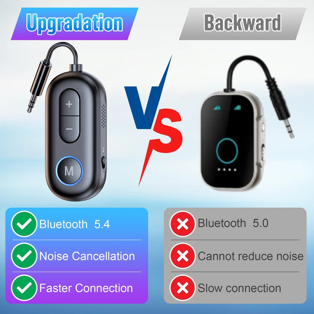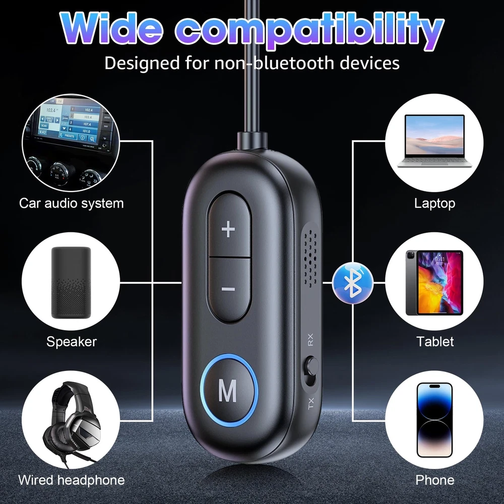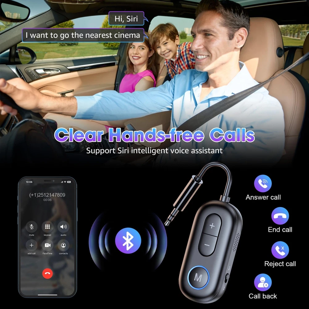 【2 in 1 Bluetooth Transmitter and Receiver】Bluetooth aux adapter is equipped with the latest Bluetooth 5.4 technology, 3.5mm wireless adapter supports both bluetooth transmitting and receiving, namely TX and RX mode, which can achieve 33 feet (10 meters) long-distance transmission and stable connection with less sound quality loss. Just pair it with your phone and start listening to your favorite music! And The Bluetooth adapter supports charging while using, it is your good partner for travel 【Noise Reduction & Hi-Fi Stereo】Upgraded CVC8.0 technology and built-in filter IC effectively filters out more road noise, current sound, Bluetooth car adapter is equipped with enhanced microphones working in tandem to collect your voice from 360°, and ensure we much brighter bigger sound while calling. Say goodbye to tangled aux cords! This Bluetooth adapter turns your car's aux port into a wireless audio hub. Made music in the car so easy. 【Instant Setup, Plug and Play】5.4 bluetooth aux receiver when you turn on the switch, it will automatically enter the fast pairing mode, which is convenient for you to use. With a built-in microphone, easy to answer or hang up, pause or play music, and drive safely. Wireless adapter can pair with two Bluetooth enabled devices simultaneously which allows you to play music from either your phone or tablet, and you won't miss any calls while streaming music 【Instant Setup, Plug and Play】5.4 bluetooth aux receiver when you turn on the switch, it will automatically enter the fast pairing mode, which is convenient for you to use. With a built-in microphone, easy to answer or hang up, pause or play music, and drive safely. Wireless adapter can pair with two Bluetooth enabled devices simultaneously which allows you to play music from either your phone or tablet, and you won't miss any calls while streaming music 【Multifunction Button】No complicated buttons, just press the power button to answer or hang up, play or pause music, operate without looking at your phone, this car AUX adapter allows you to drive safely. You can also long press the volume button "+" or "-" for about 1.5 S to easily switch between Next/Previous Song. Bluetooth audio receiver can be connected to non-Bluetooth devices such as car, home stereos, wired speakers, headphones, adding to its convenience and versatility for your needs