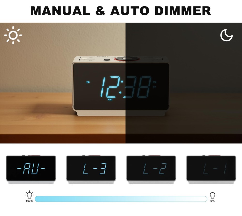BIG BRIGHT DISPLAY & FM RADIO: Large 1.4-inch ice blue LED display with no flashing light makes the time easy to read from afar. FM Radio with 20 programmable preset stations. External FM wire antenna gives better radio reception. DUAL ALARM:This digital dual alarm is designed to cater to your unique scheduling needs. Easily set 2 distinct alarms with radio or buzzer wake-up and 15-level volume controls. Choose from 4 week modes: every day, single day only, weekdays only, or weekends only. Features a 9-minute snooze function, repeatable up to 6 times to ensure you wake up on time. MANUAL / AUTO FM RADIO: Easy Tuning FM Radio with 20 programmable preset stations. Choose a station from 87.5MHz to 108.0MHz as you want and listen to your favorite FM radio station. External FM wire antenna gives better radio reception. Also, it allows you to set a sleep timer from 10 to 90 minutes when playing the radio and can automatically shut down by itself. ULTRA CLEAR DISPLAY: The alarm clock's 1.4-inch ice blue LED display screen shows the time in large and ultra-clear numbers, makes it easy to read from across the room at any angle. 4 levels manual and auto brightness allows you to see the time clearly anytime. 2-level warm night light creates a warm feeling at night without disturbing your sleep. TIME DESIGN: This versatile alarm clock radio combines functionality with convenience, easy to set time, date, and year. You can select 12/24 hour display or turn DST on/off according to your preference. BLUETOOTH : Our alarm clock offers seamless Bluetooth connectivity with your smartphone. The device also features a headphone jack, so you can simply plug in your headphones and enjoy your music or radio without any external interference. CONVENIENT AND USEFUL ADDITIONAL FEATURES: Memory function prevents power failure or AC line being disconnected by mistake, you will never have to worry about resetting your alarm clock. The USB charging port is specifically designed for charging your mobile device.